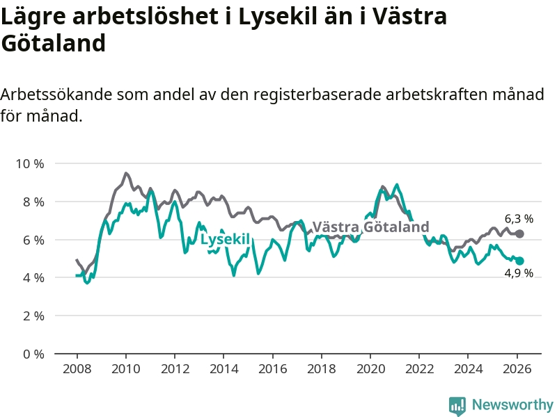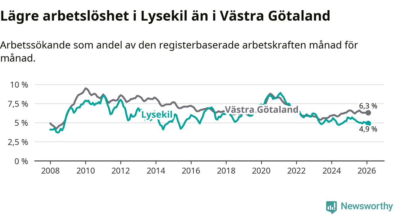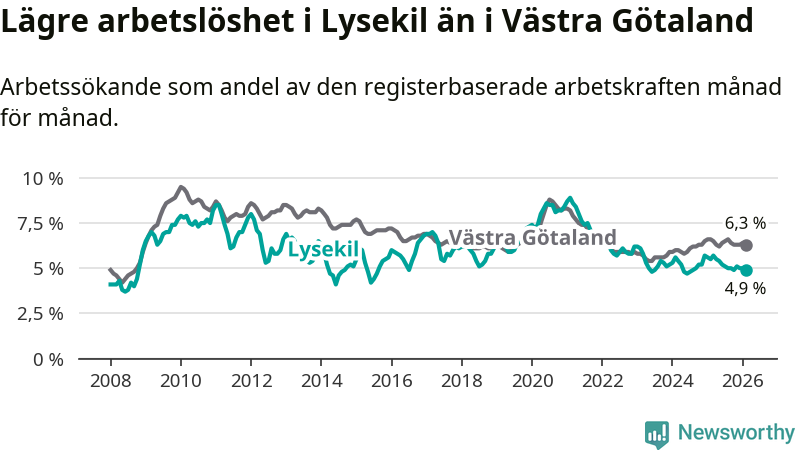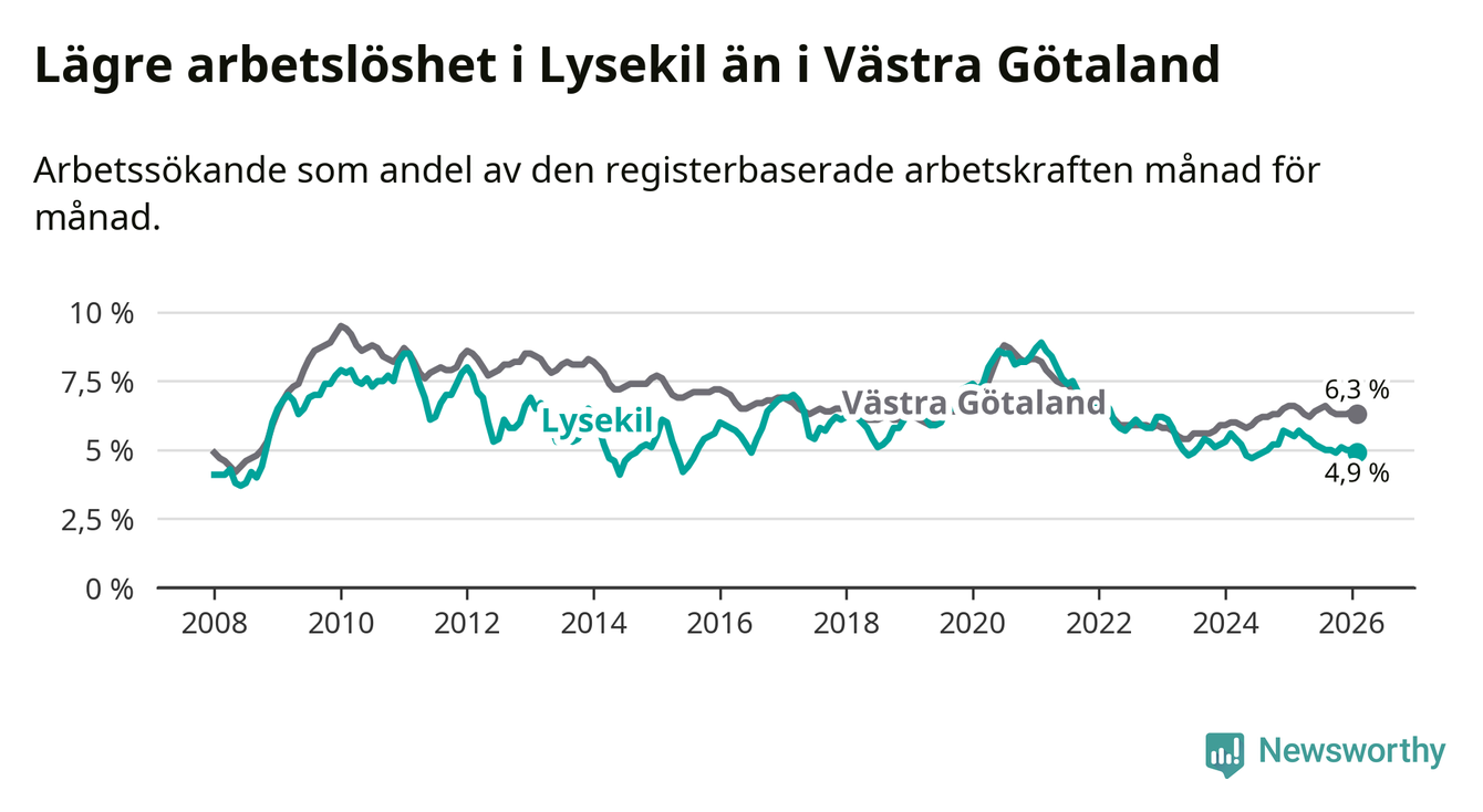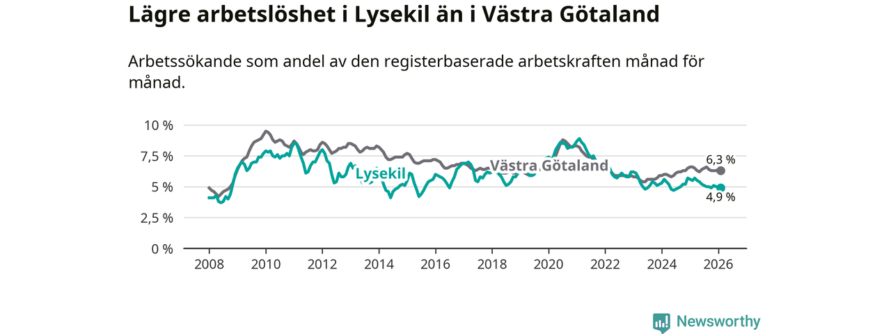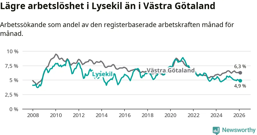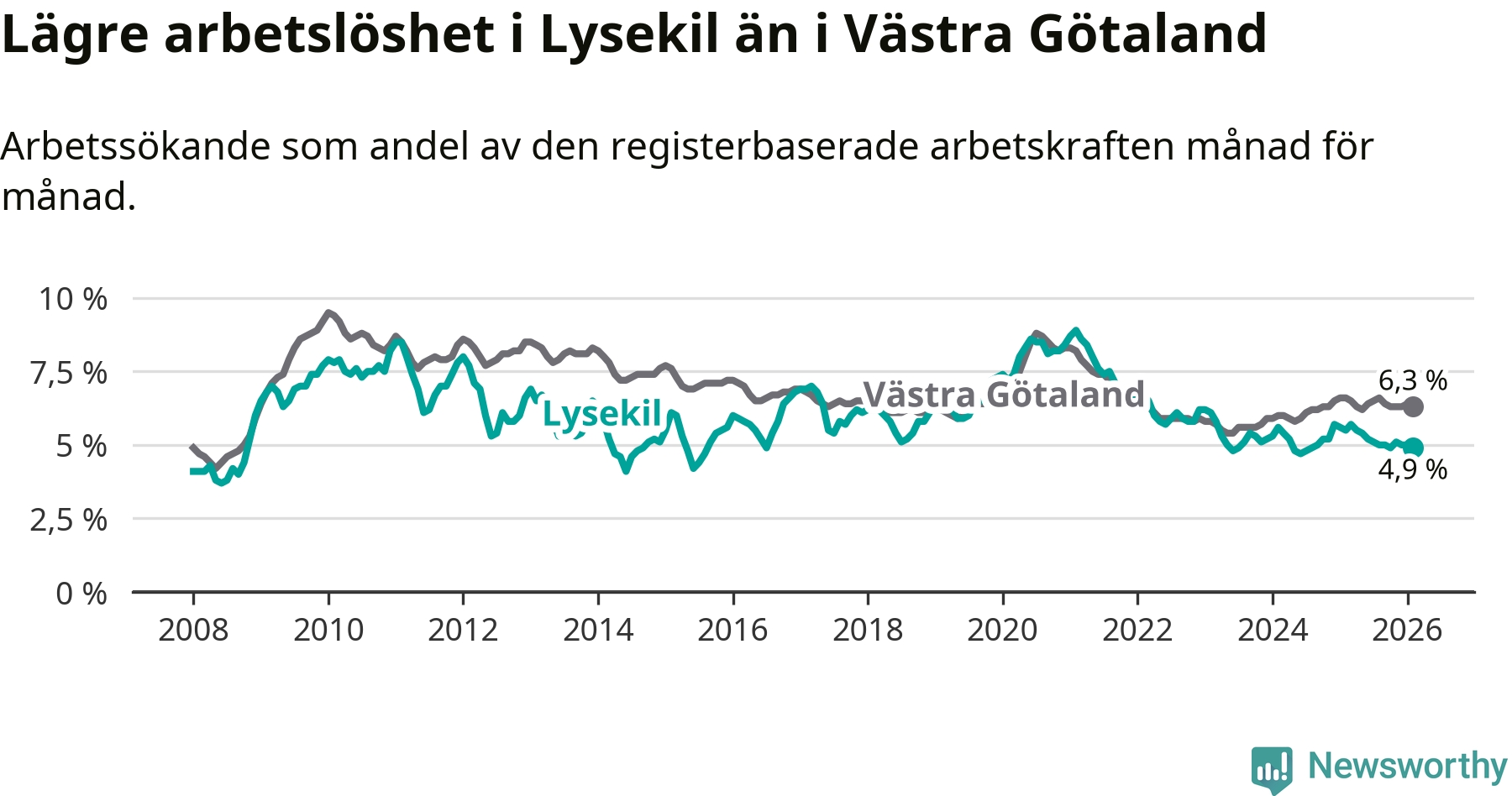 Under februari månad rapporterade Lysekils kommun en total arbetslöshet på 4,9 procent. Det är en minskning jämfört med samma tidpunkt i fjol (−0,6 procentenheter). Även i Västra Götalands län sjunker arbetslösheten .