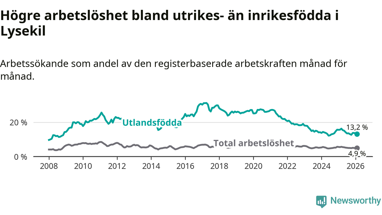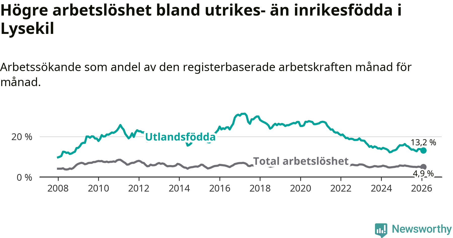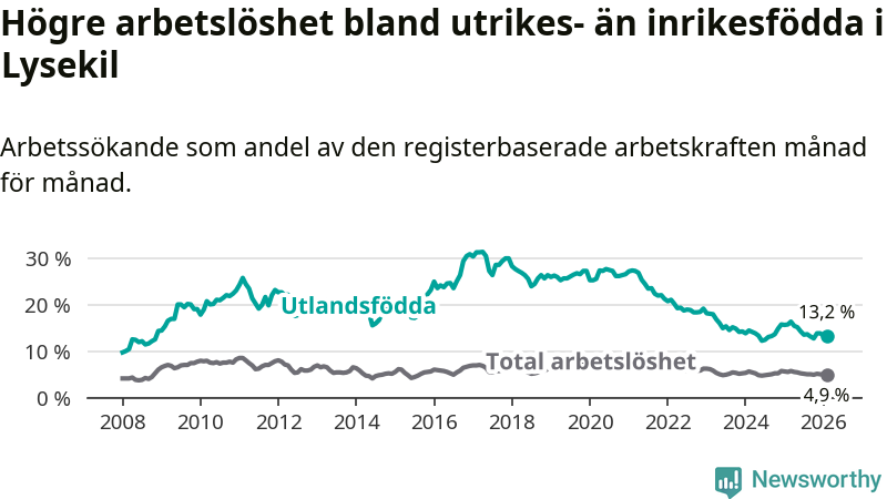 Arbetslösheten bland utlandsfödda var 13,2 procent i Lysekil under februari månad, motsvarande 142 av 1 076 personer. Det är 2,5 procentenheter färre än vid samma tidpunkt i fjol (−22 om man räknar personer). Därmed är de utlandsföddas arbetslöshet lägre än vid samma tidpunkt i fjol för sjätte månaden i följd.