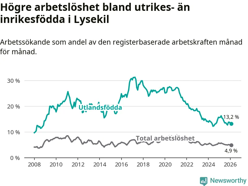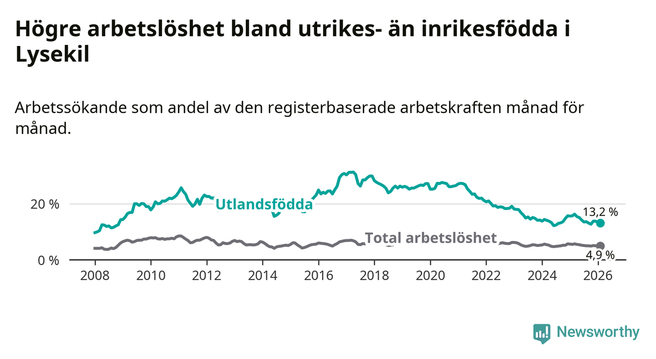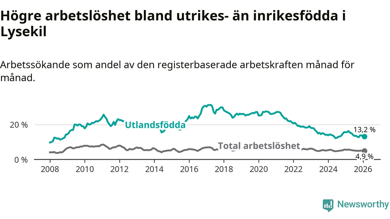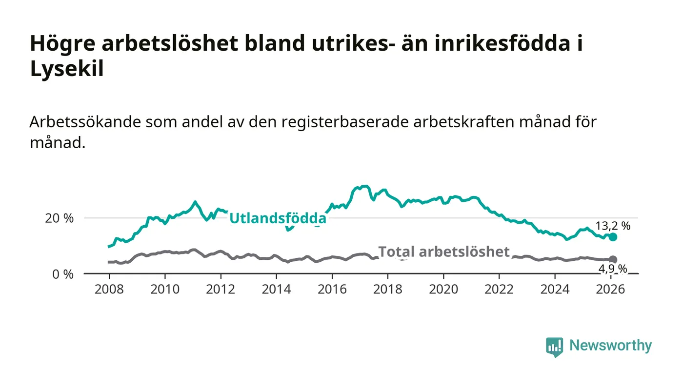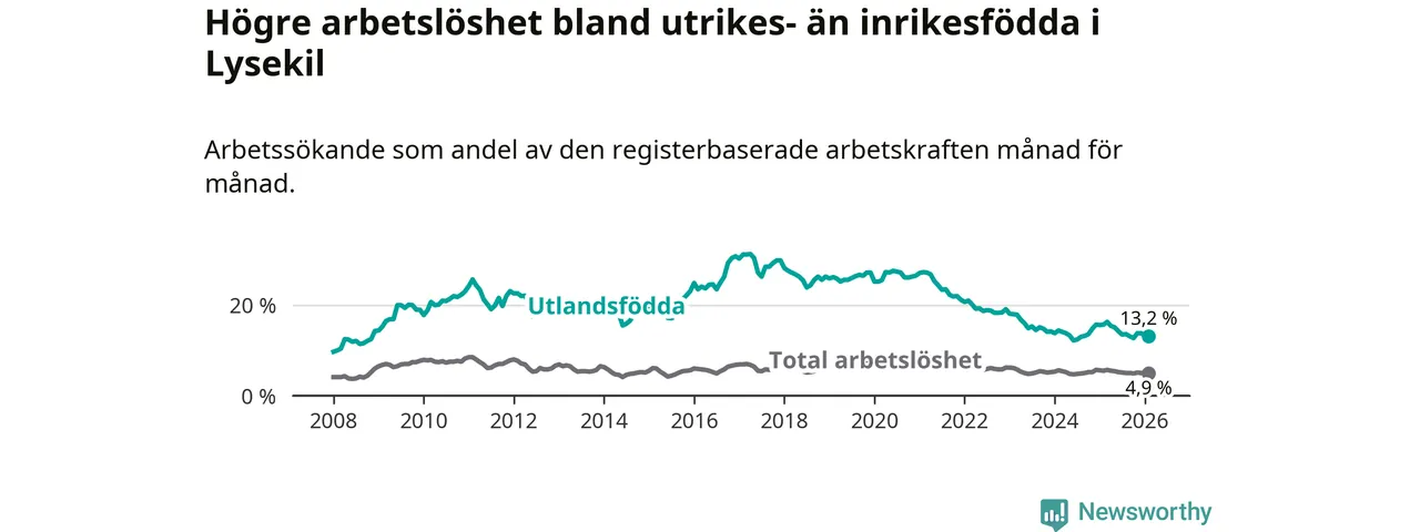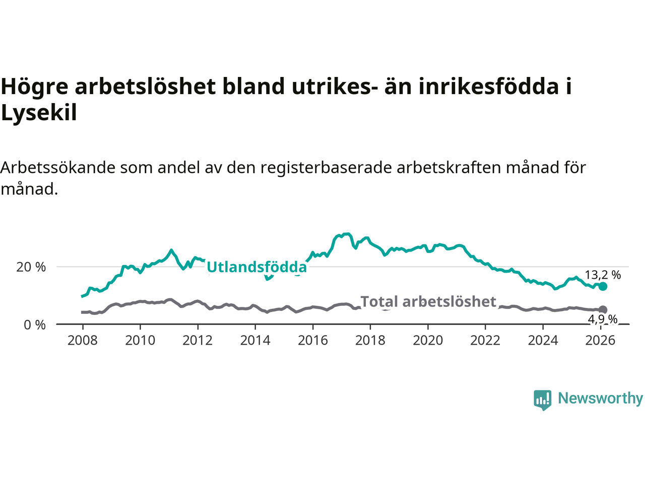 Skillnaden i arbetslöshet mellan utrikesfödda och hela befolkningen är 8,3 procentenheter i Lysekil. Det är en betydligt mindre skillnad än för ett år sedan (−1,9 procentenheter).