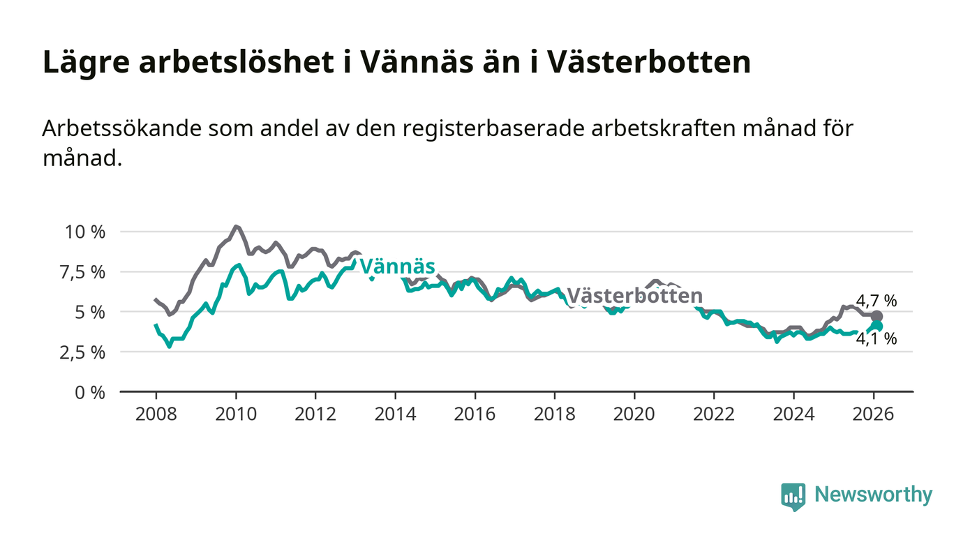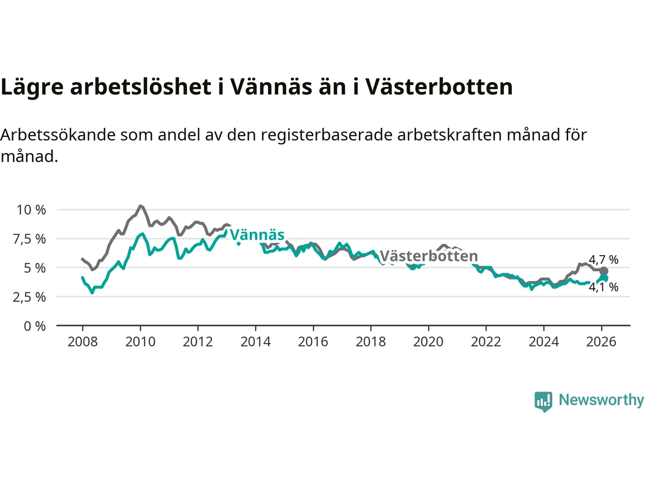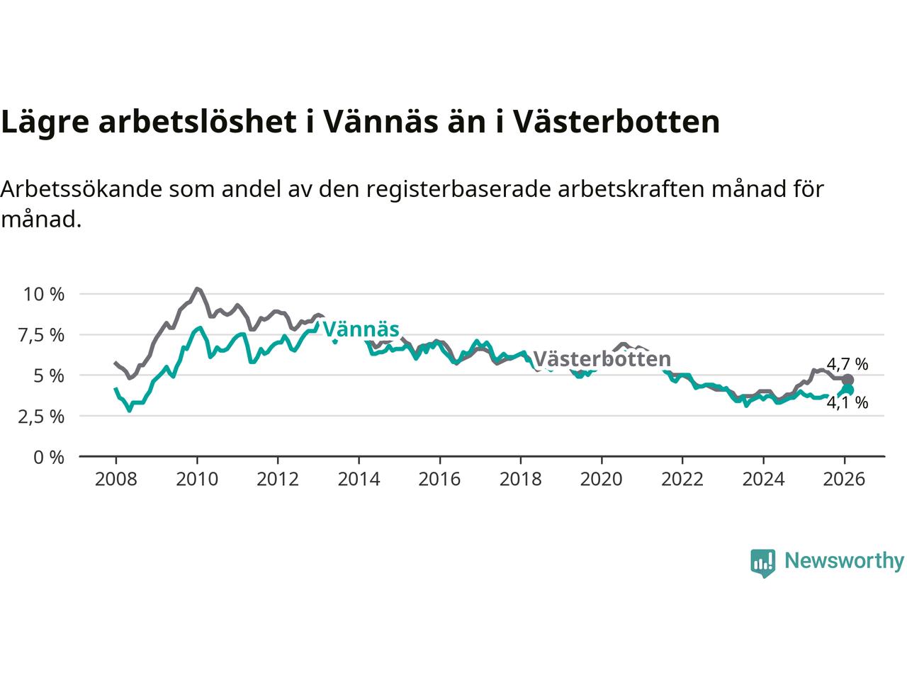Även om arbetslösheten i Vännäs alltså ökar, så ligger den fortfarande under snittet i hela Västerbottens län (4,1 procent i kommunen, jämfört med 4,7 procent i hela länet). Sorsele har den lägsta arbetslösheten i länet (2,2 procent), medan Skellefteå har den högsta (6,0 procent). För att Vännäs skulle komma ner i samma arbetslöshetsnivå som Sorsele skulle 86 personer behöva sysselsättas.