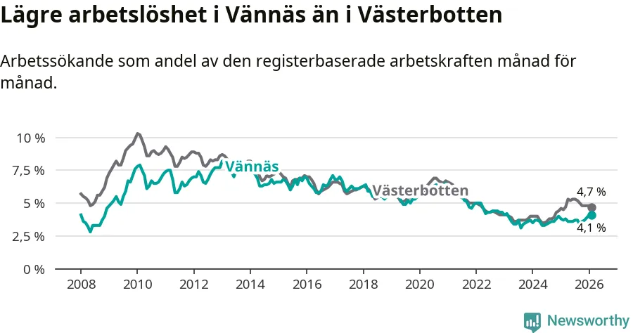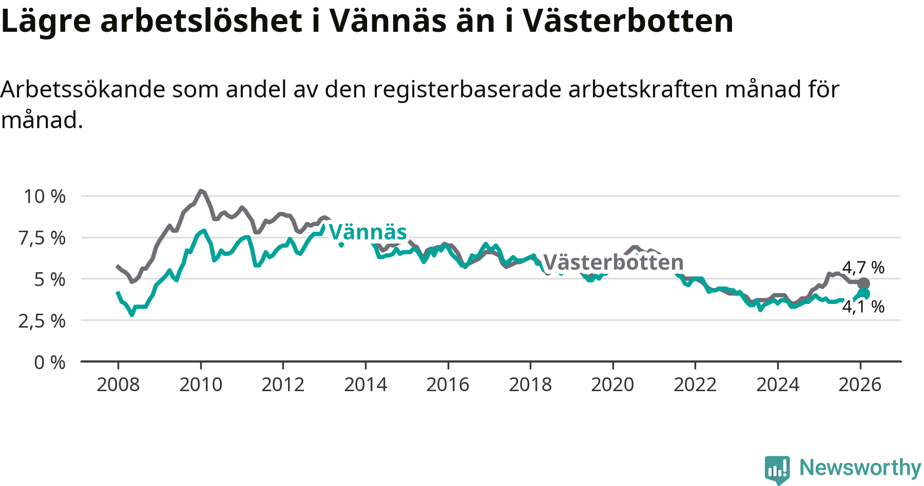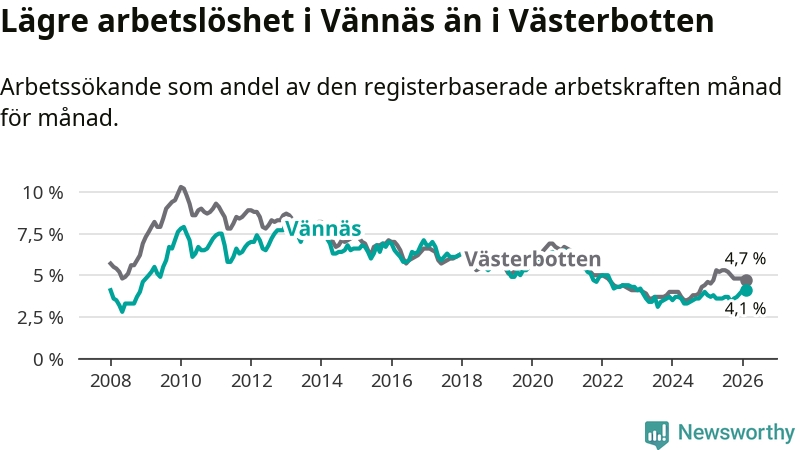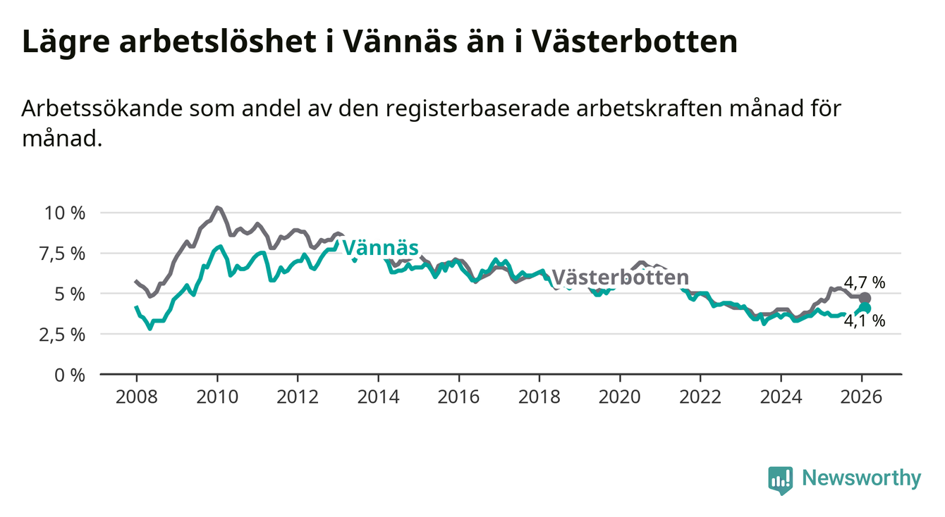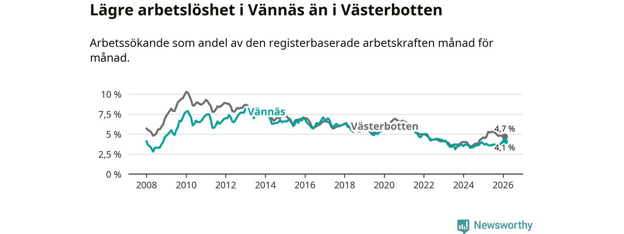 Även om arbetslösheten i Vännäs alltså ökar, så ligger den fortfarande under snittet i hela Västerbottens län (4,1 procent i kommunen, jämfört med 4,7 procent i hela länet). Sorsele har den lägsta arbetslösheten i länet (2,2 procent), medan Skellefteå har den högsta (6,0 procent). För att Vännäs skulle komma ner i samma arbetslöshetsnivå som Sorsele skulle 86 personer behöva sysselsättas.