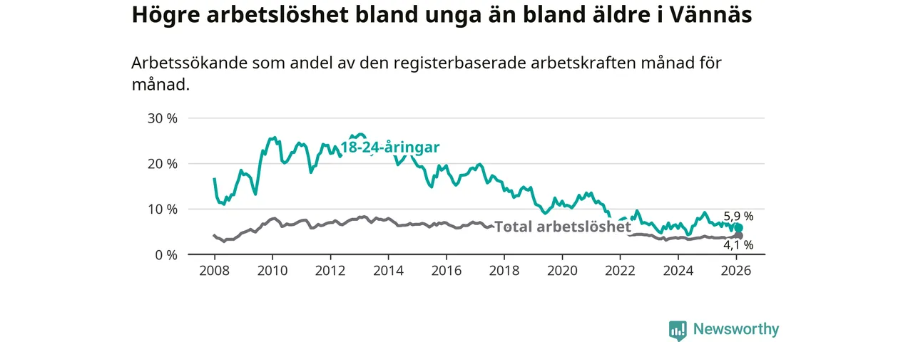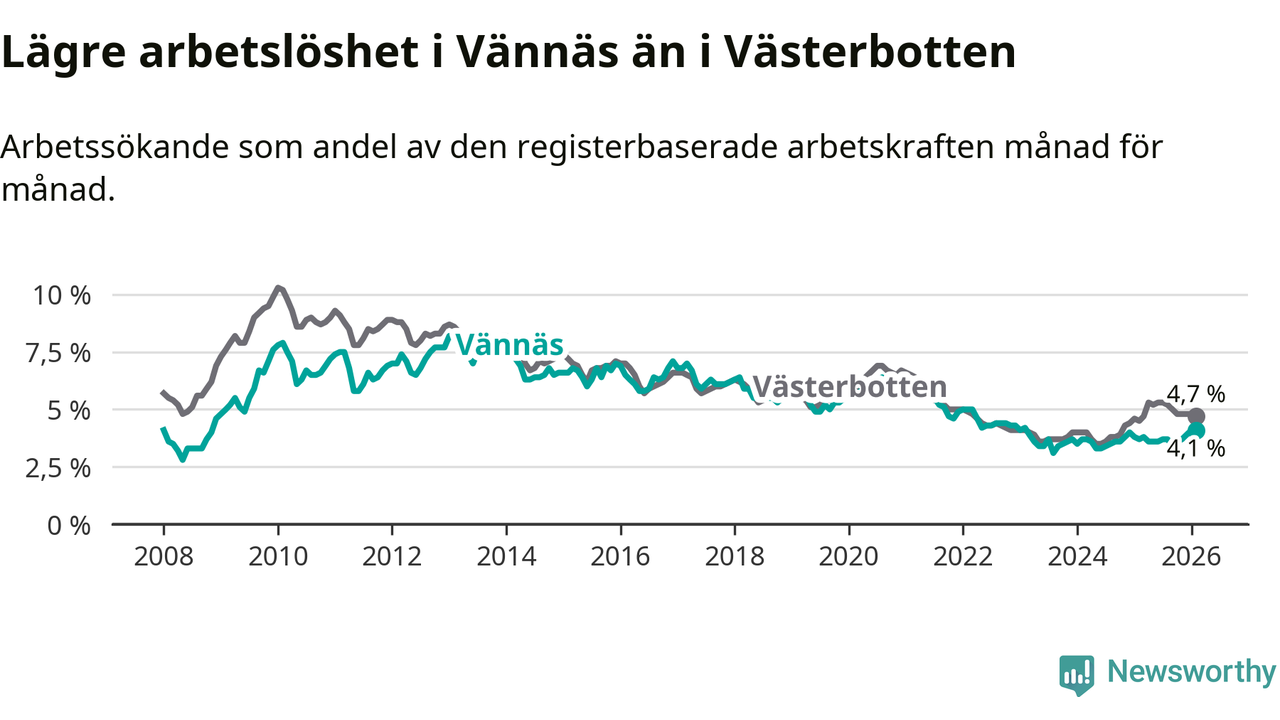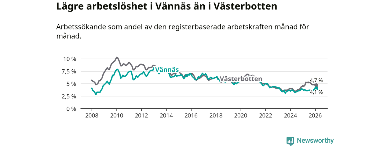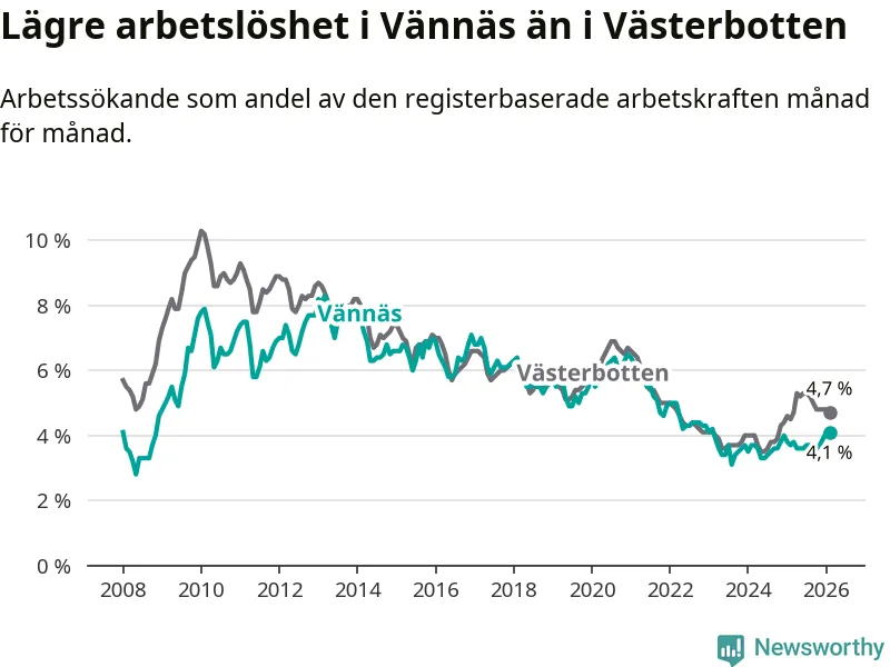 Vännäs går därmed mot strömmen i förhållande till andra kommuner i Västerbottens län. I de flesta andra kommuner i länet går arbetslösheten nedåt. Störst är minskningen i Åsele, där arbetslösheten sjunker med 1,2 procentenheter. I tabellen längre ner ser du utvecklingen i samtliga kommuner i länet.