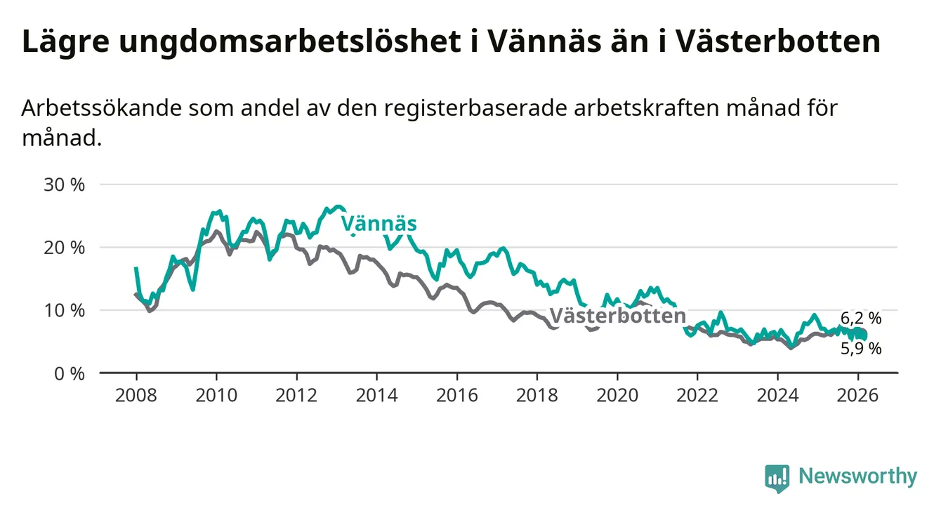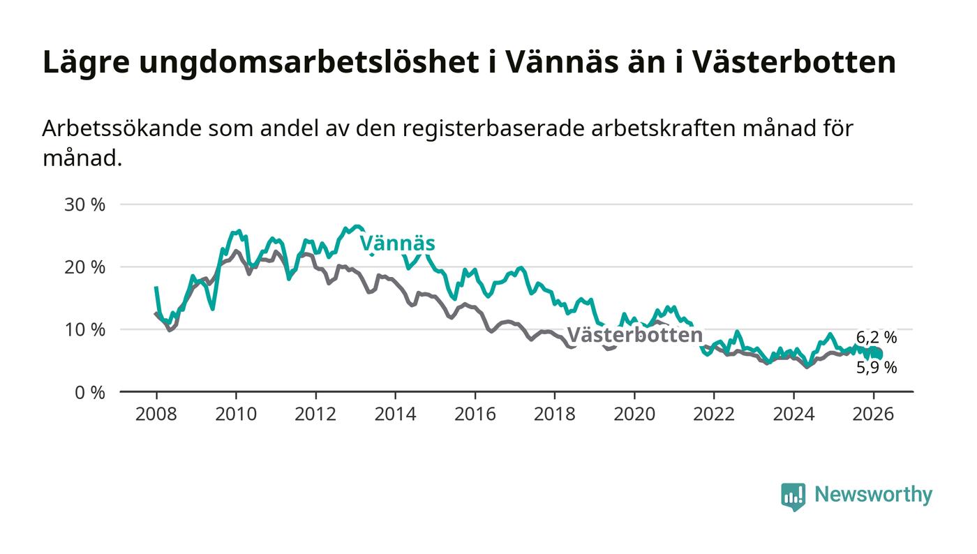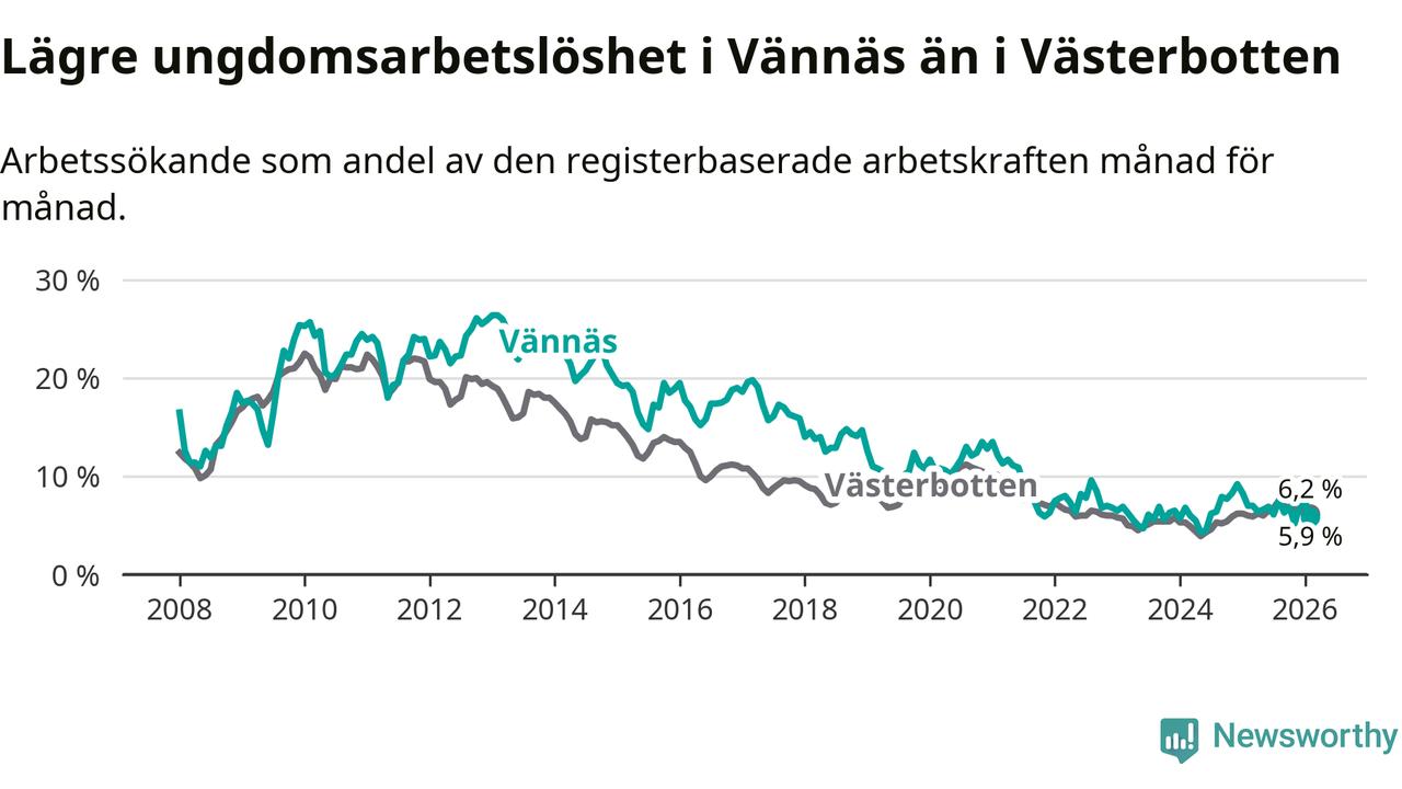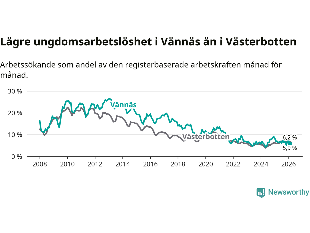 Precis som den totala arbetslösheten ligger ungdomsarbetslösheten i Vännäs lägre än i Västerbotten som helhet. Skillnaden mellan kommunen och länet är 0,3 procentenheter.