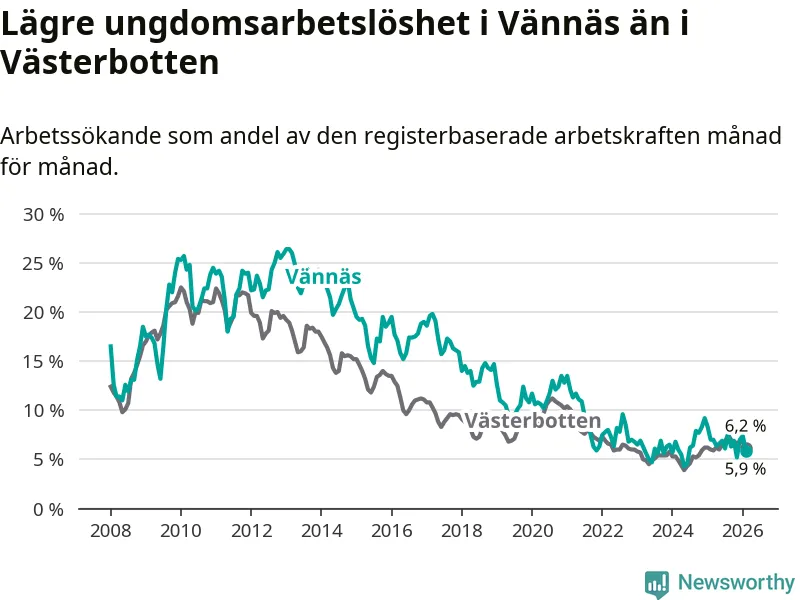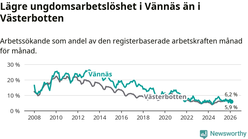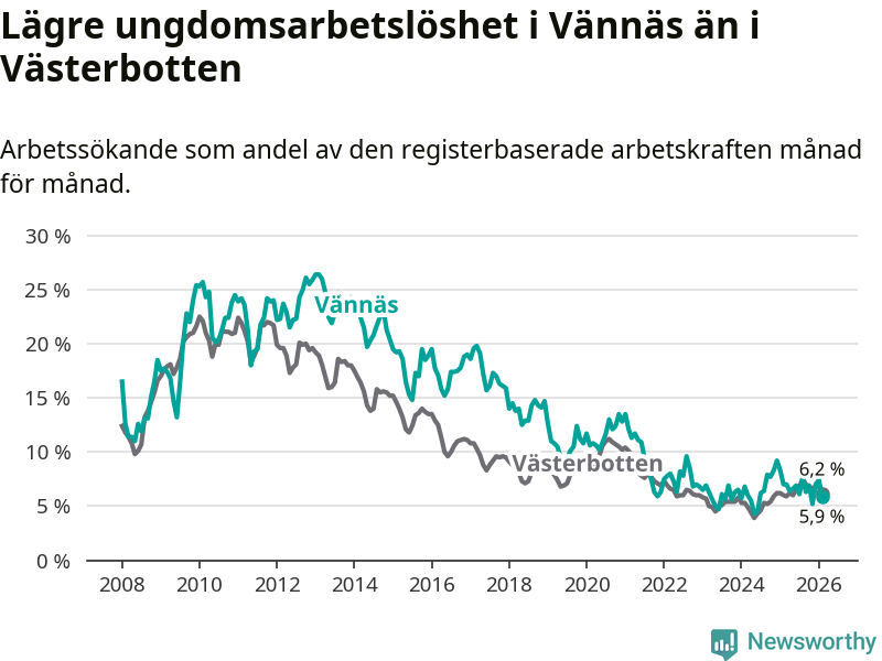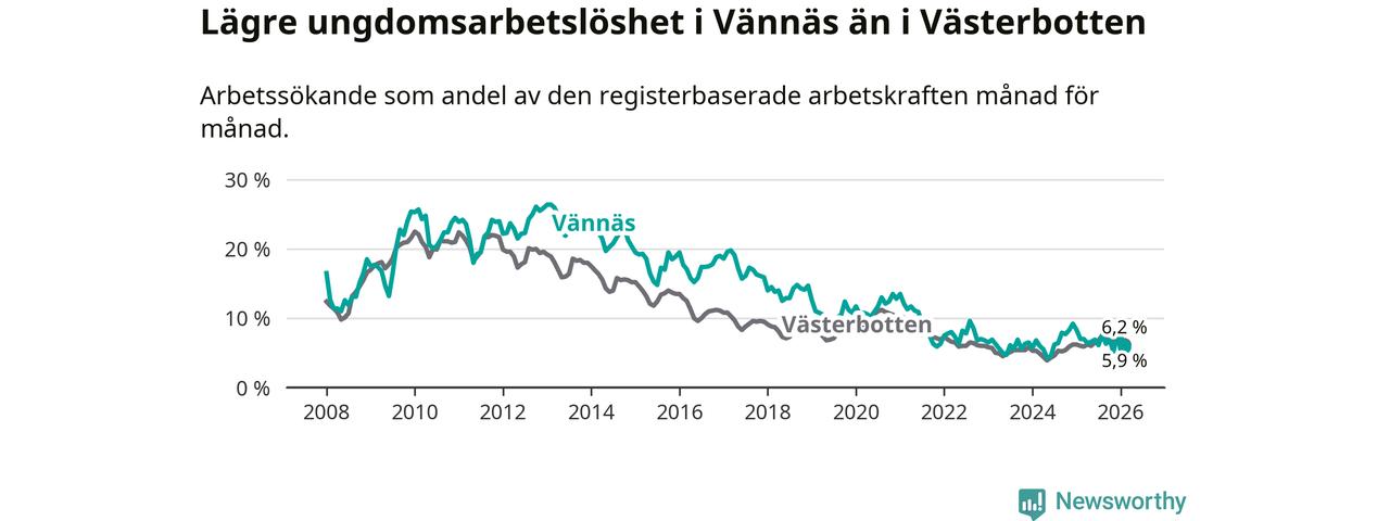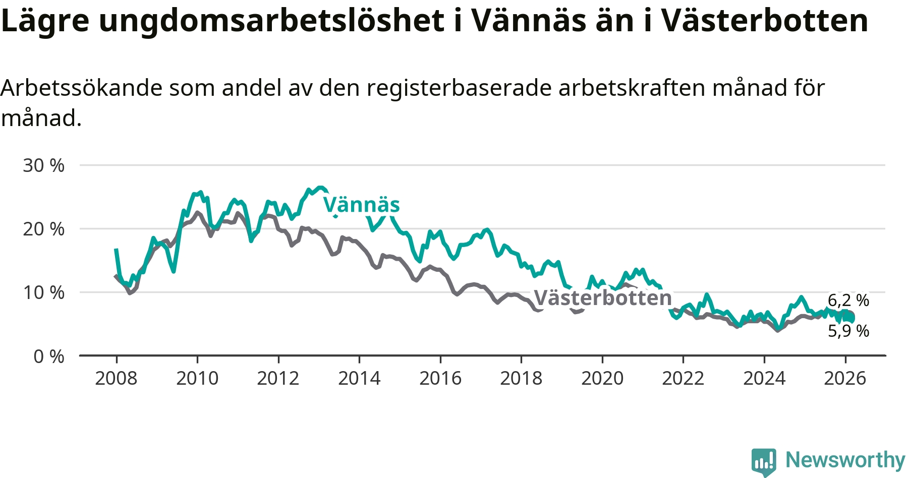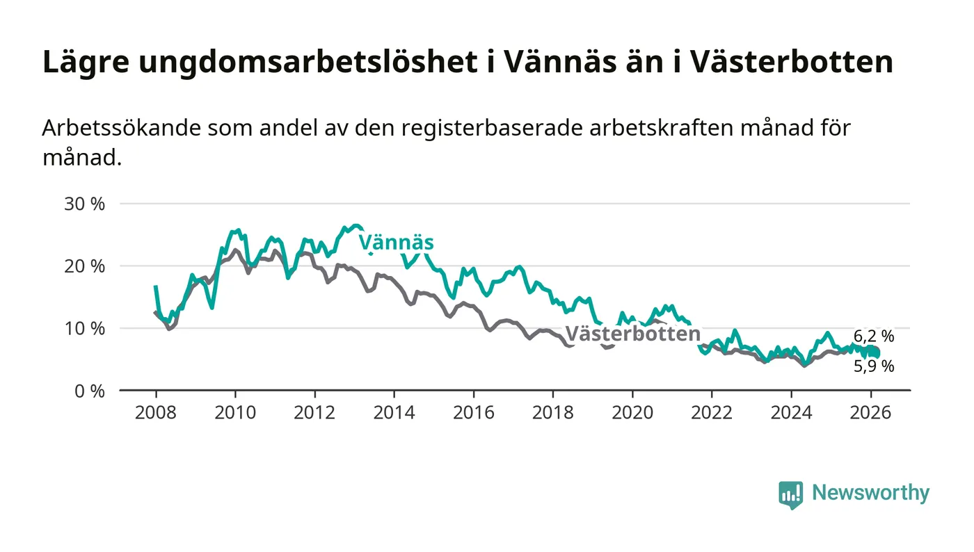 Precis som den totala arbetslösheten ligger ungdomsarbetslösheten i Vännäs lägre än i Västerbotten som helhet. Skillnaden mellan kommunen och länet är 0,3 procentenheter.