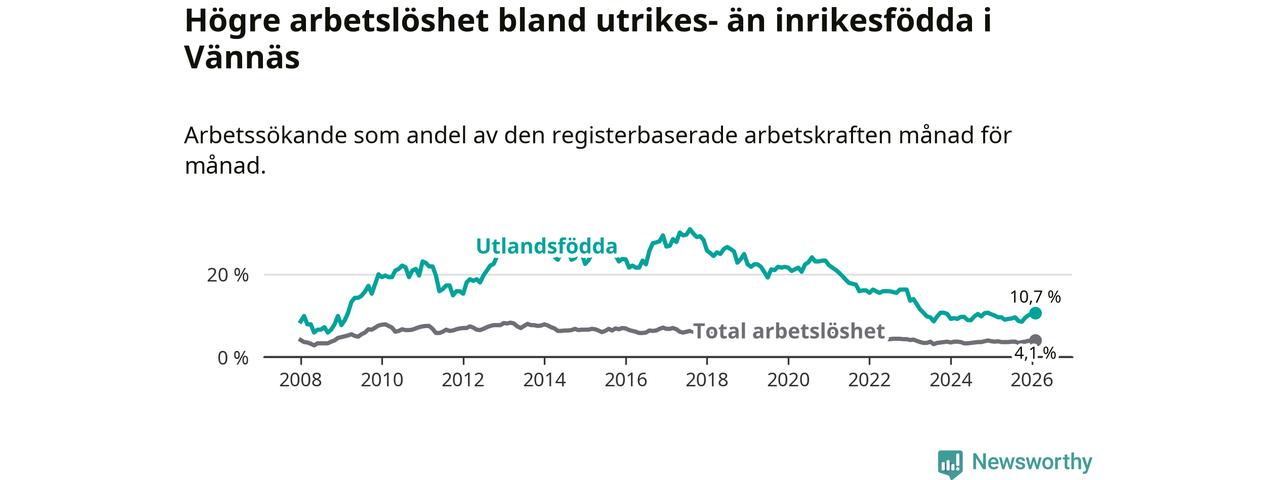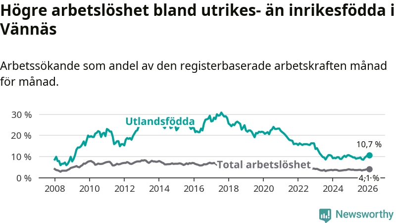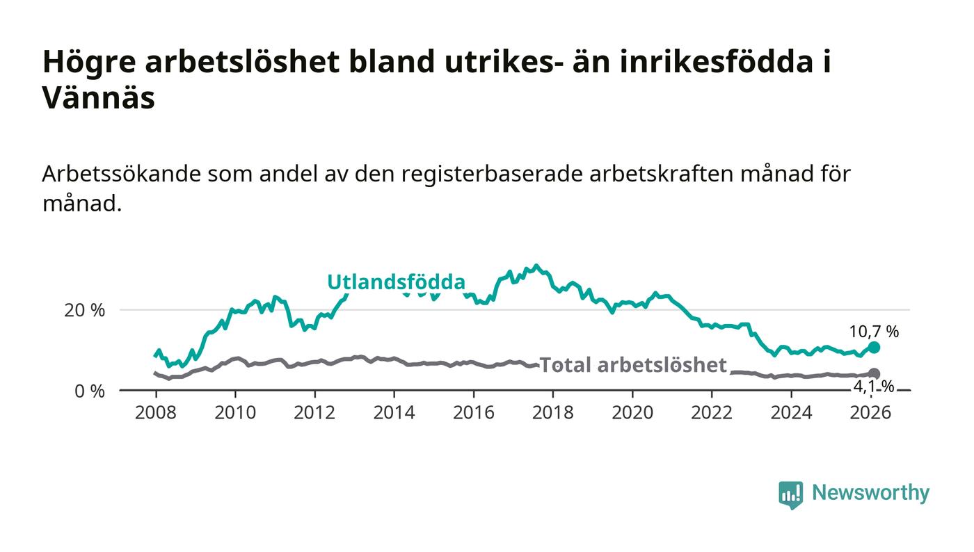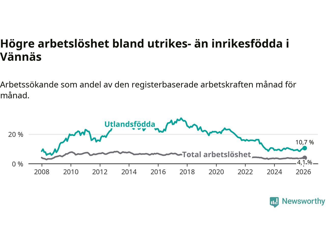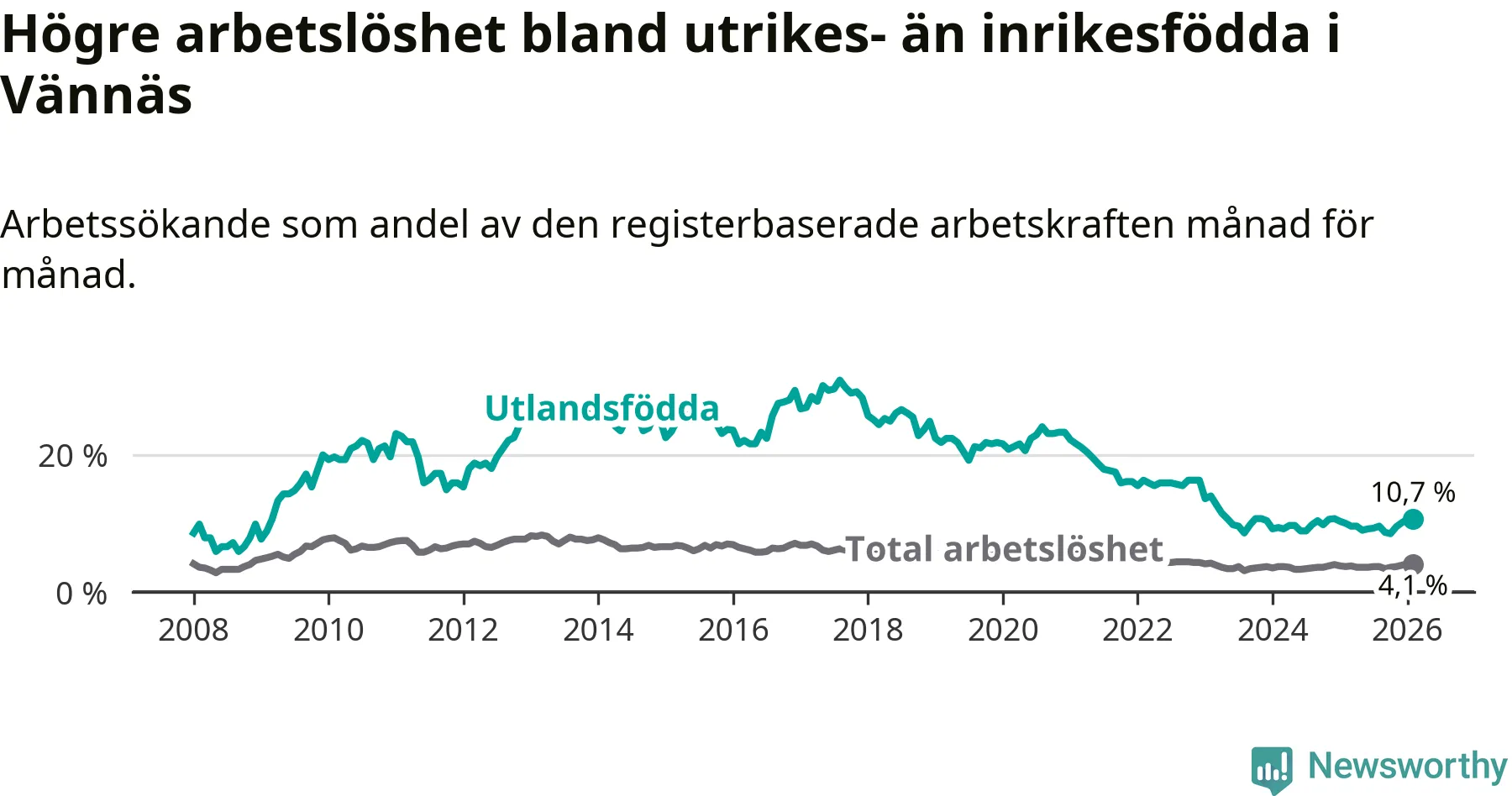 Arbetslösheten bland utlandsfödda var 10,7 procent i Vännäs under februari månad, motsvarande 55 av 514 personer. Det är 0,7 procentenheter fler än vid samma tidpunkt i fjol (+3 om man räknar personer).