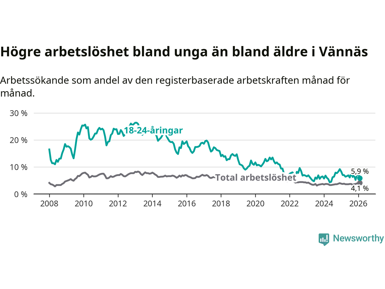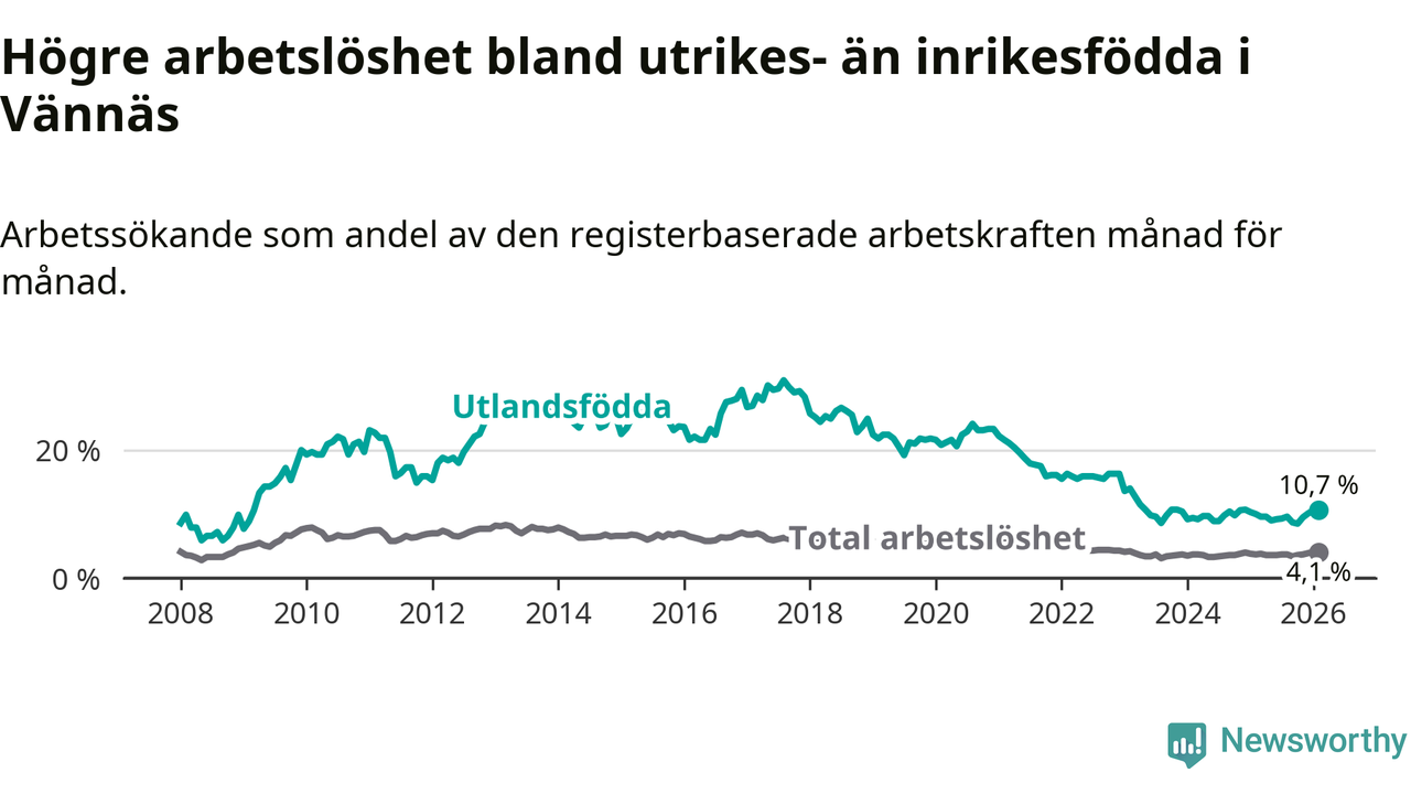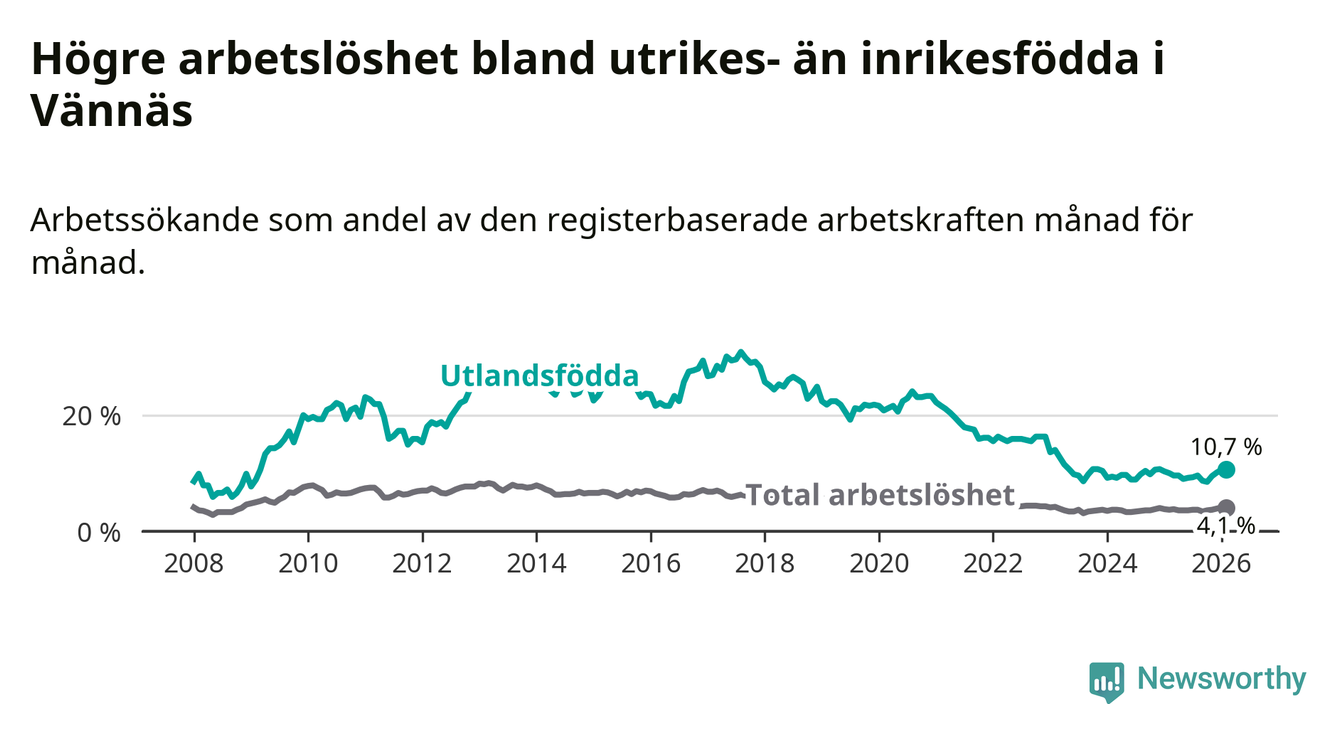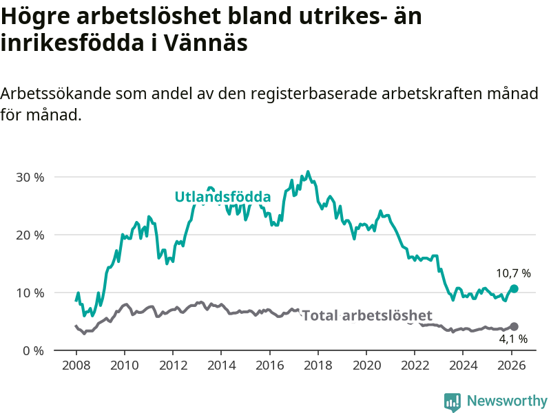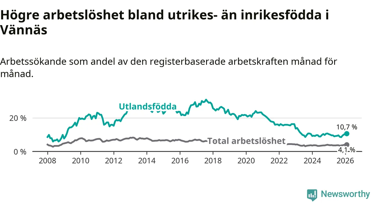 Arbetslösheten bland utlandsfödda var 10,7 procent i Vännäs under februari månad, motsvarande 55 av 514 personer. Det är 0,7 procentenheter fler än vid samma tidpunkt i fjol (+3 om man räknar personer).