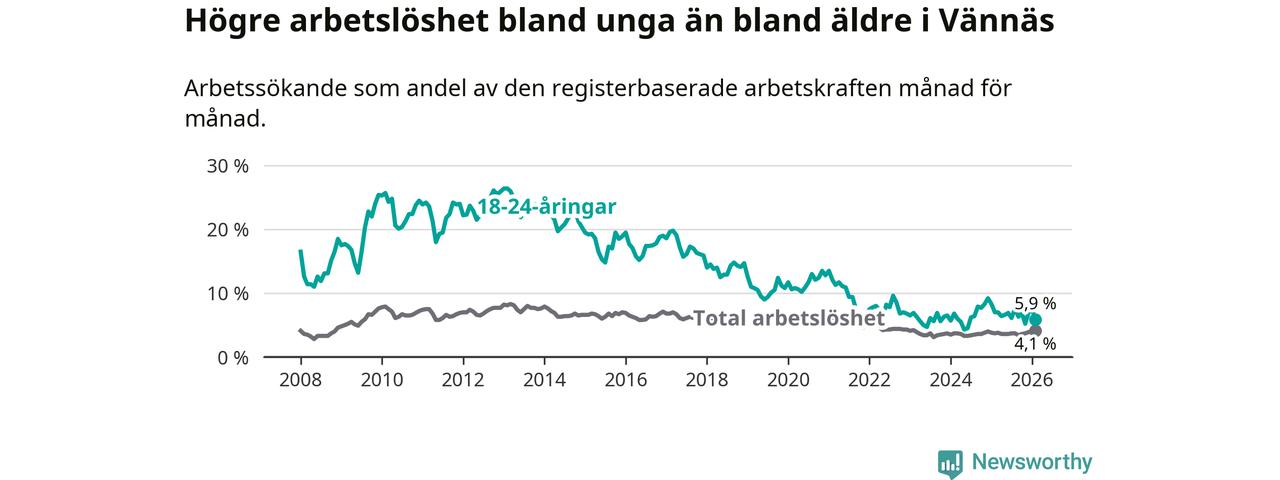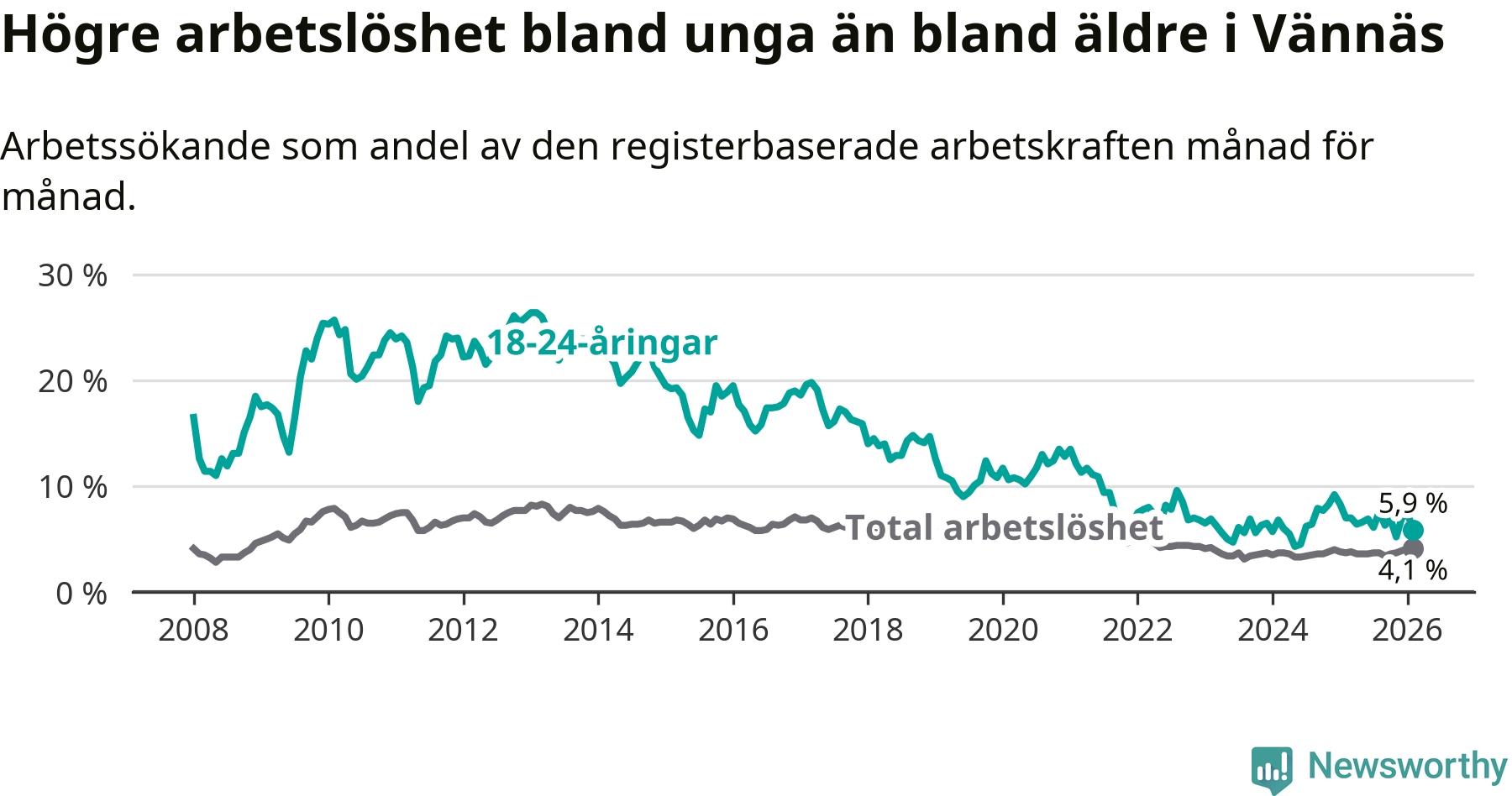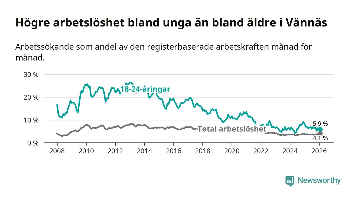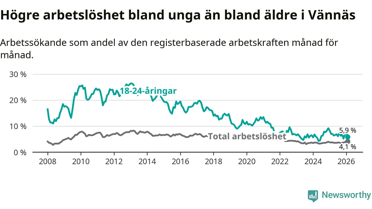 Arbetslösheten bland utlandsfödda var 10,7 procent i Vännäs under februari månad, motsvarande 55 av 514 personer. Det är 0,7 procentenheter fler än vid samma tidpunkt i fjol (+3 om man räknar personer).
