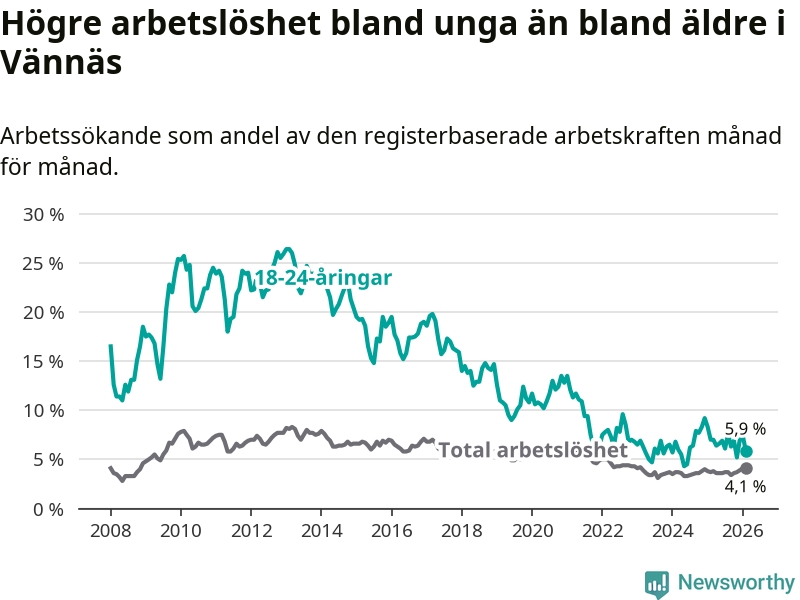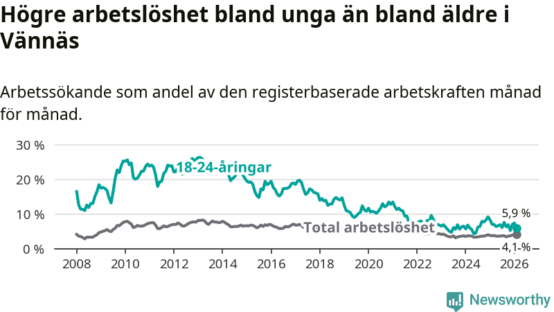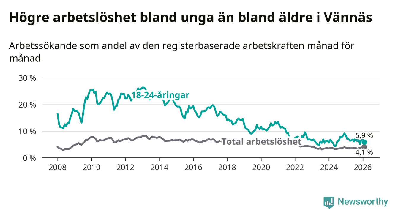 Till skillnad från den totala arbetslösheten sjunker arbetslösheten bland unga (−1,1 procentenheter). I februari var 5,9 procent av 18–24-åringarna inskrivna som arbetssökande (motsvarande 27 personer). Mäter vi antalet inskrivna ser vi en minskning med sex personer på ett års sikt.
