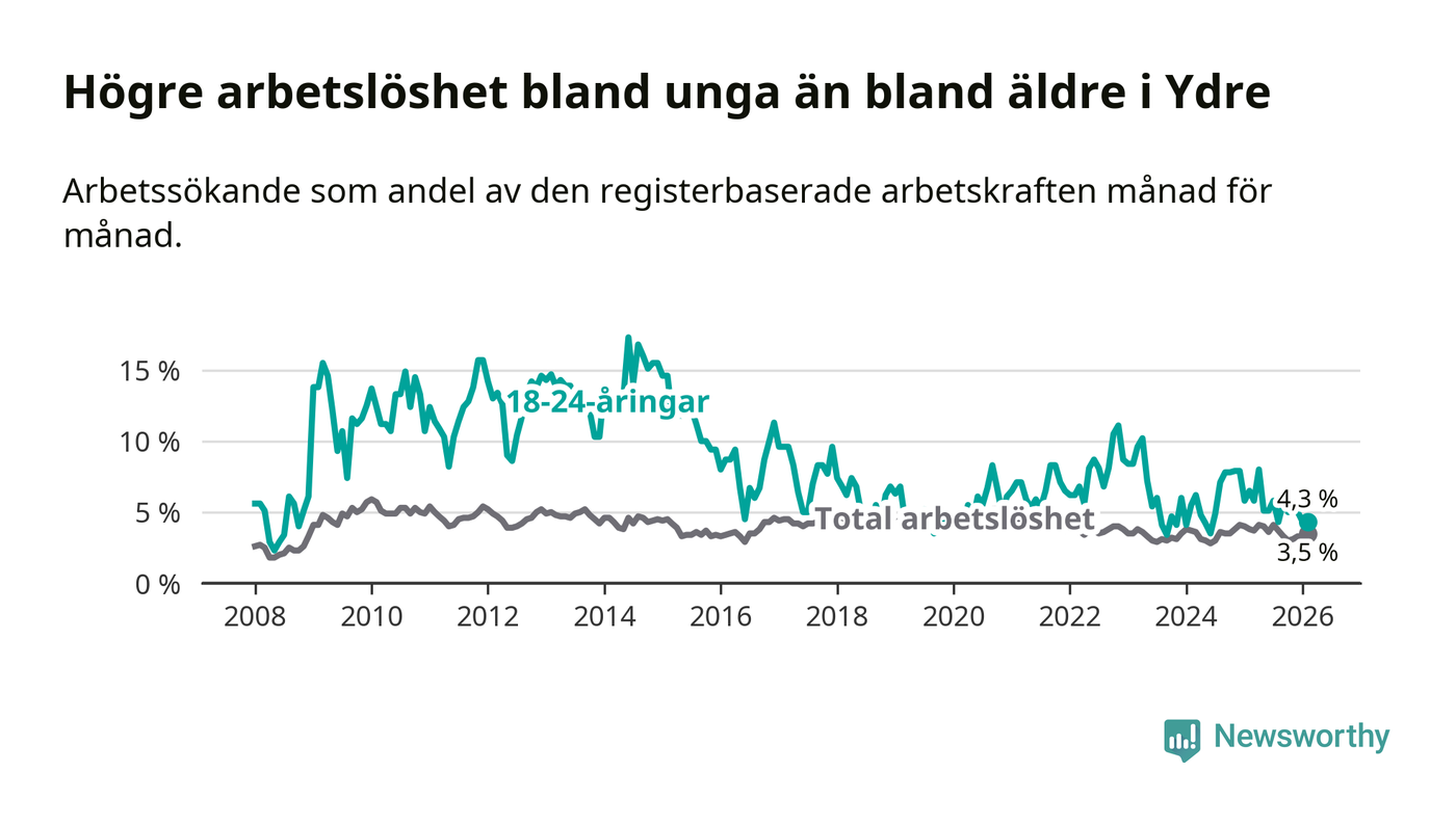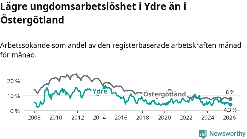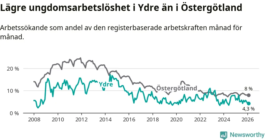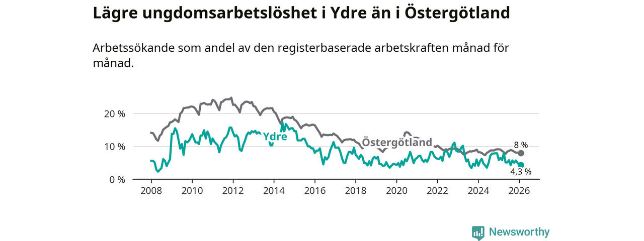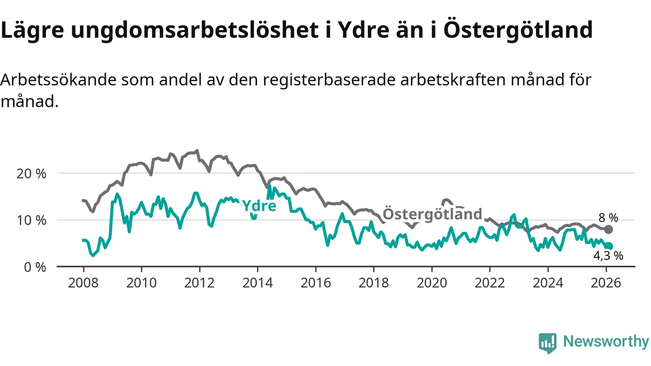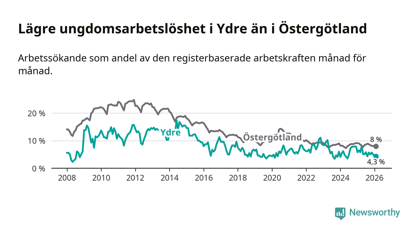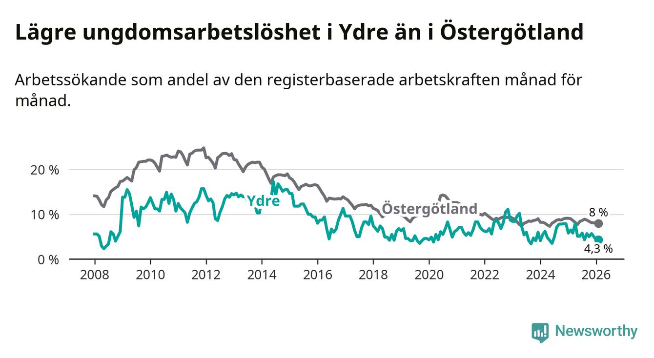 I och med den senaste månadens nedgång har de ungas arbetslöshet i Ydre sjunkit sju månader i följd (ner från 5,8 procent i juli 2025 till 4,3 procent nu).