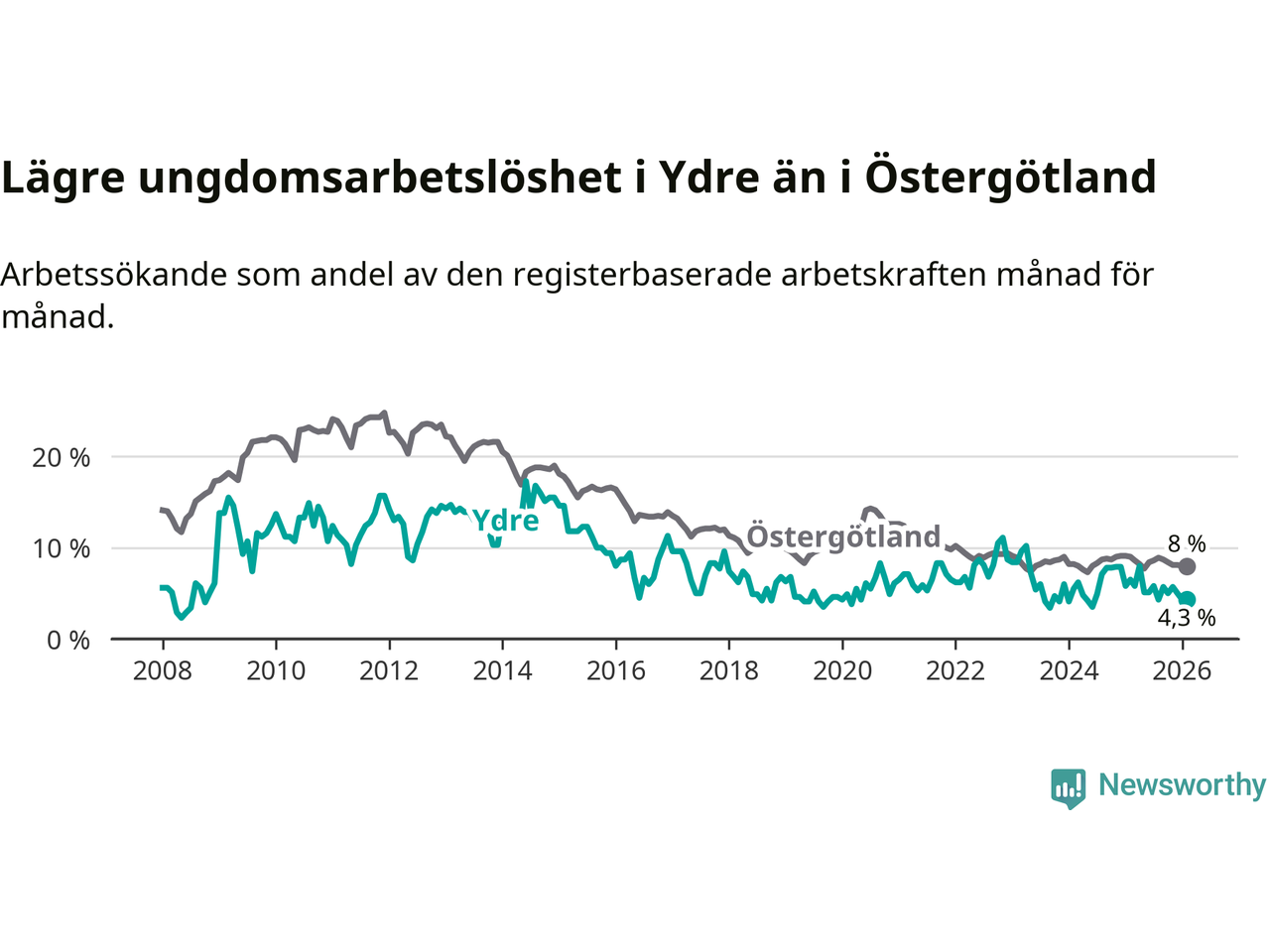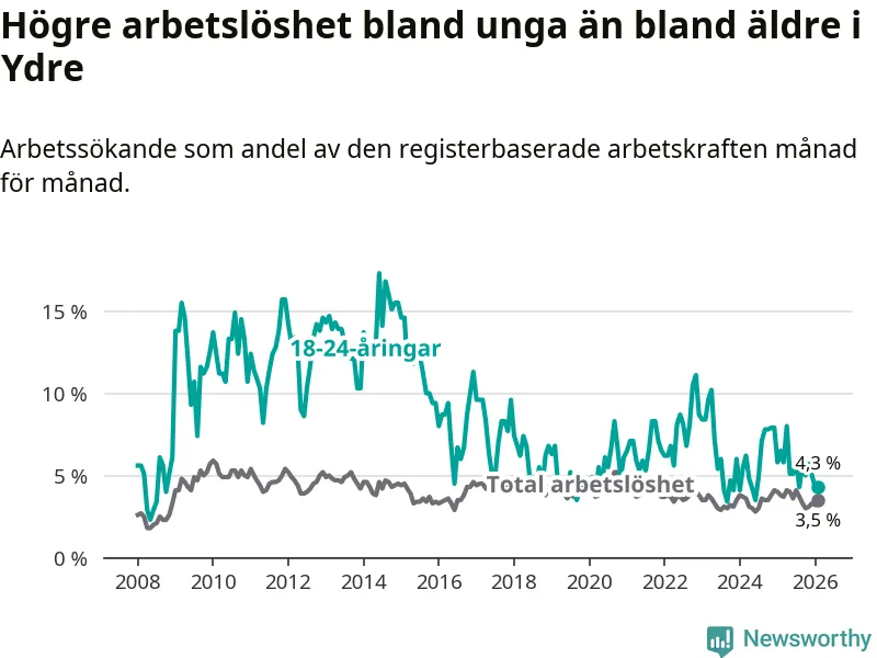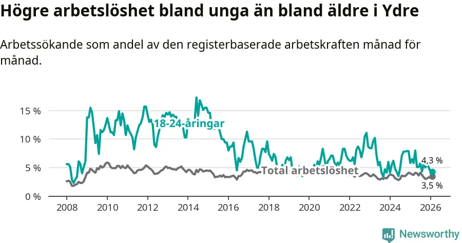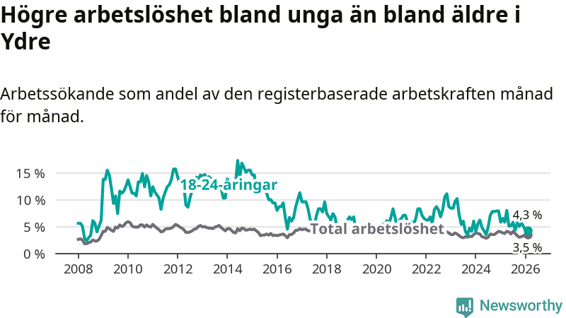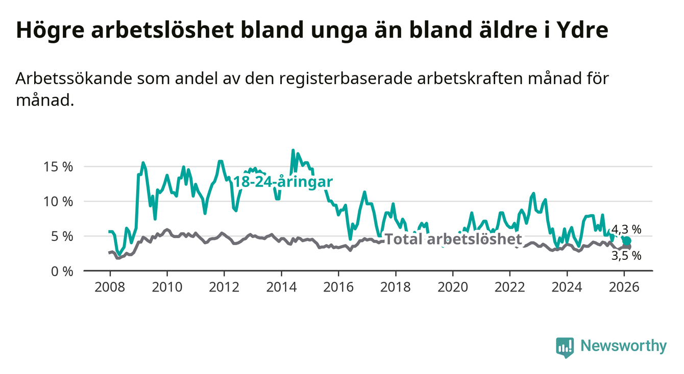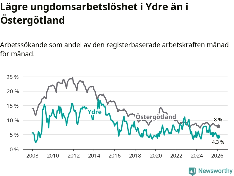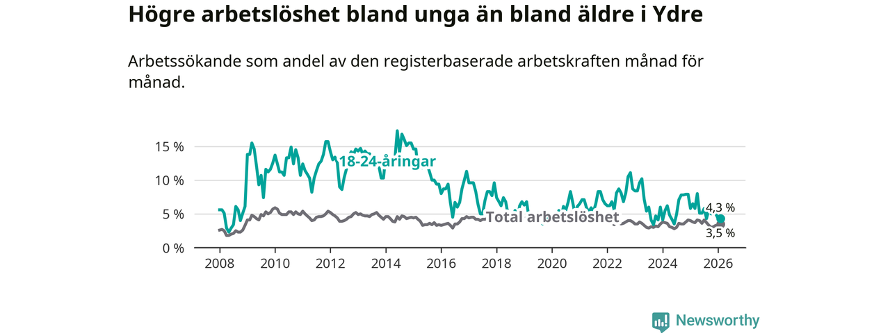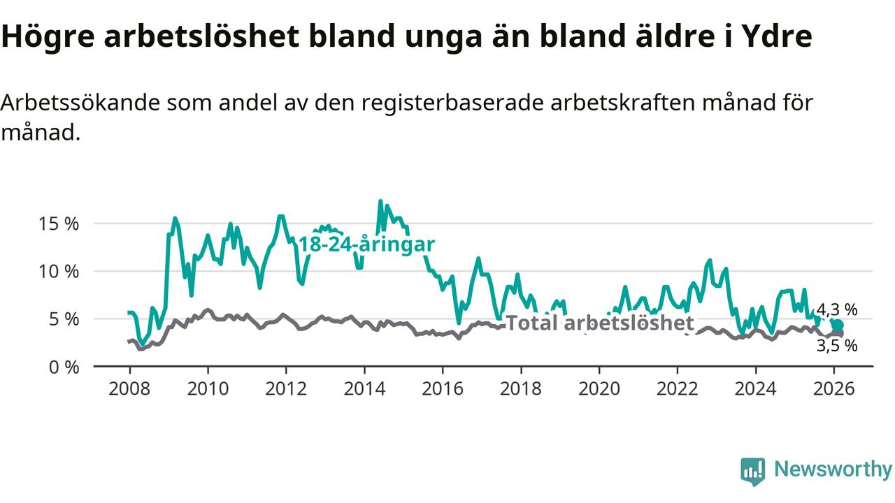 I och med den senaste månadens nedgång har de ungas arbetslöshet i Ydre sjunkit sju månader i följd (ner från 5,8 procent i juli 2025 till 4,3 procent nu).
