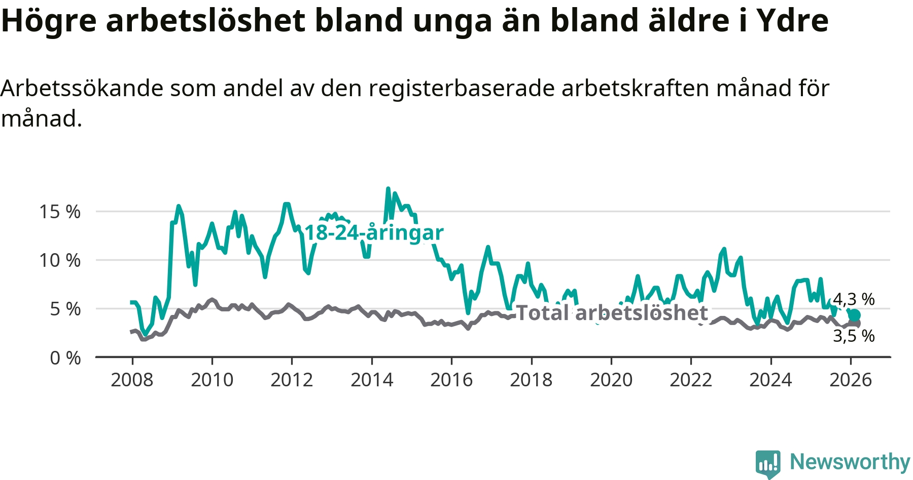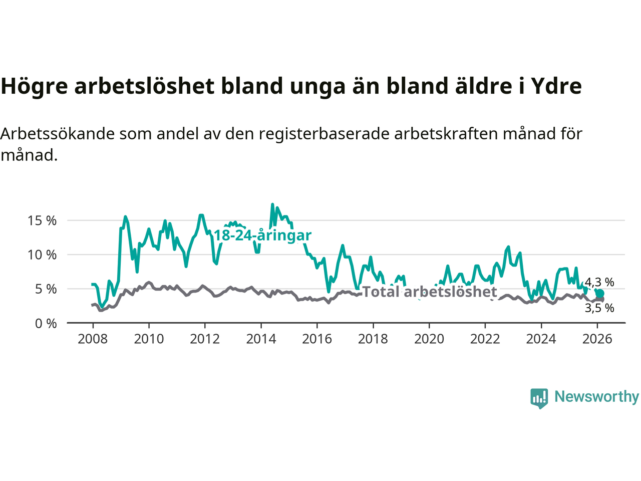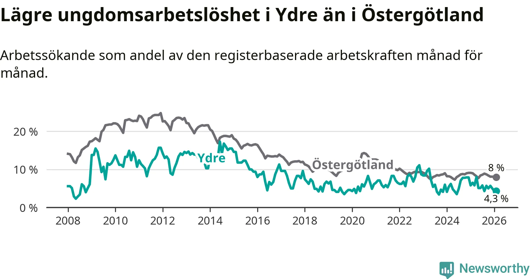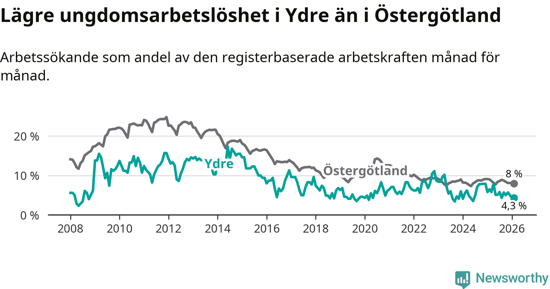 I och med den senaste månadens nedgång har de ungas arbetslöshet i Ydre sjunkit sju månader i följd (ner från 5,8 procent i juli 2025 till 4,3 procent nu).