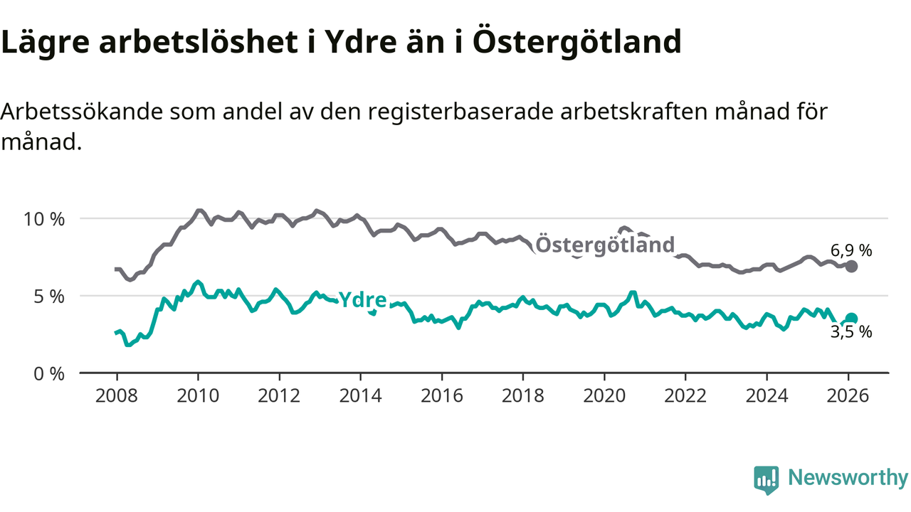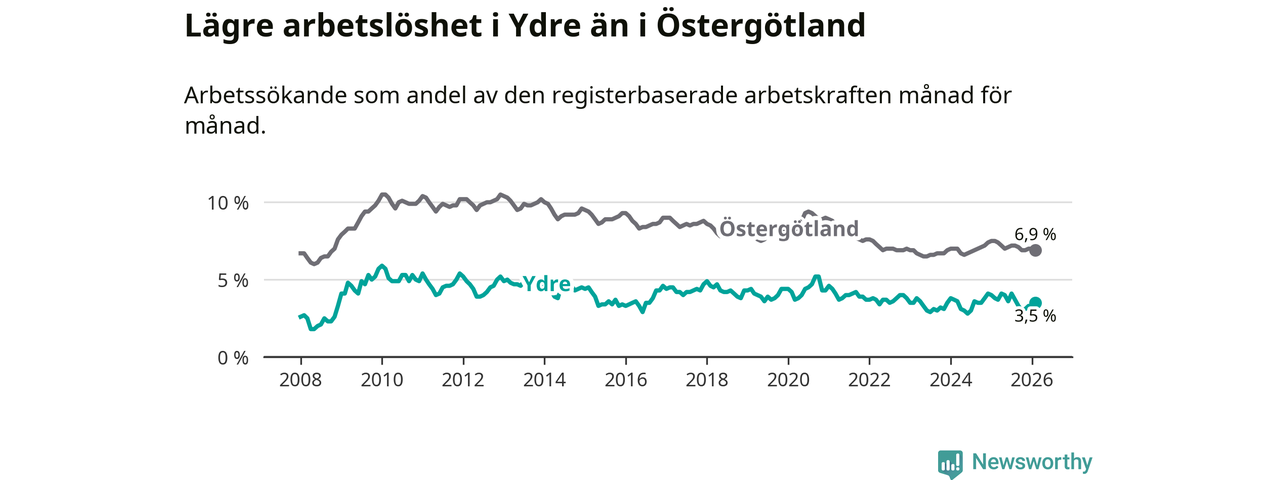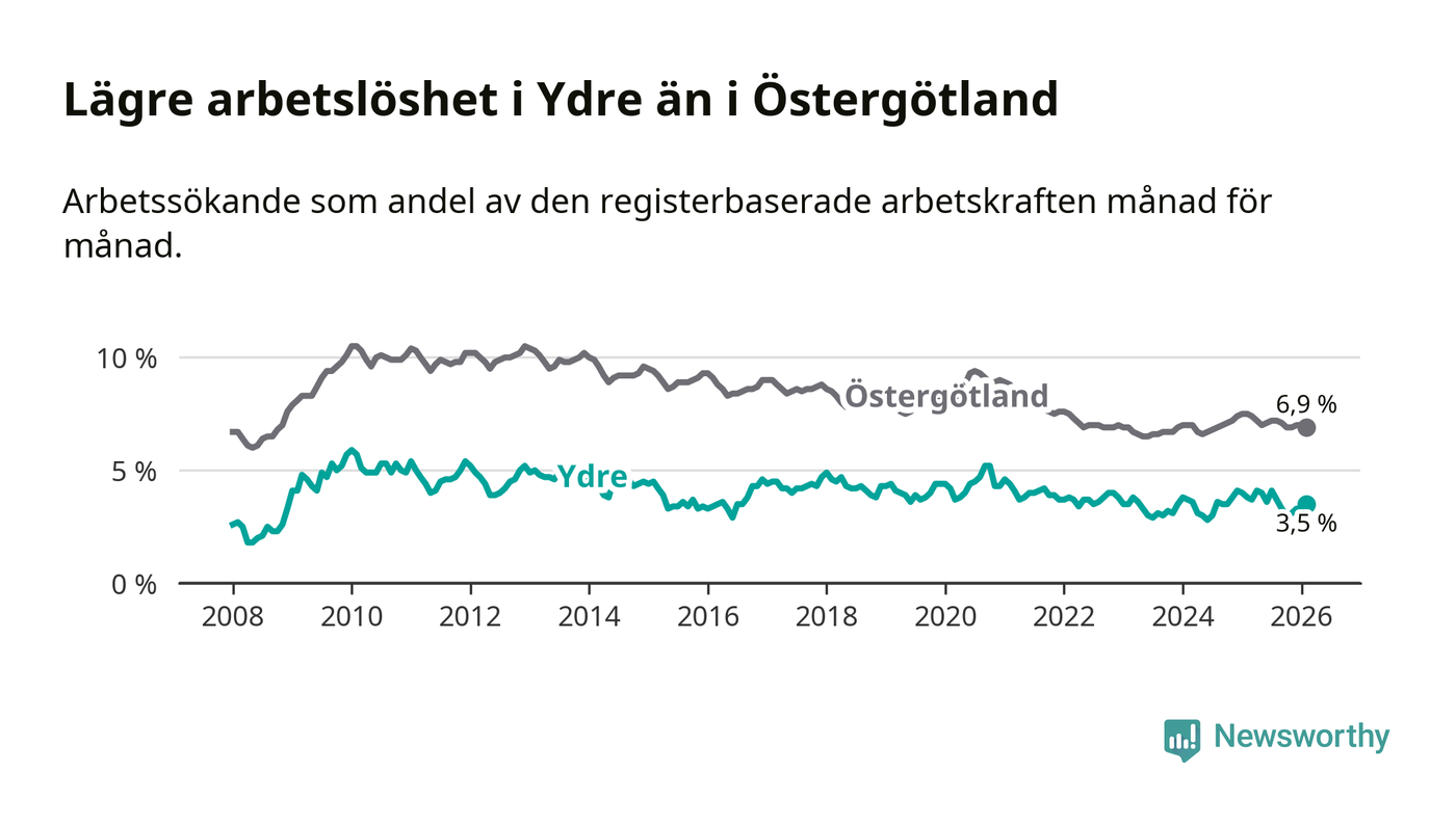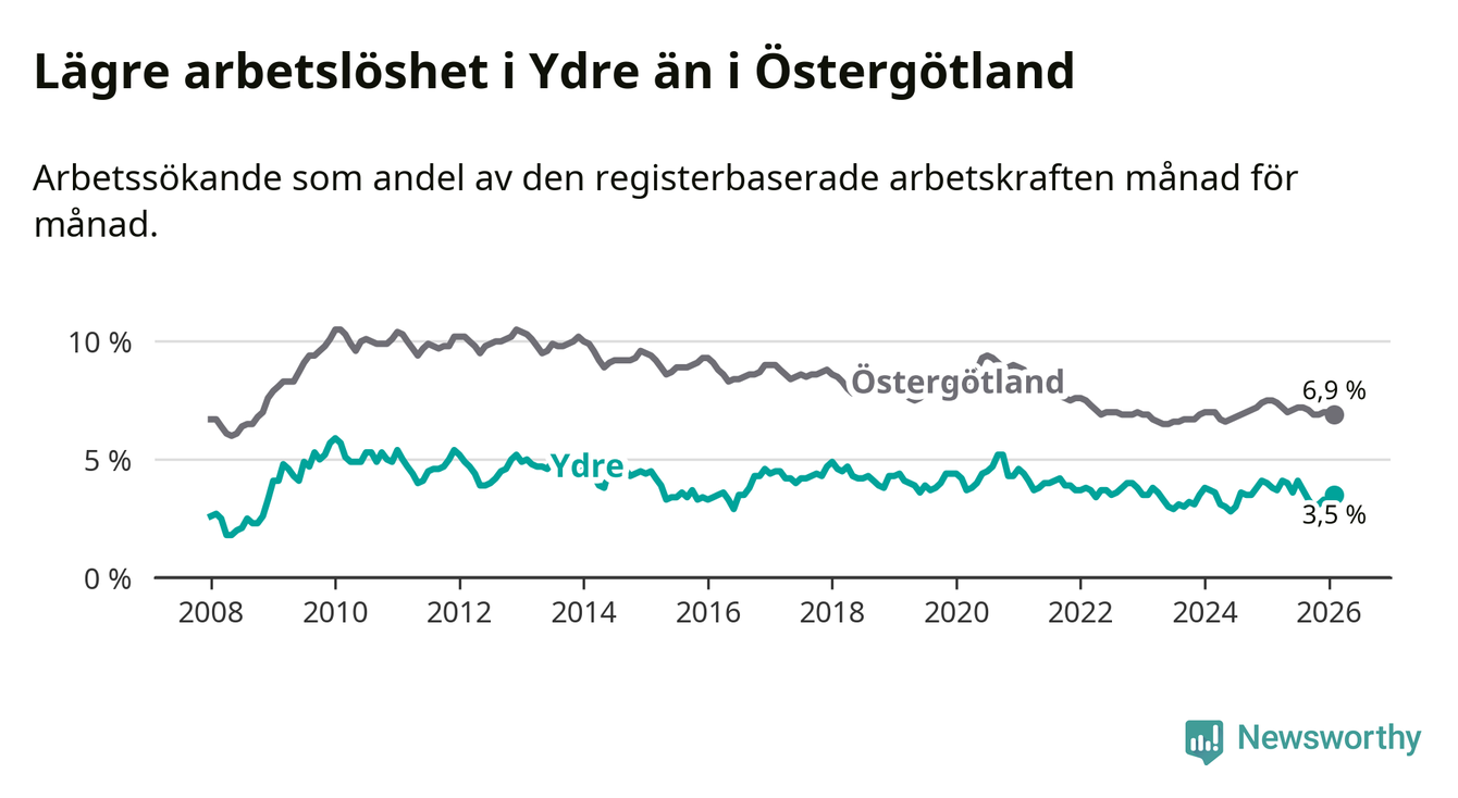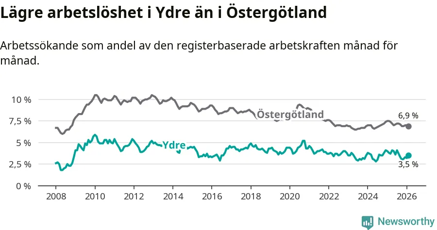 Under februari månad rapporterade Ydre kommun en total arbetslöshet på 3,5 procent. Det är en minskning jämfört med samma tidpunkt i fjol (−0,3 procentenheter). Även i Östergötlands län sjunker arbetslösheten .