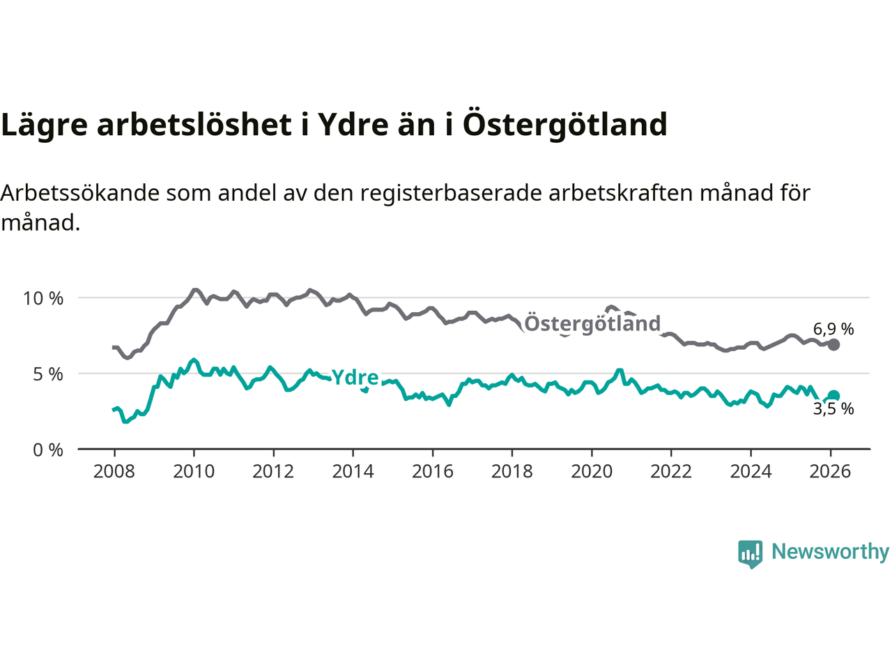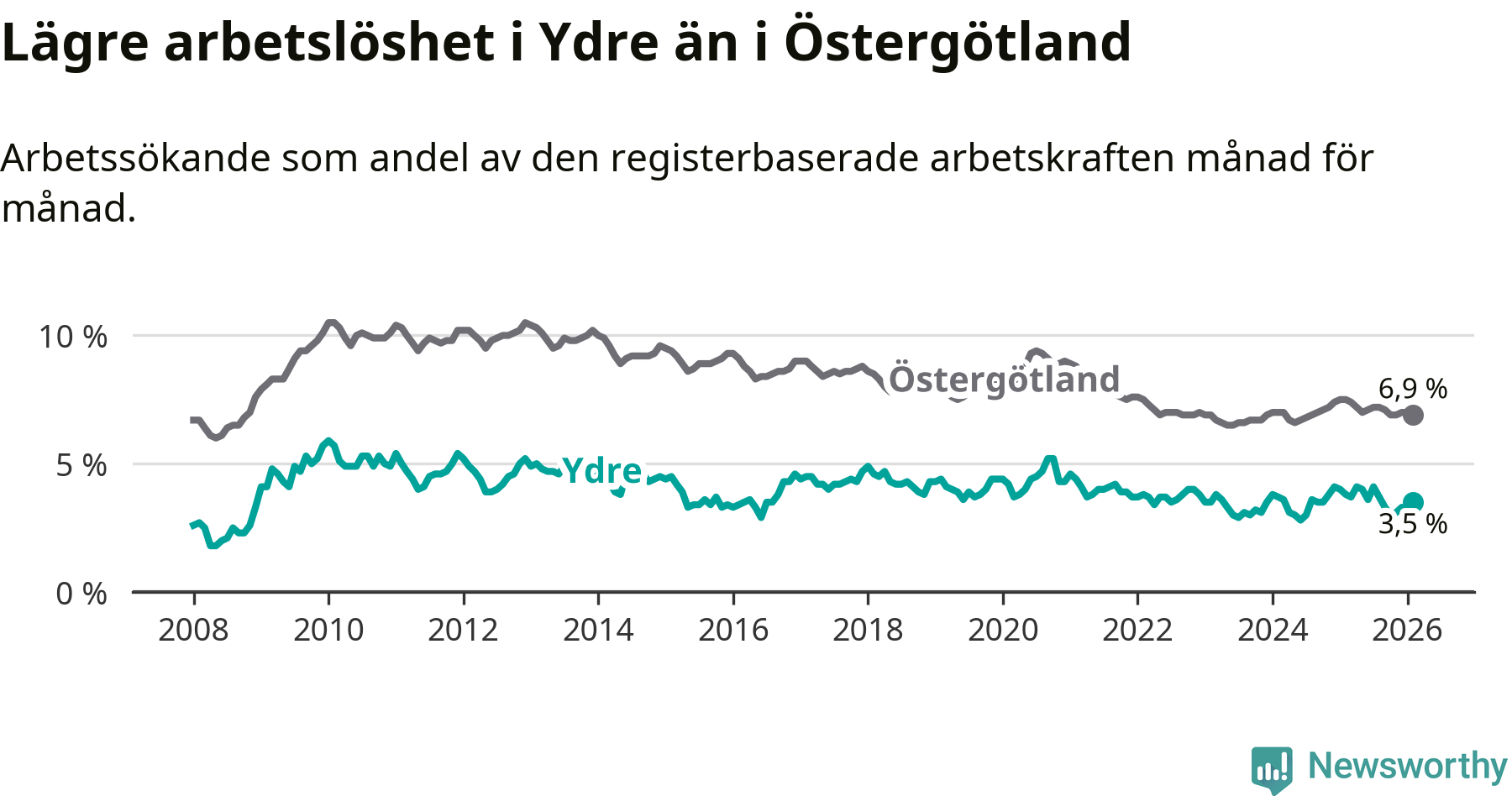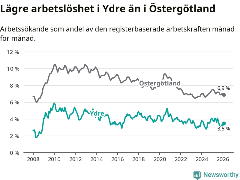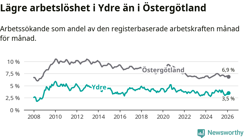 Under februari månad rapporterade Ydre kommun en total arbetslöshet på 3,5 procent. Det är en minskning jämfört med samma tidpunkt i fjol (−0,3 procentenheter). Även i Östergötlands län sjunker arbetslösheten .