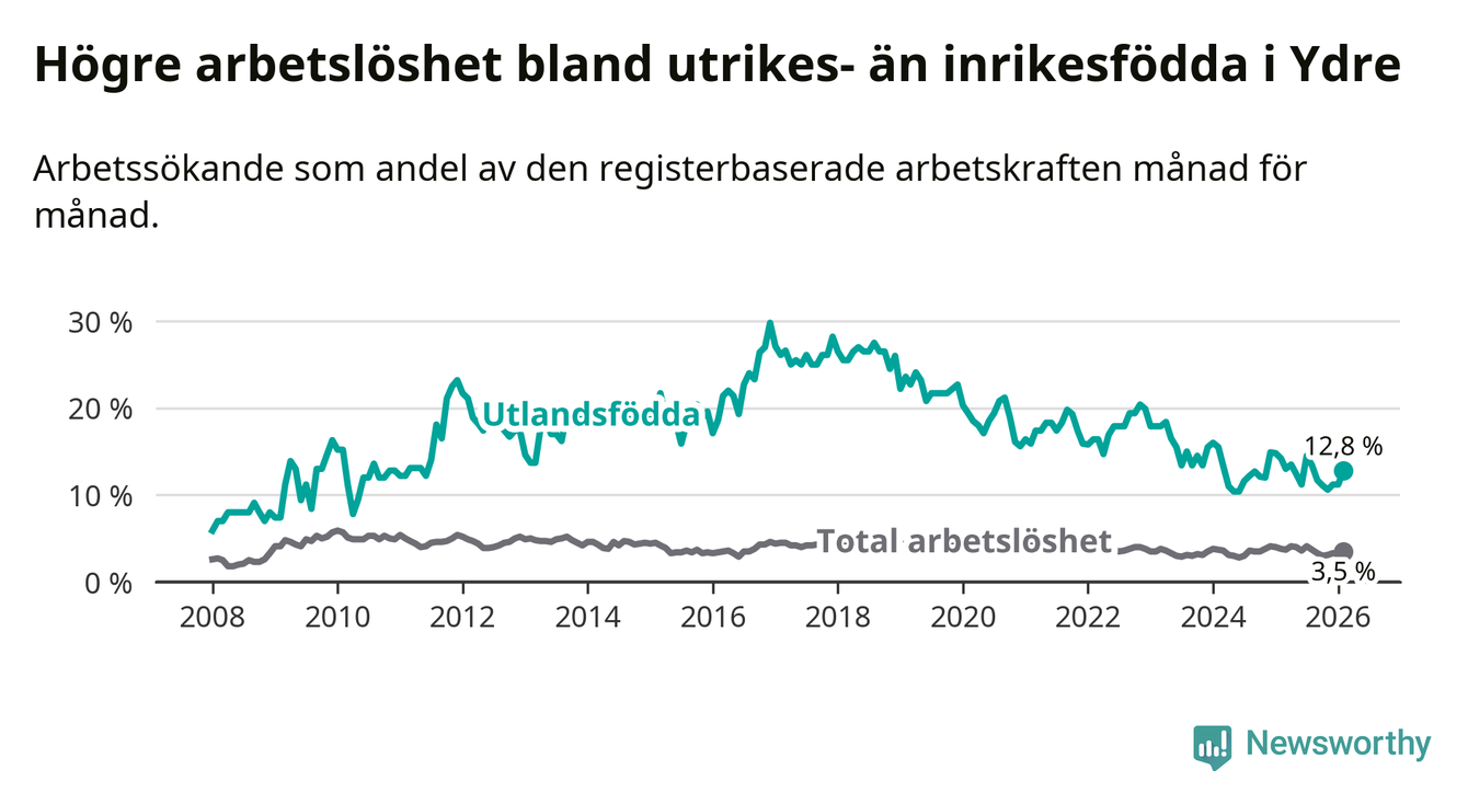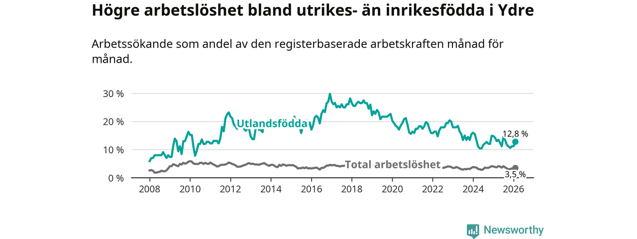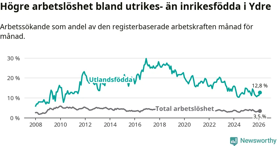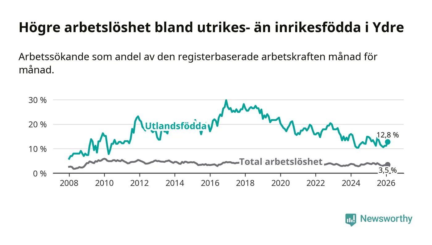 Skillnaden i arbetslöshet mellan utrikesfödda och hela befolkningen är 9,3 procentenheter i Ydre. Det är en mindre skillnad än för ett år sedan (−1,1 procentenheter).