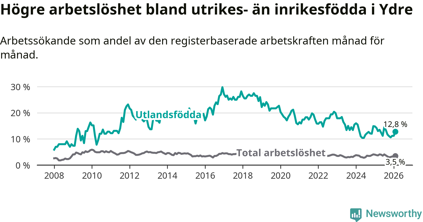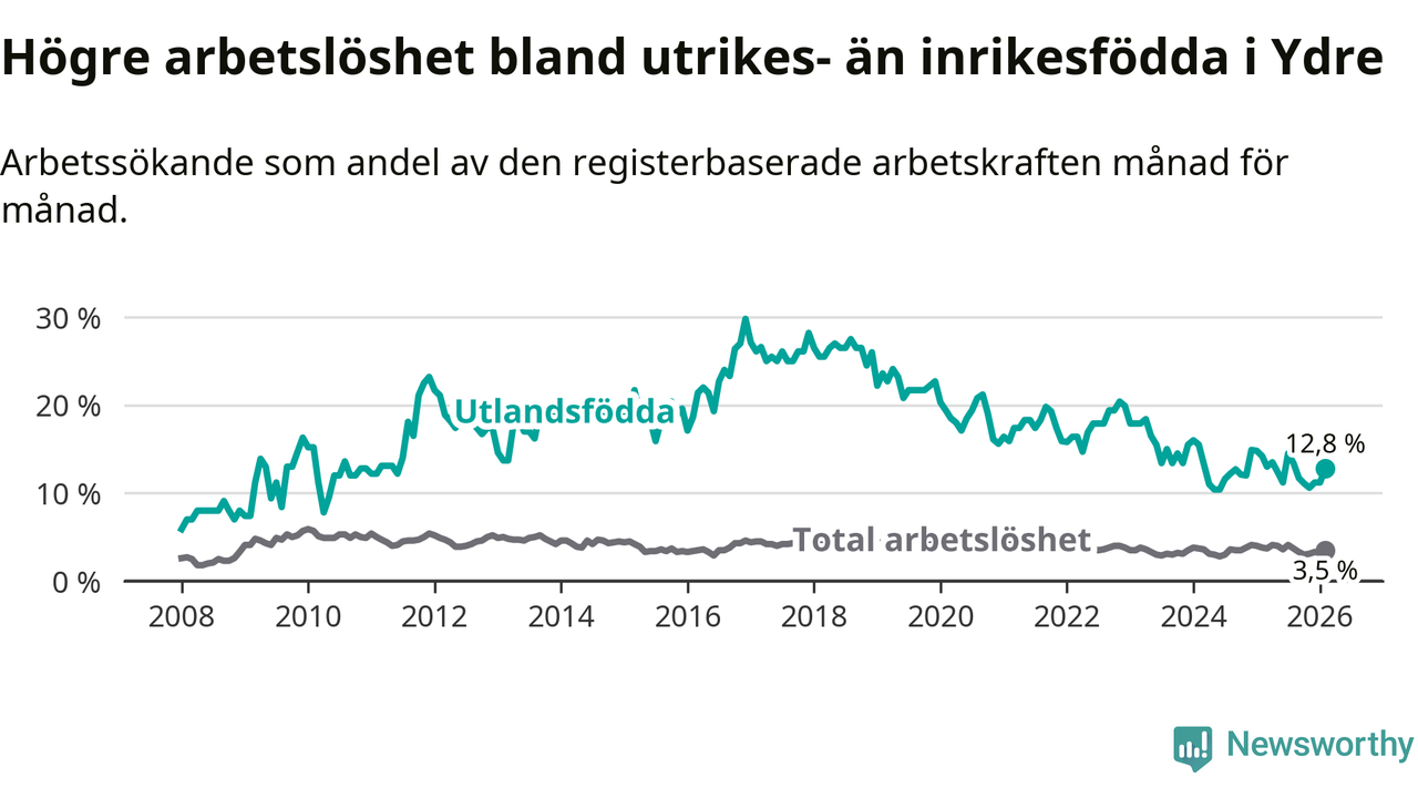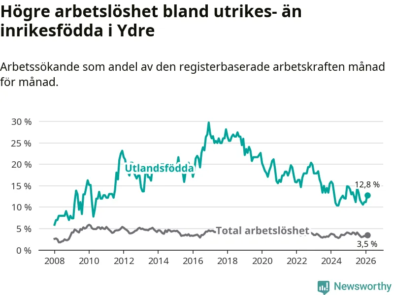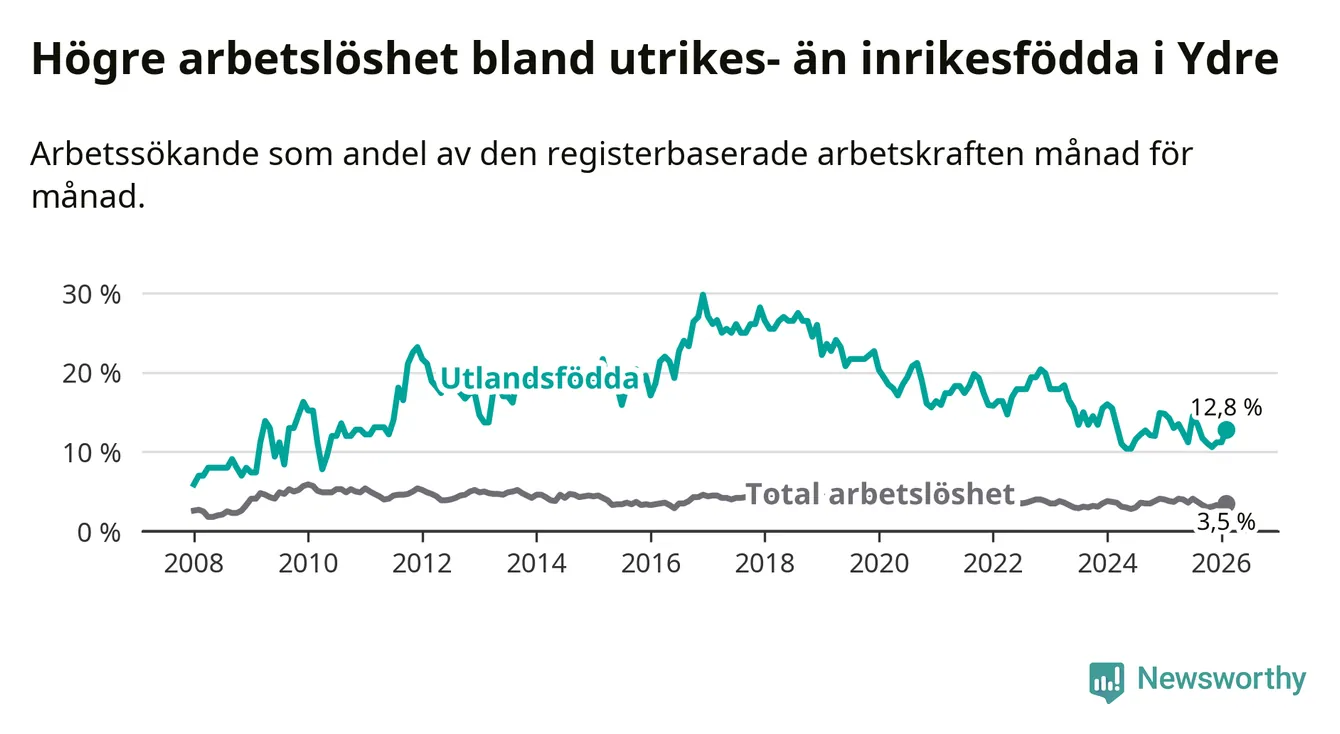 Skillnaden i arbetslöshet mellan utrikesfödda och hela befolkningen är 9,3 procentenheter i Ydre. Det är en mindre skillnad än för ett år sedan (−1,1 procentenheter).