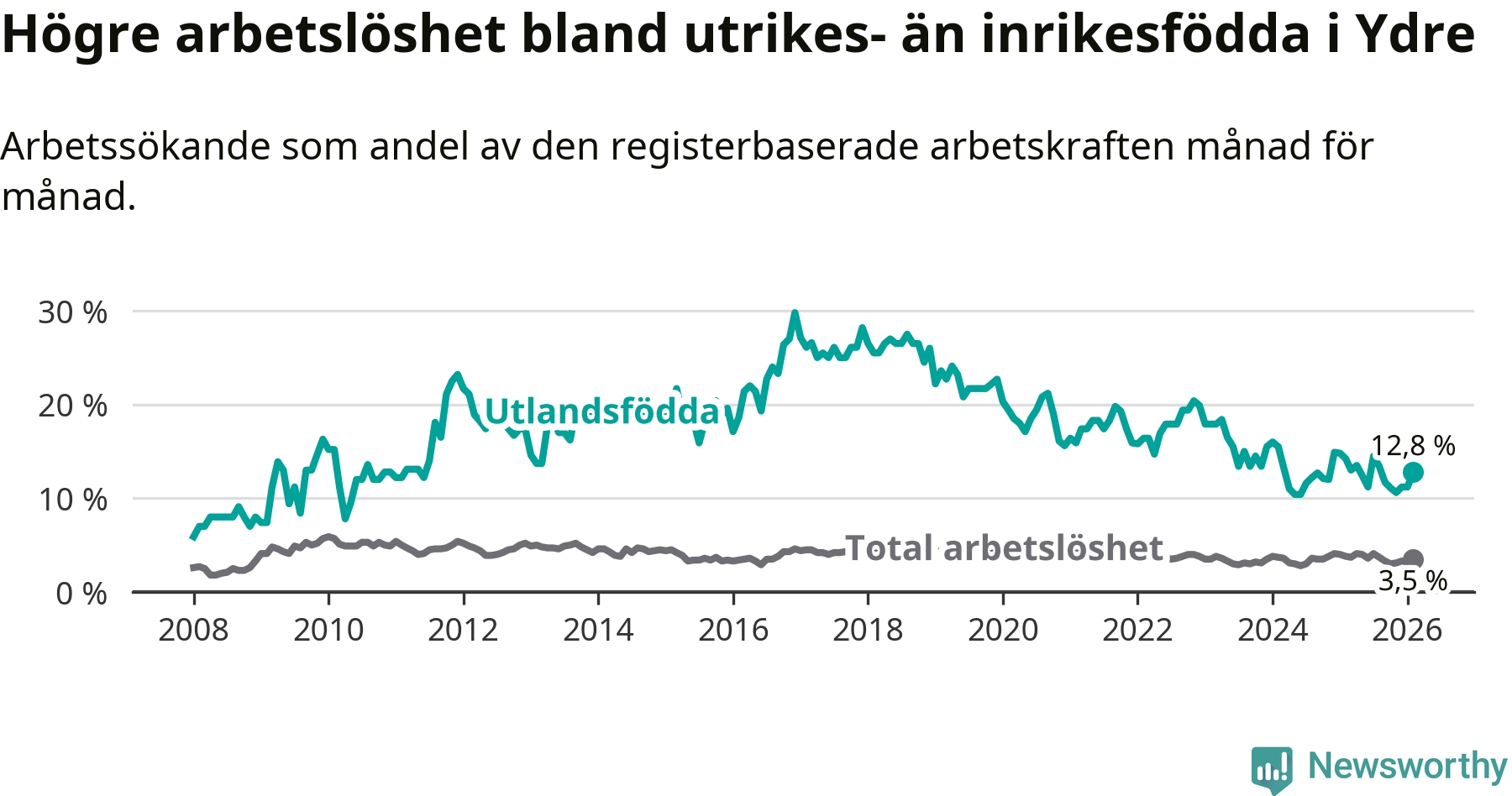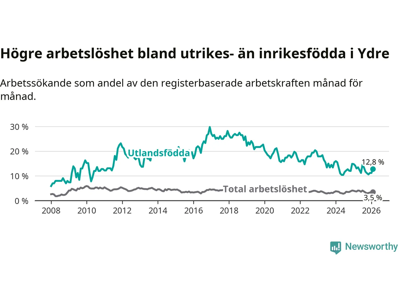 | Bland utlandsfödda | 12,8 % | −1,4 % ▼ | 16,9 % | −2,4 % ▼ | 14,3 % | −1,4 % ▼ |