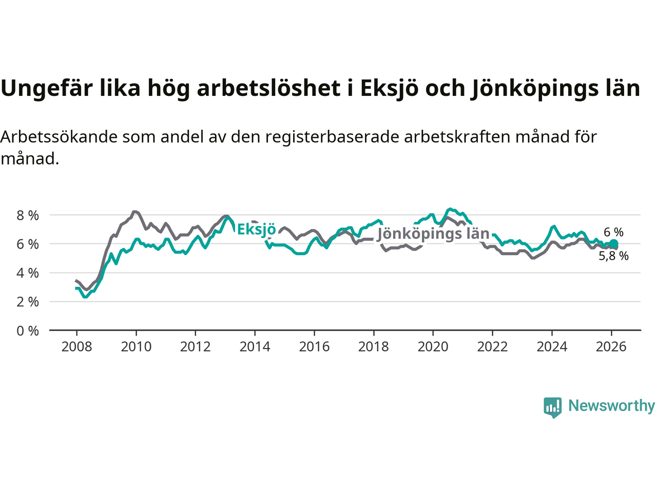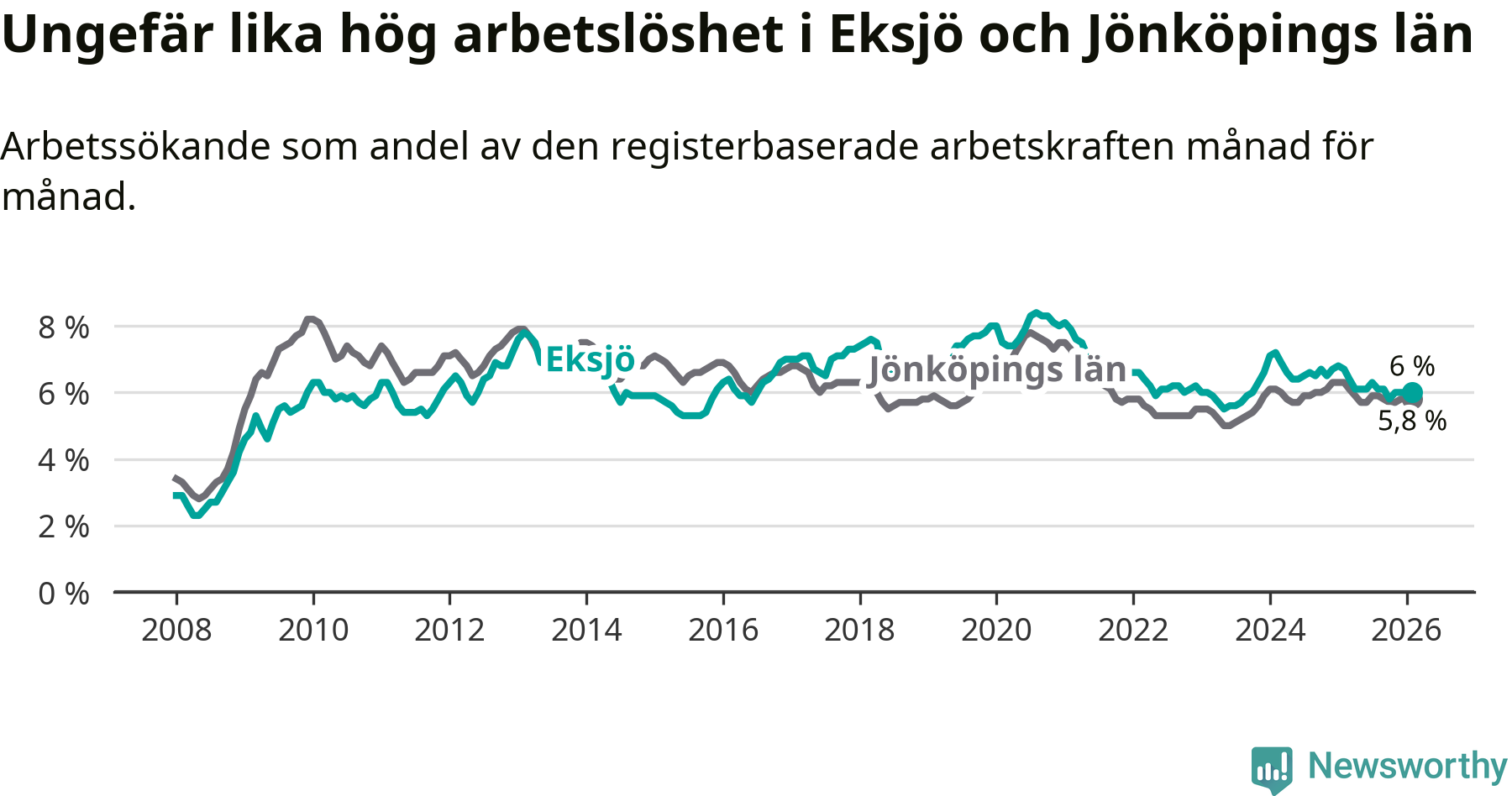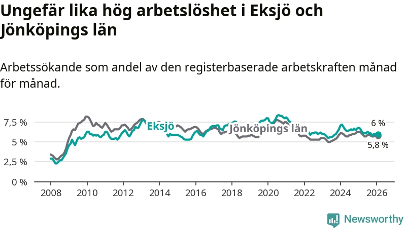 Under februari månad rapporterade Eksjö kommun en total arbetslöshet på 6,0 procent. Det är en minskning jämfört med samma tidpunkt i fjol (−0,7 procentenheter). Även i Jönköpings län sjunker arbetslösheten .