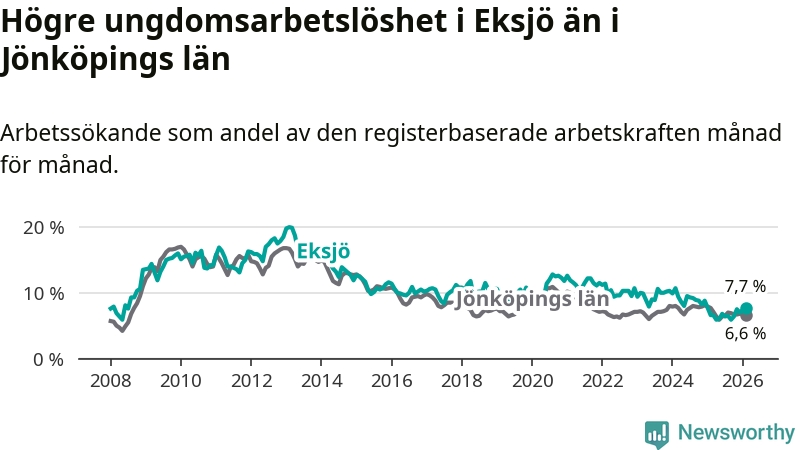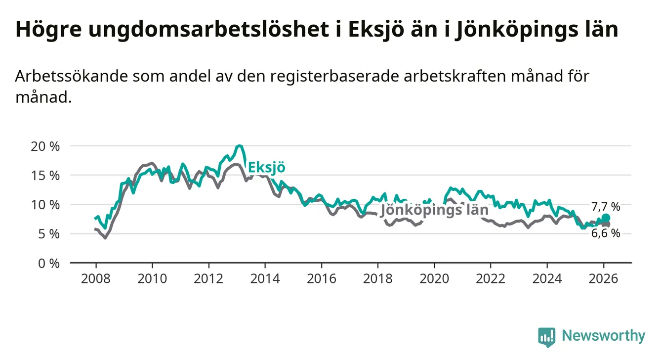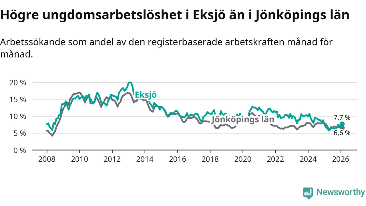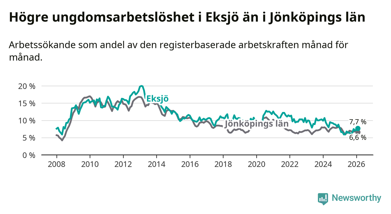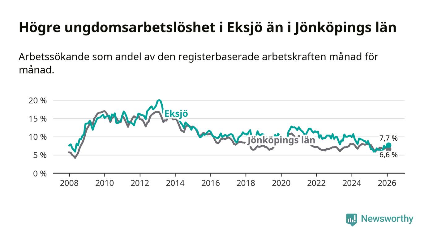 Medan Eksjö har ungefär samma total arbetslöshet som Jönköpings län, ligger ungdomsarbetslösheten 1,1 procentenheter högre i Eksjö.