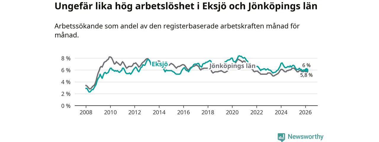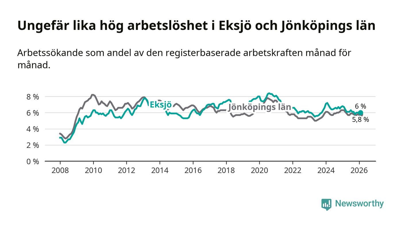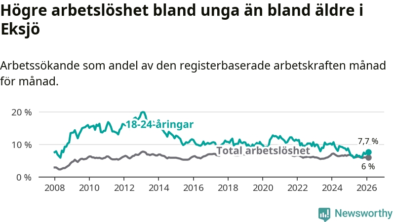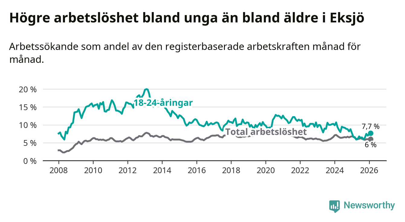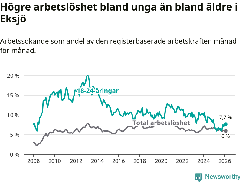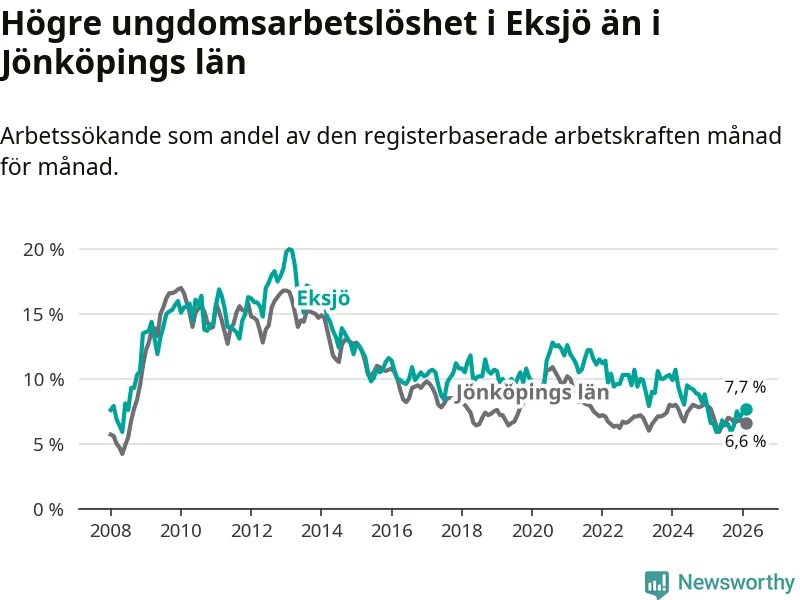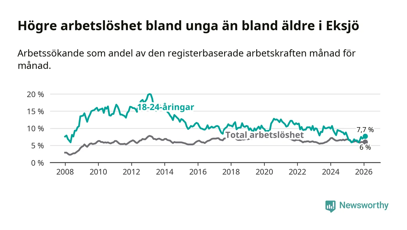 Medan Eksjö har ungefär samma total arbetslöshet som Jönköpings län, ligger ungdomsarbetslösheten 1,1 procentenheter högre i Eksjö.