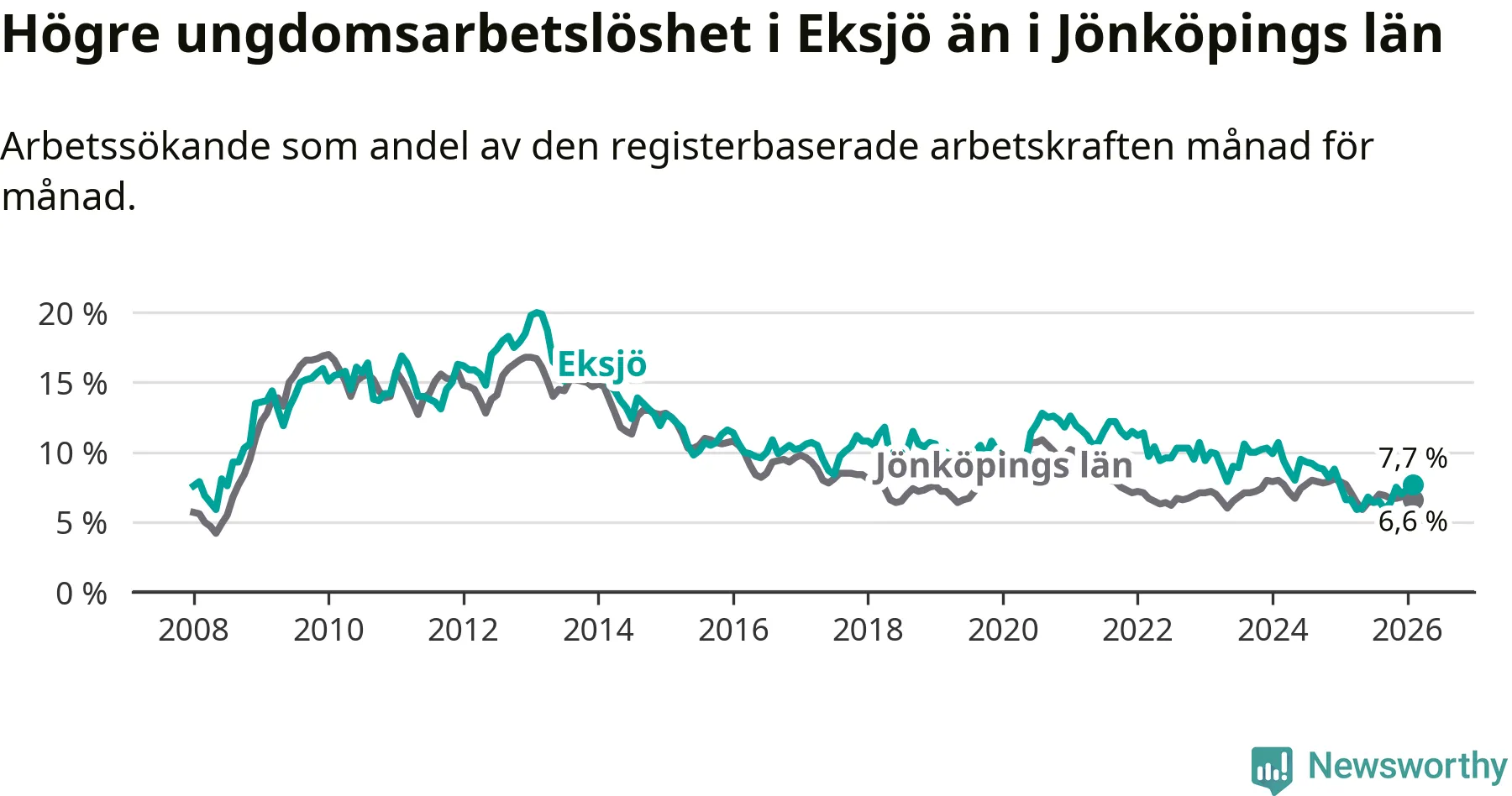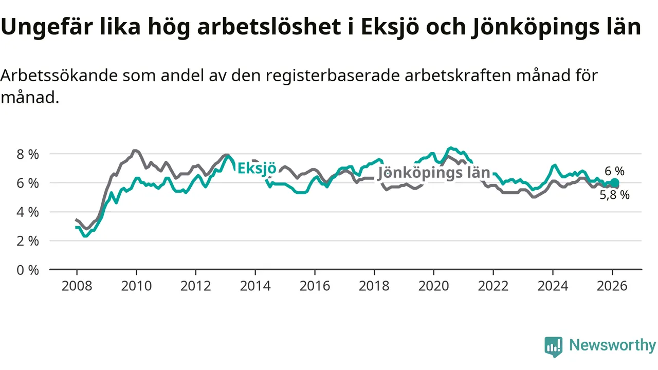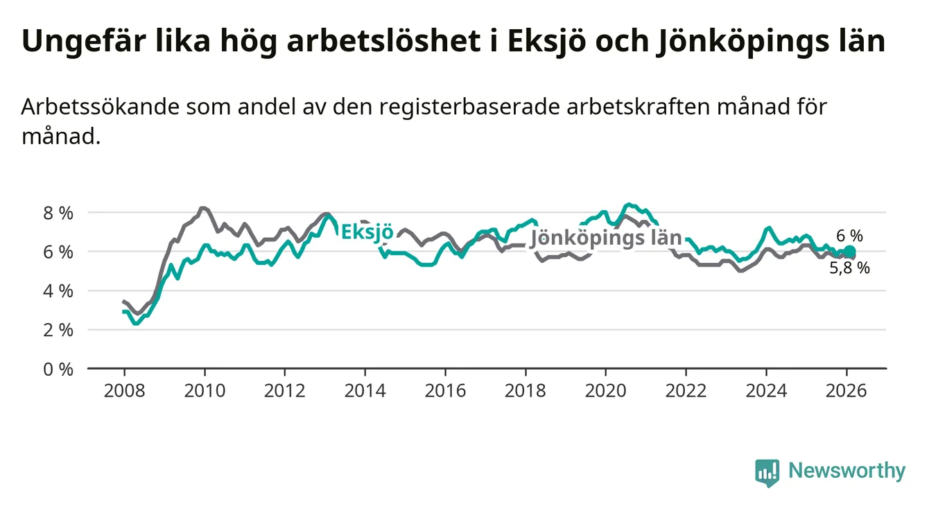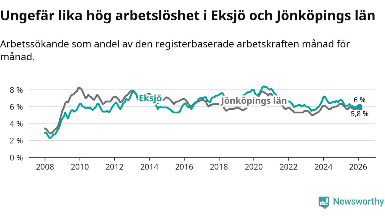 Medan Eksjö har ungefär samma total arbetslöshet som Jönköpings län, ligger ungdomsarbetslösheten 1,1 procentenheter högre i Eksjö.