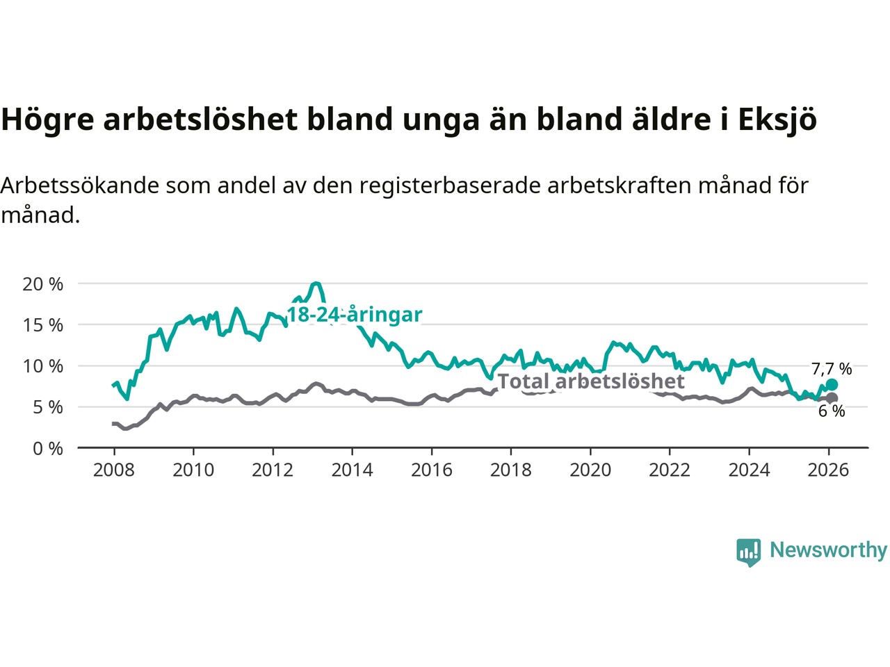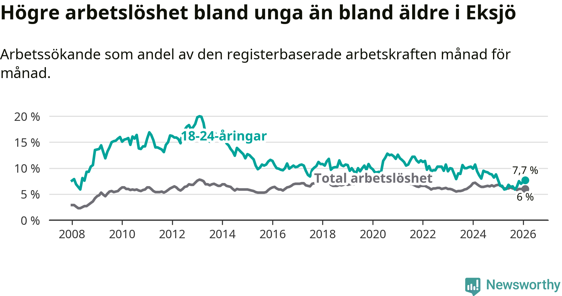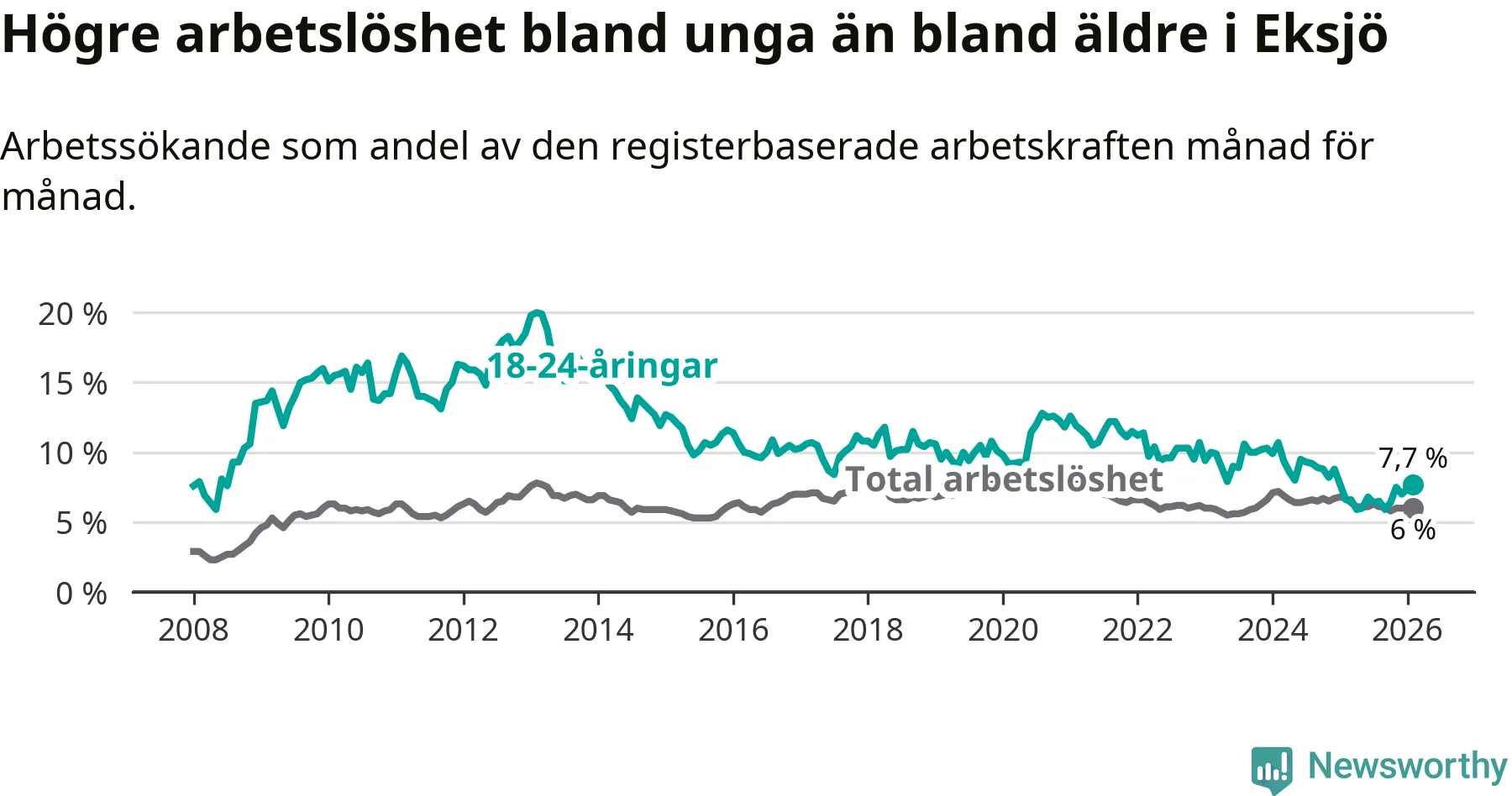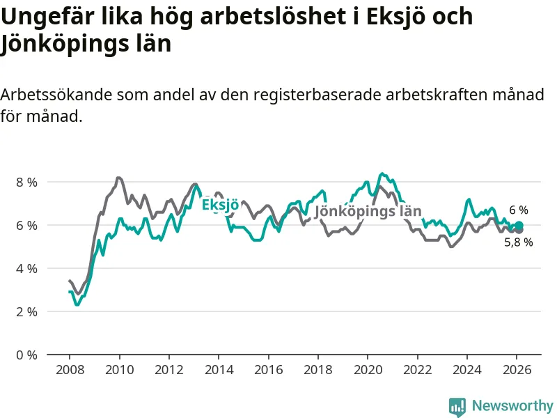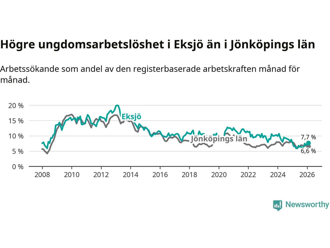 Medan Eksjö har ungefär samma total arbetslöshet som Jönköpings län, ligger ungdomsarbetslösheten 1,1 procentenheter högre i Eksjö.