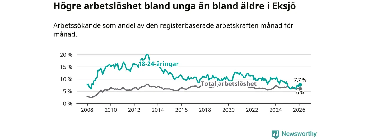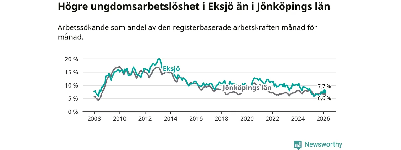 Sedan juli 2024 har ungdomsarbetslösheten i Eksjö kommun minskat, men i februari vände utvecklingen då andelen arbetslösa steg jämfört med året innan.