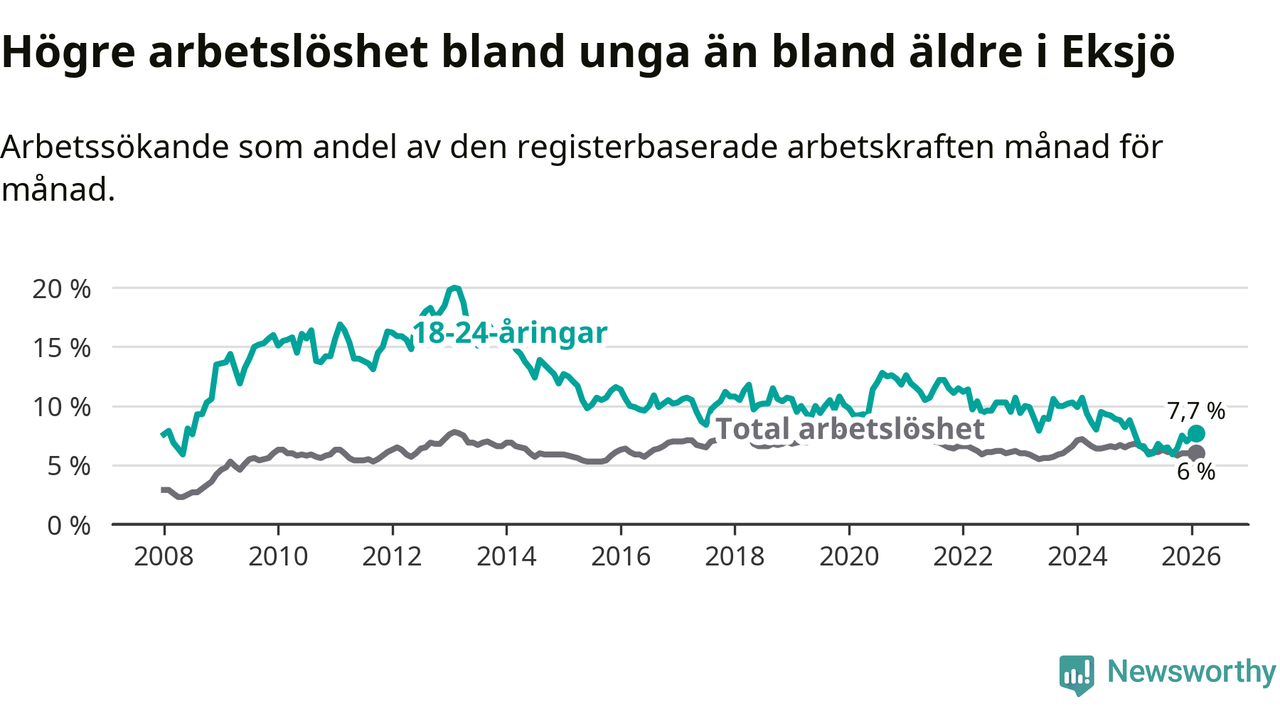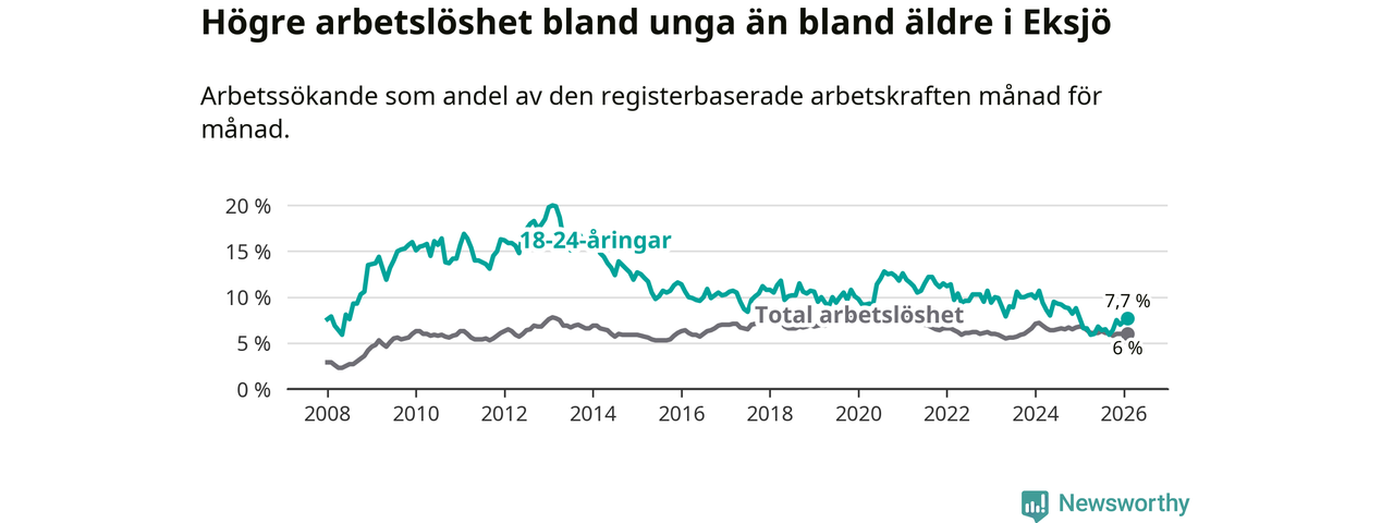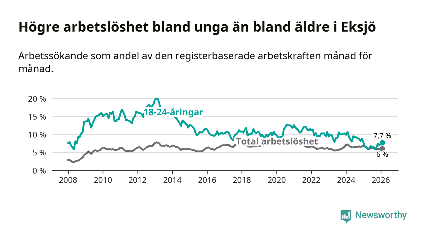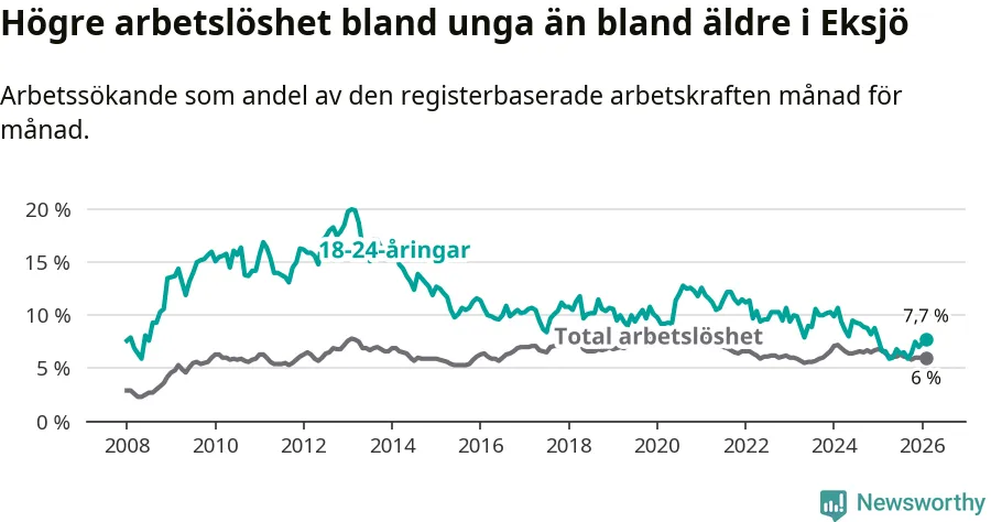 Den senaste månadsstatistiken från Arbetsförmedlingen visar på en uppgång i ungdomsarbetslöshet i Eksjö kommun med 1,1 procentenheter. Arbetslösheten bland personer i åldern 18–24 år låg i februari på 7,7 procent.