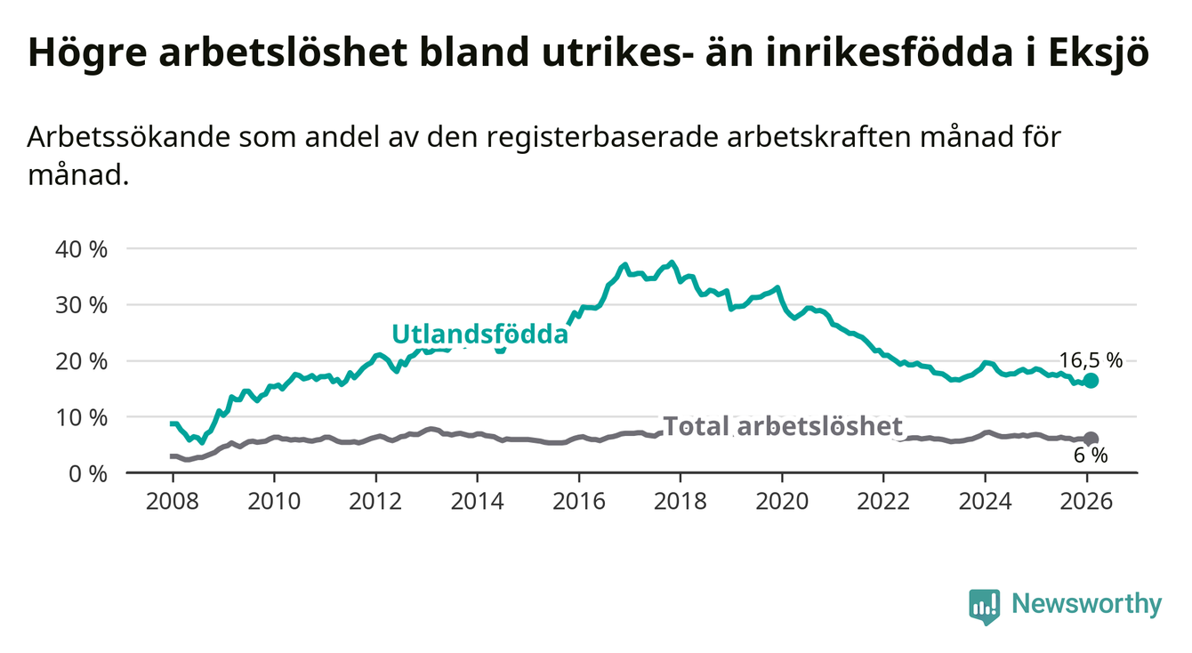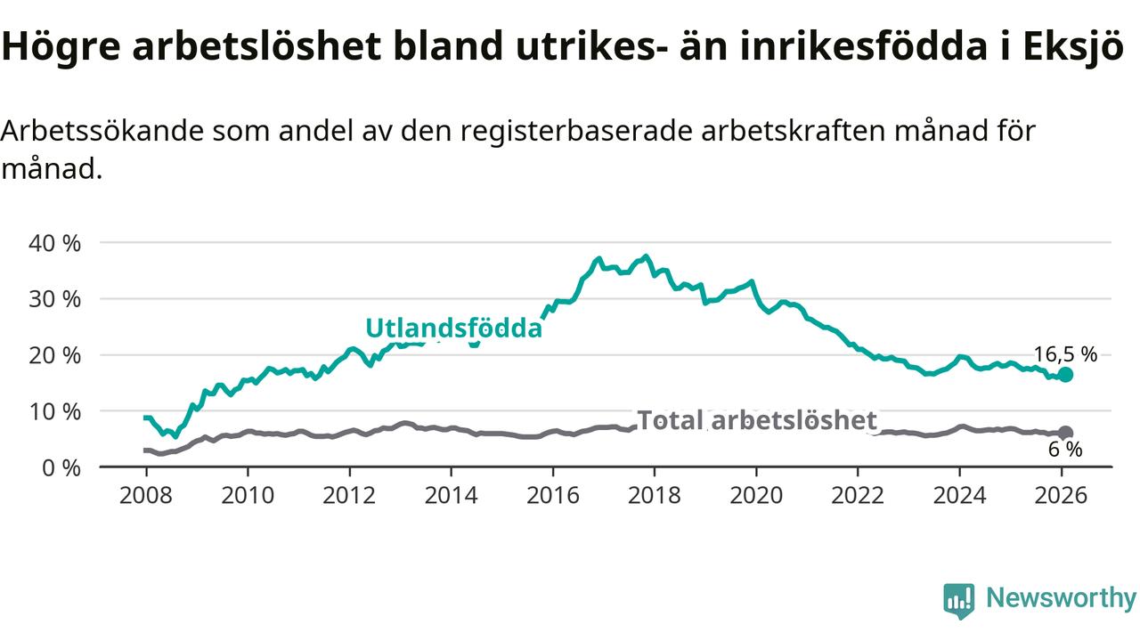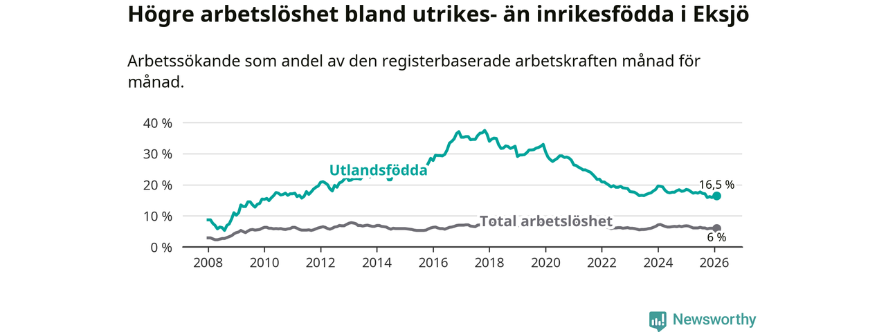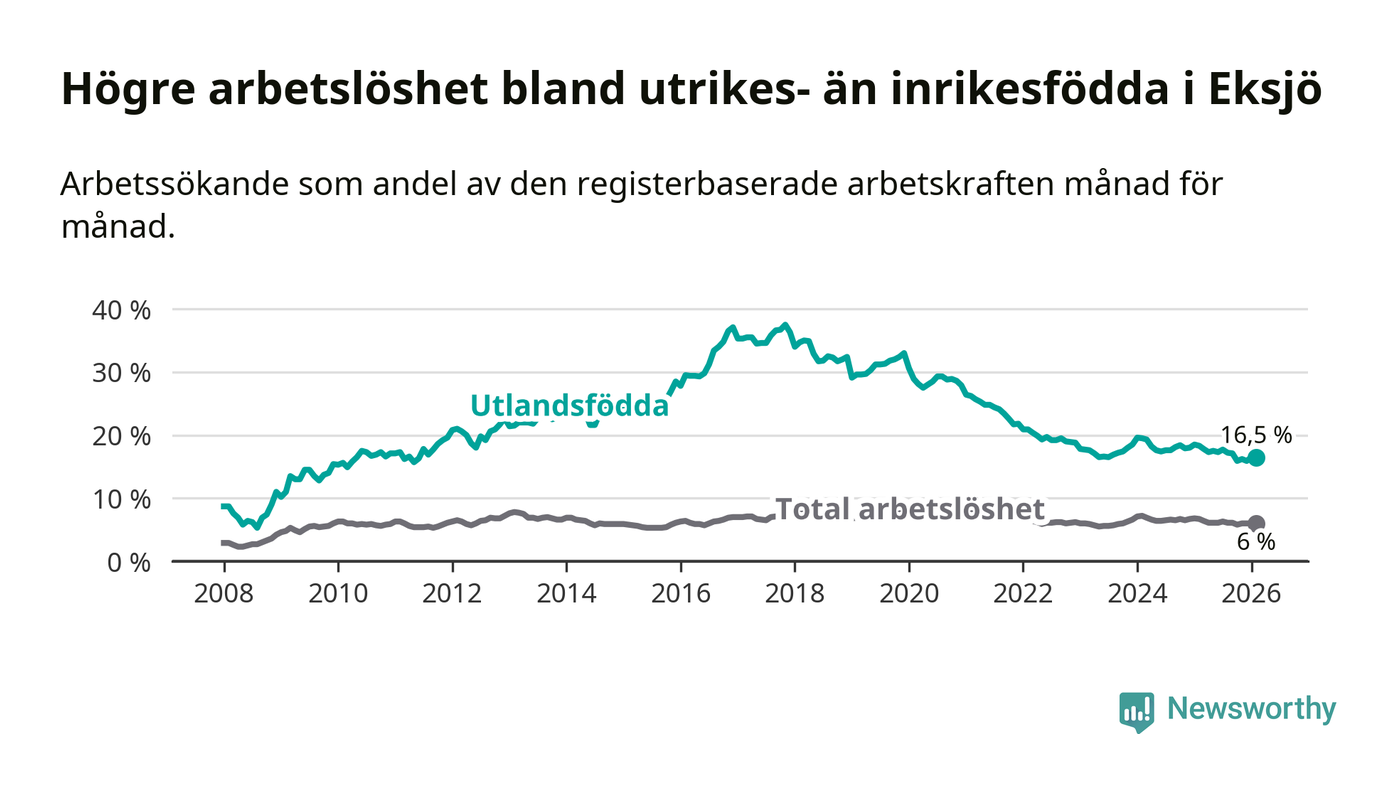 Arbetslösheten bland utlandsfödda var 16,5 procent i Eksjö under februari månad, motsvarande 259 av 1 570 personer. Det är 1,8 procentenheter färre än vid samma tidpunkt i fjol (−27 om man räknar personer). Därmed är de utlandsföddas arbetslöshet lägre än vid samma tidpunkt i fjol för sjunde månaden i följd. Sedan juli 2025 har arbetslösheten bland utlandsfödda minskat från 17,7 till 16,5 procent.