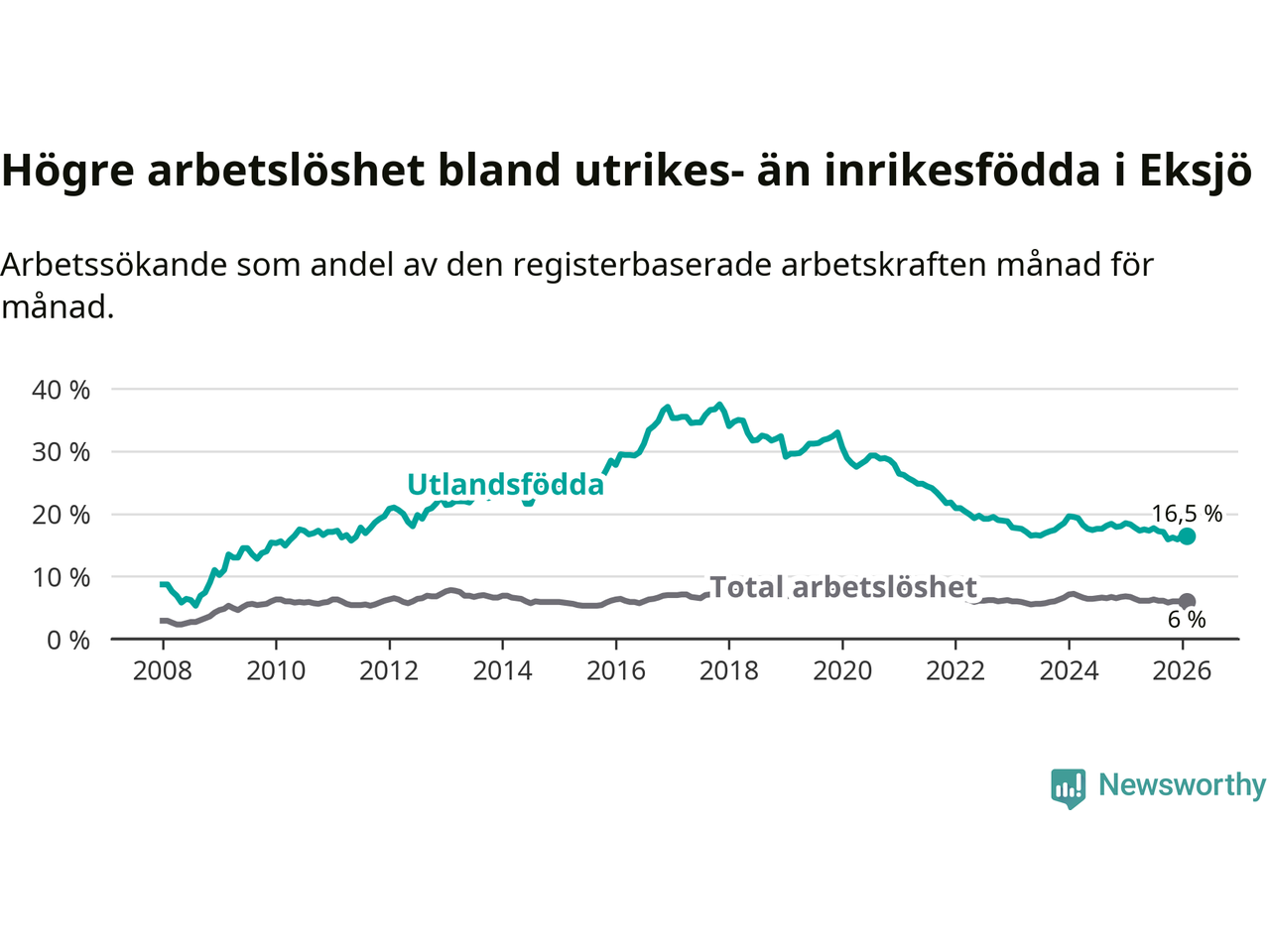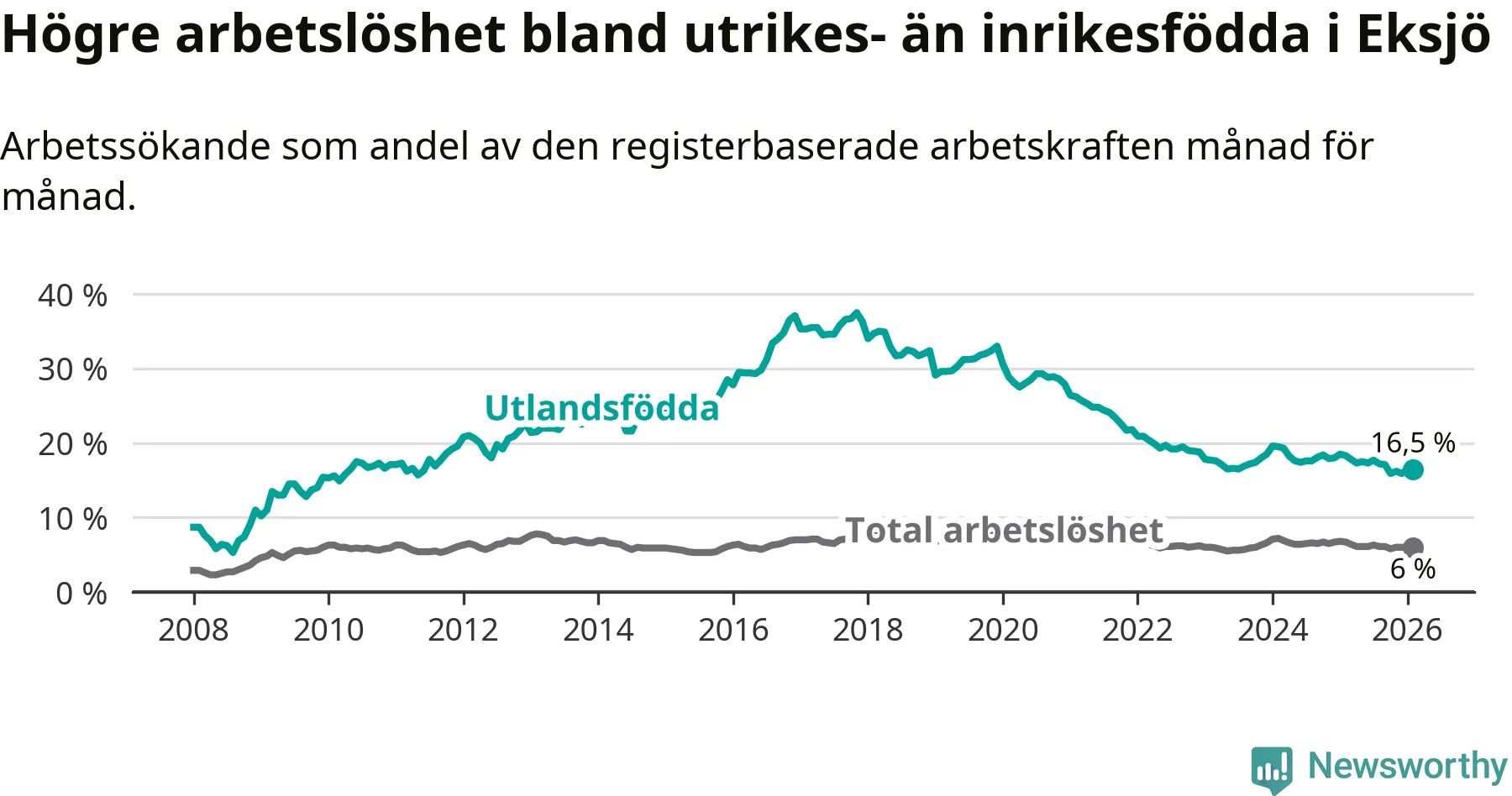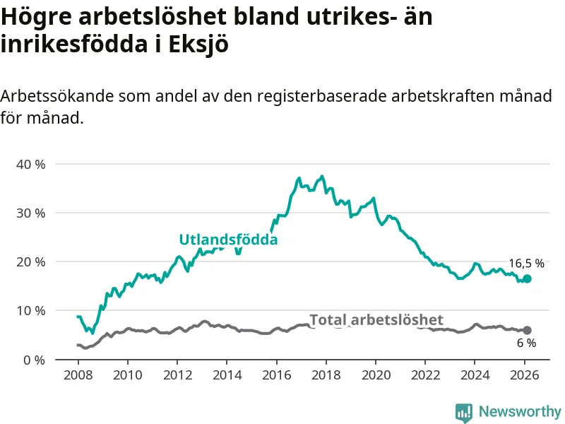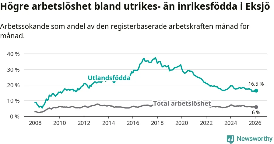 Arbetslösheten bland utlandsfödda var 16,5 procent i Eksjö under februari månad, motsvarande 259 av 1 570 personer. Det är 1,8 procentenheter färre än vid samma tidpunkt i fjol (−27 om man räknar personer). Därmed är de utlandsföddas arbetslöshet lägre än vid samma tidpunkt i fjol för sjunde månaden i följd. Sedan juli 2025 har arbetslösheten bland utlandsfödda minskat från 17,7 till 16,5 procent.