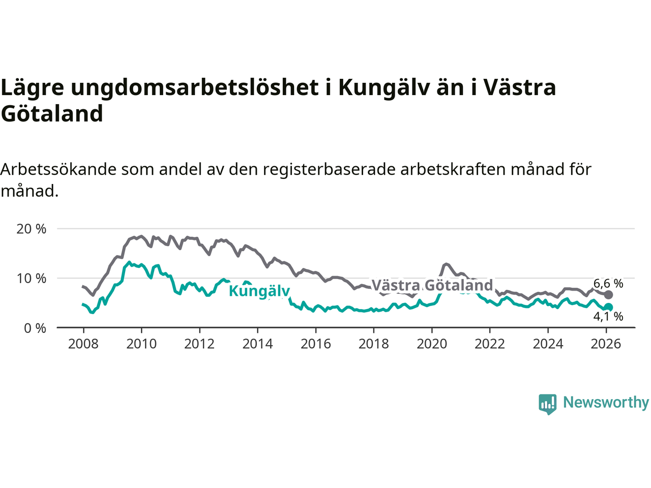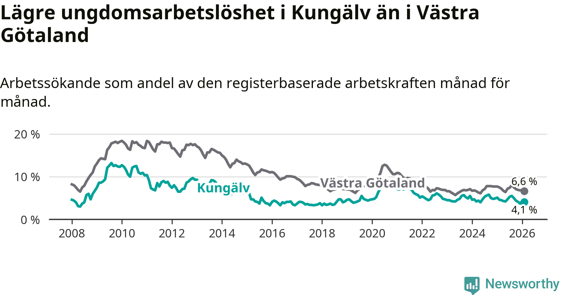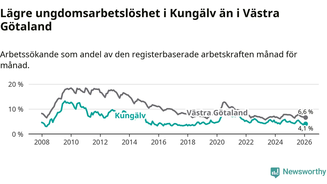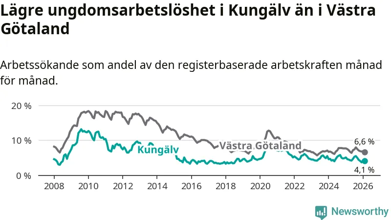 Precis som den totala arbetslösheten ligger ungdomsarbetslösheten i Kungälv lägre än i Västra Götaland som helhet. Skillnaden mellan kommunen och länet är 2,5 procentenheter.