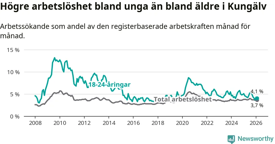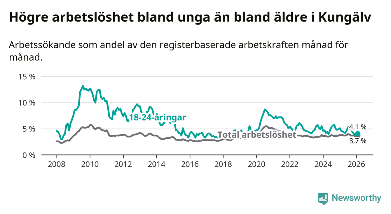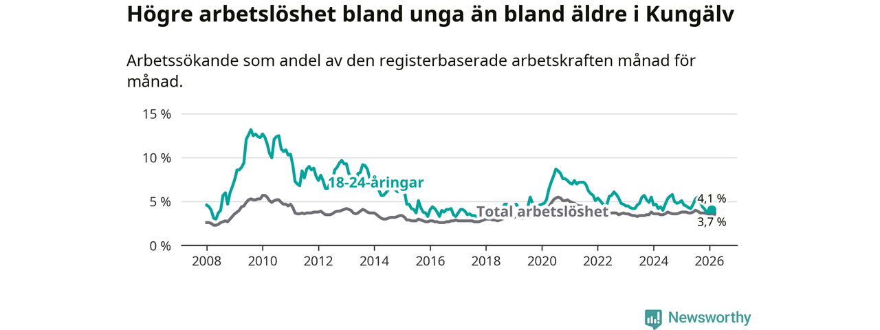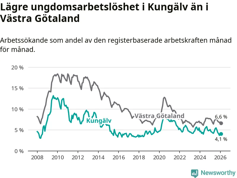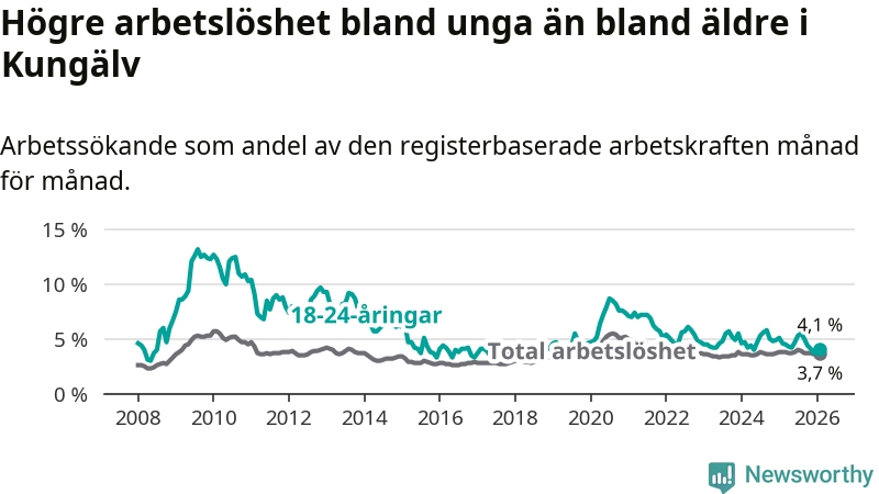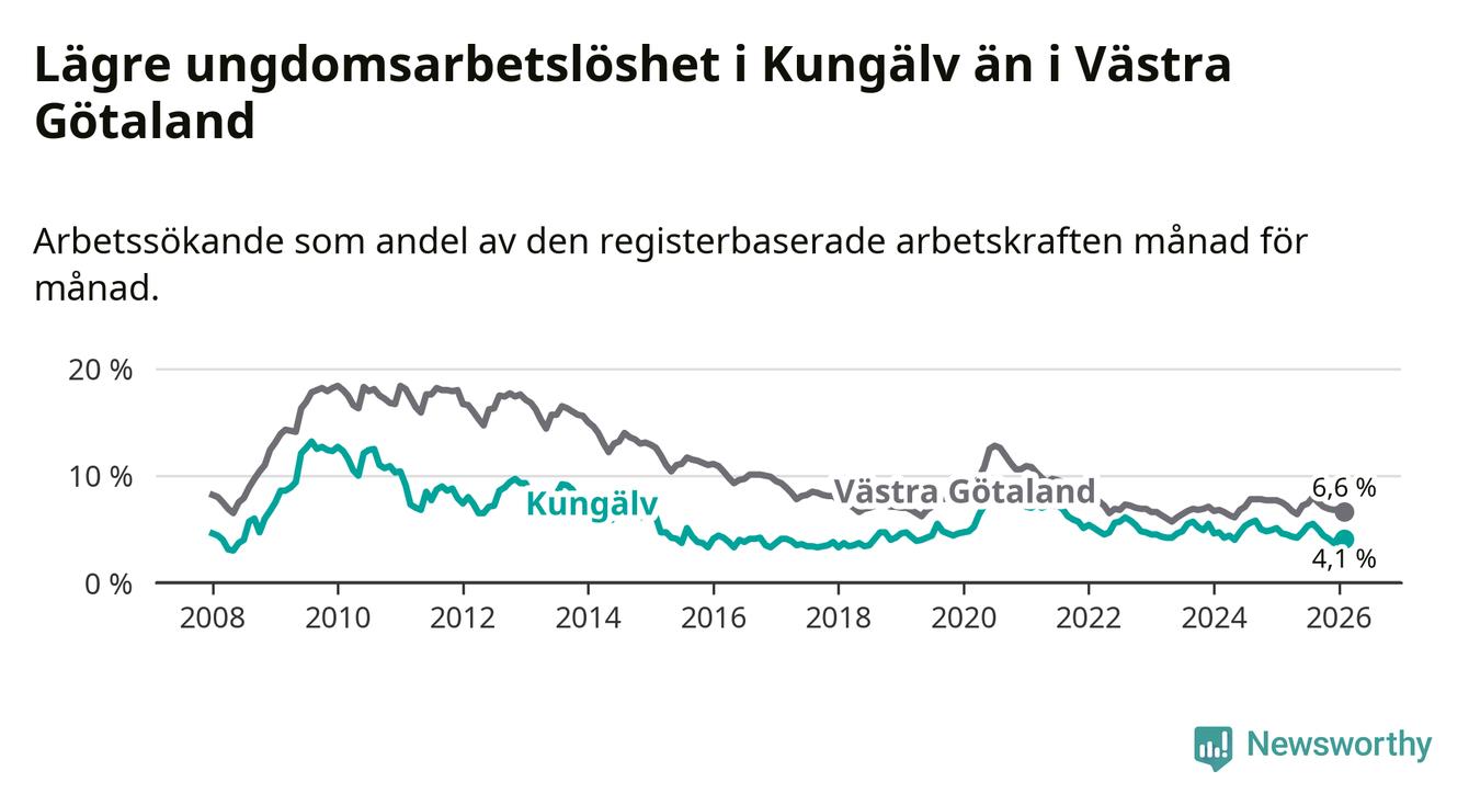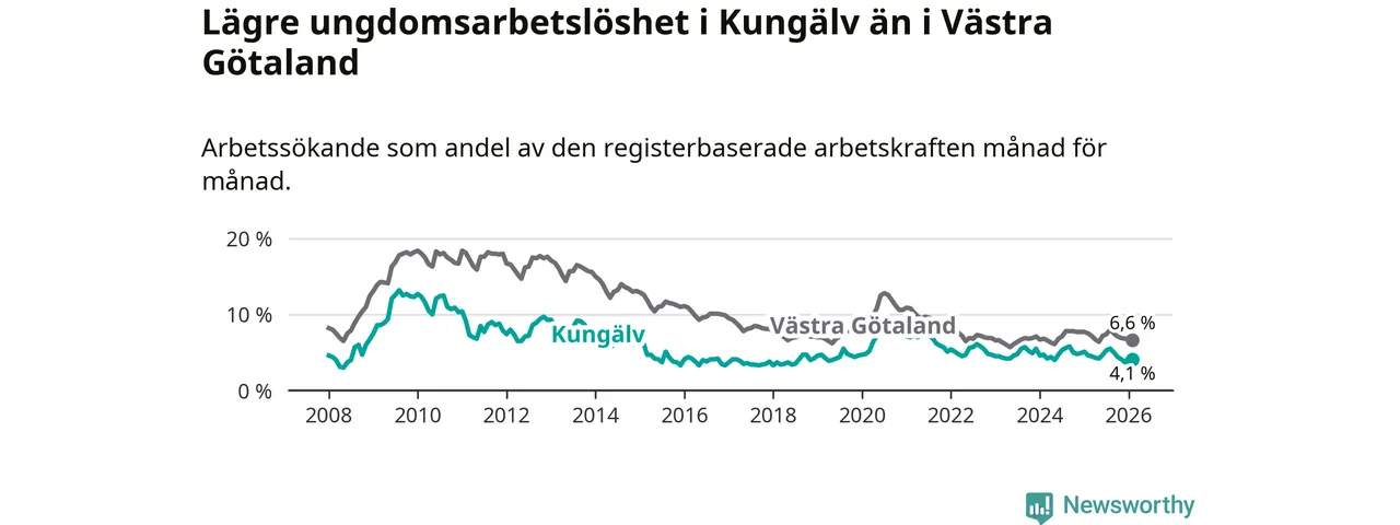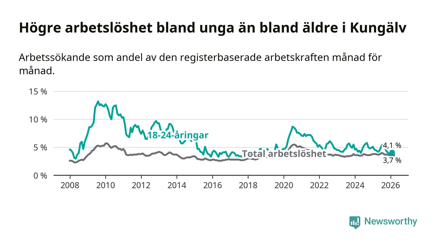 I och med den senaste månadens nedgång har de ungas arbetslöshet i Kungälv sjunkit sju månader i följd (ner från 5,3 procent i juli 2025 till 4,1 procent nu).