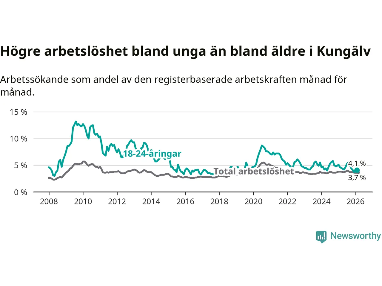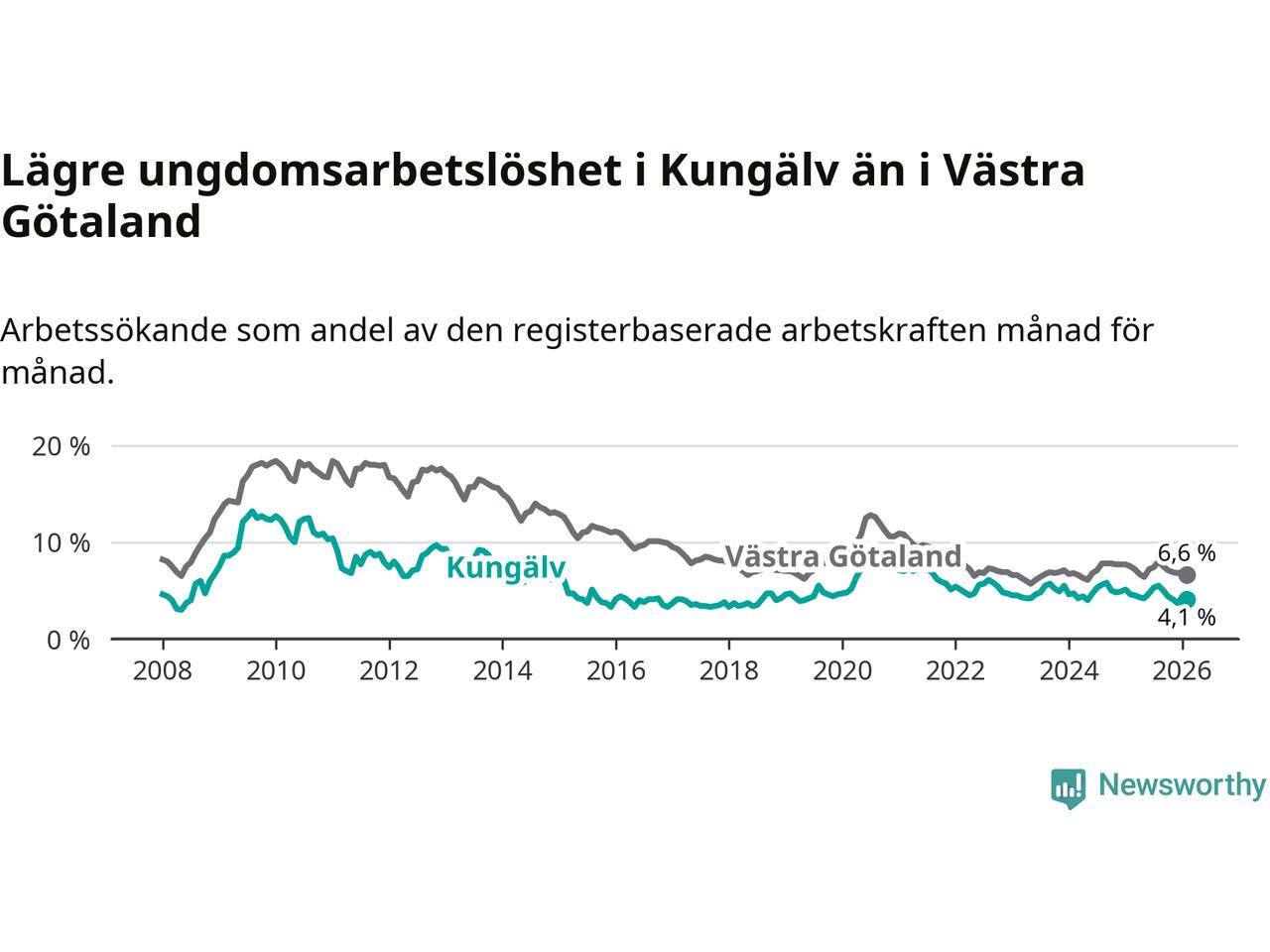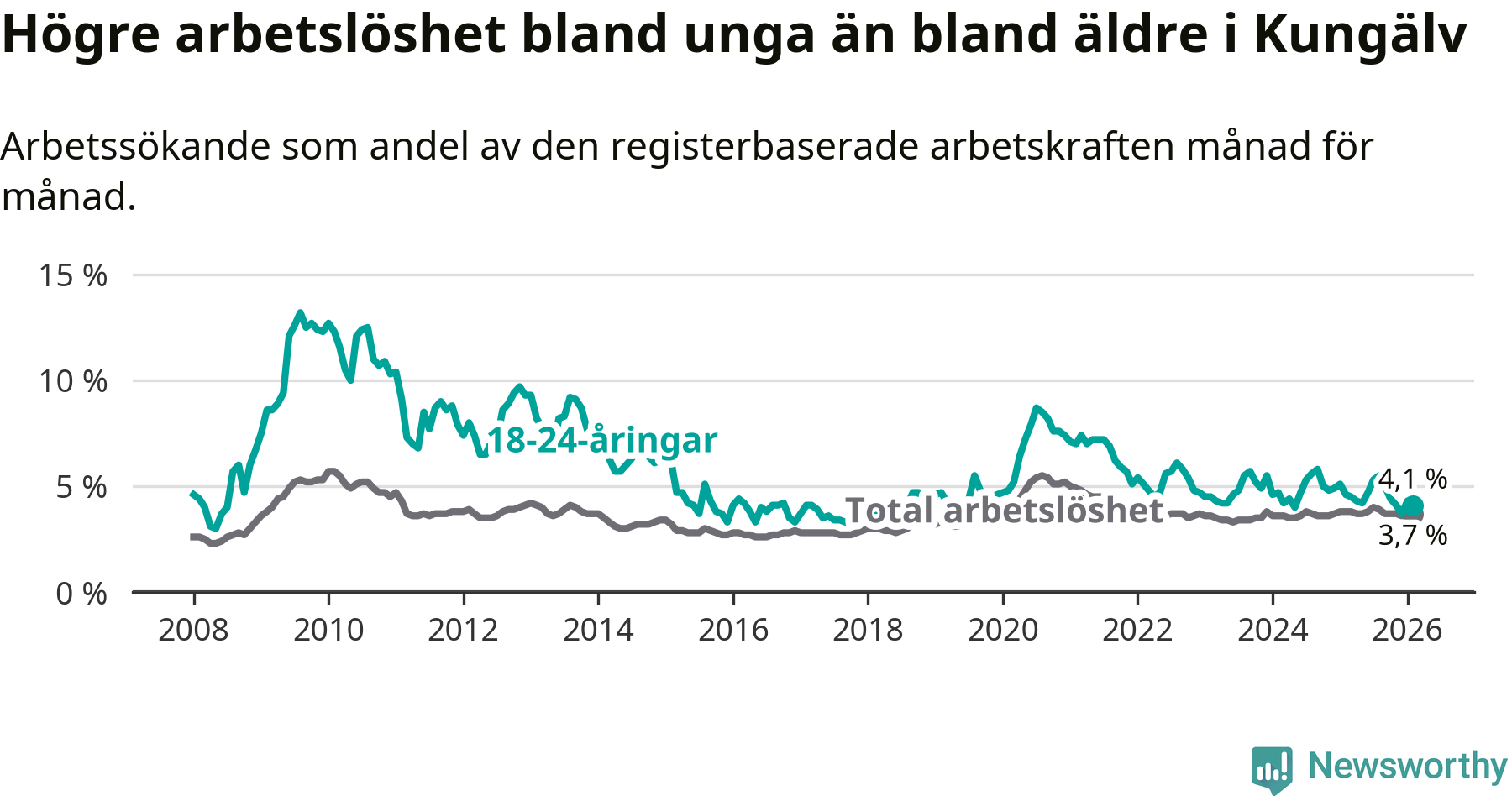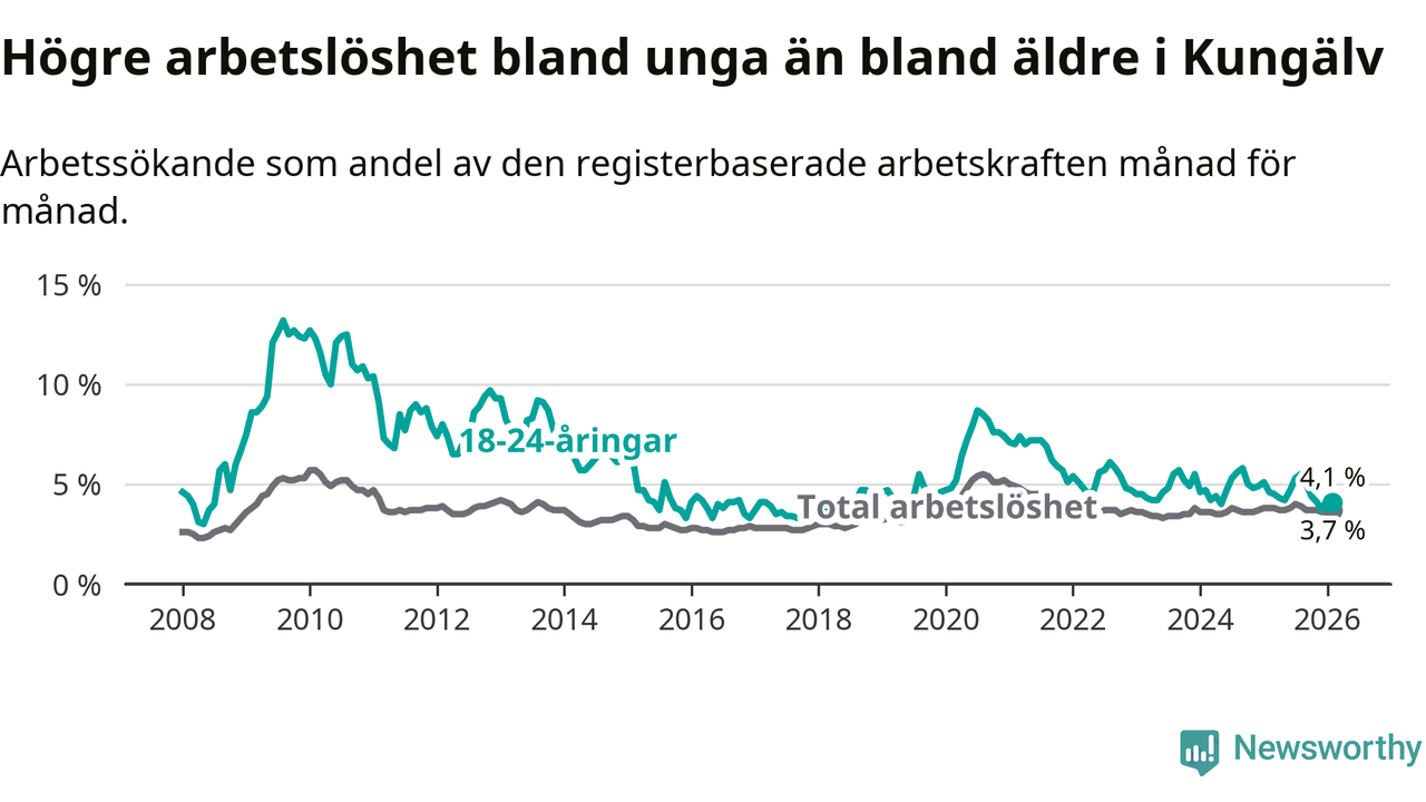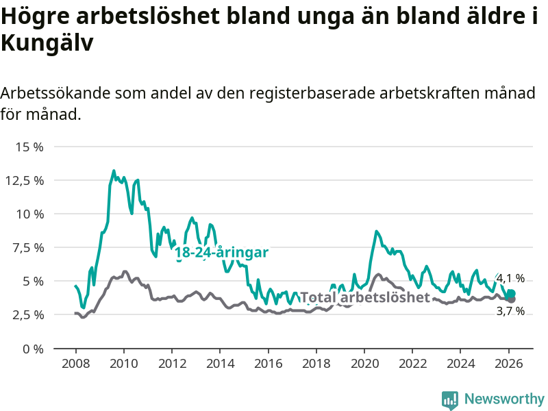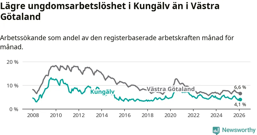 I och med den senaste månadens nedgång har de ungas arbetslöshet i Kungälv sjunkit sju månader i följd (ner från 5,3 procent i juli 2025 till 4,1 procent nu).