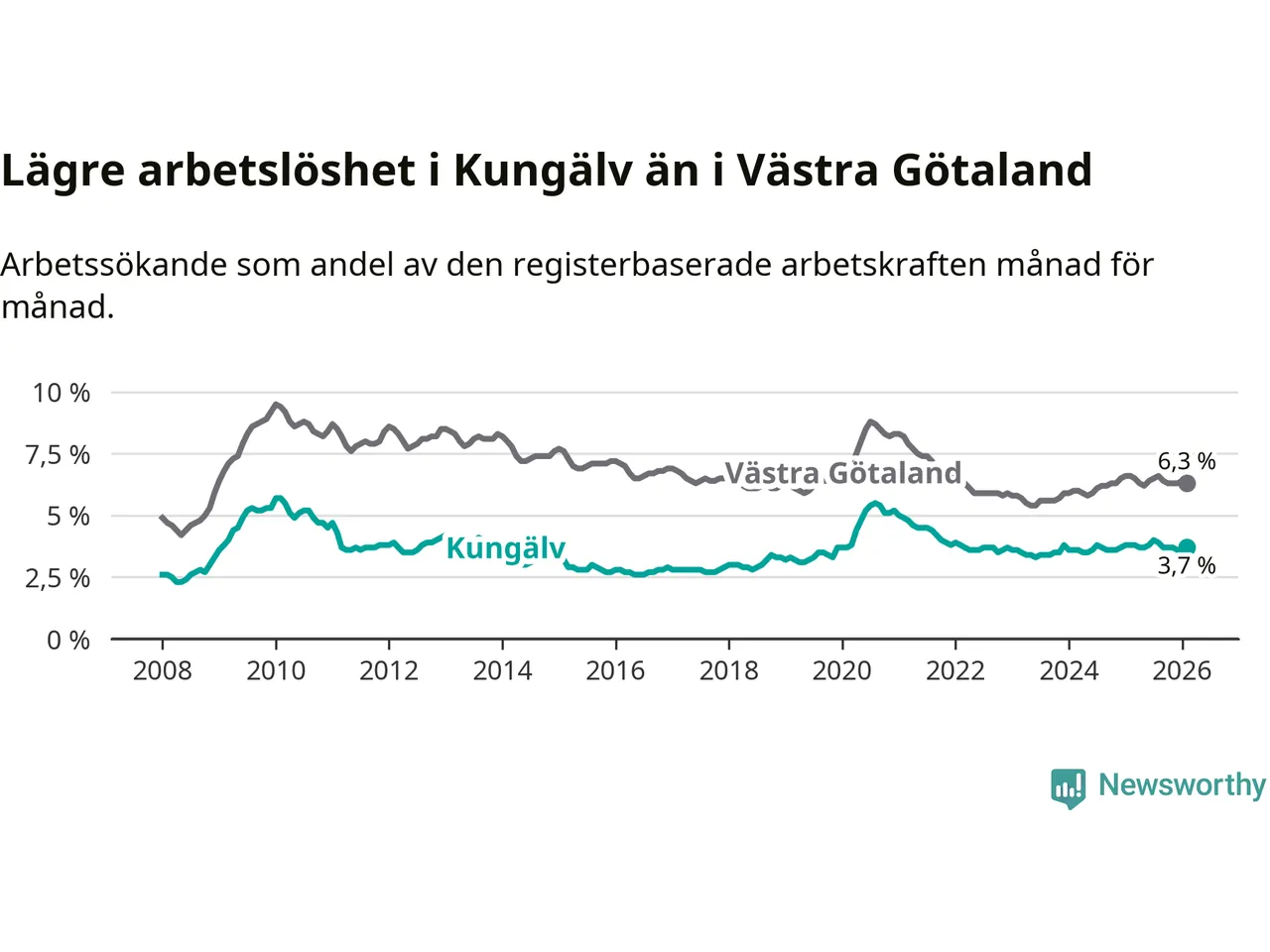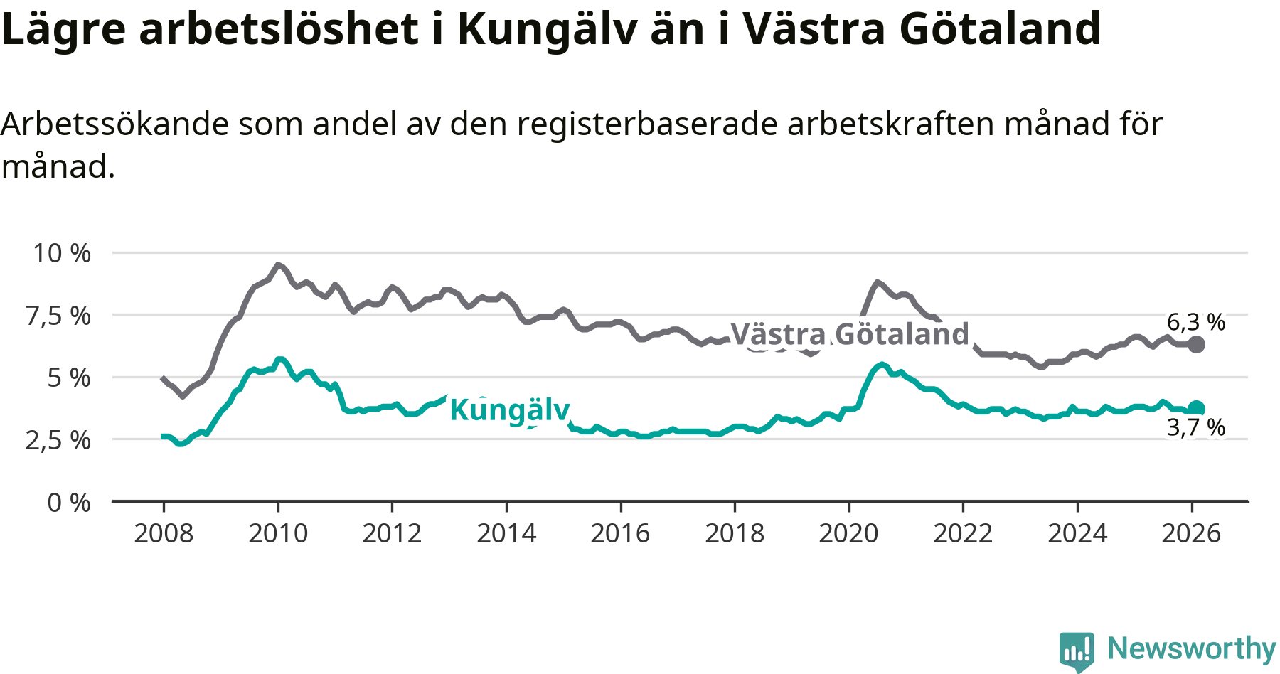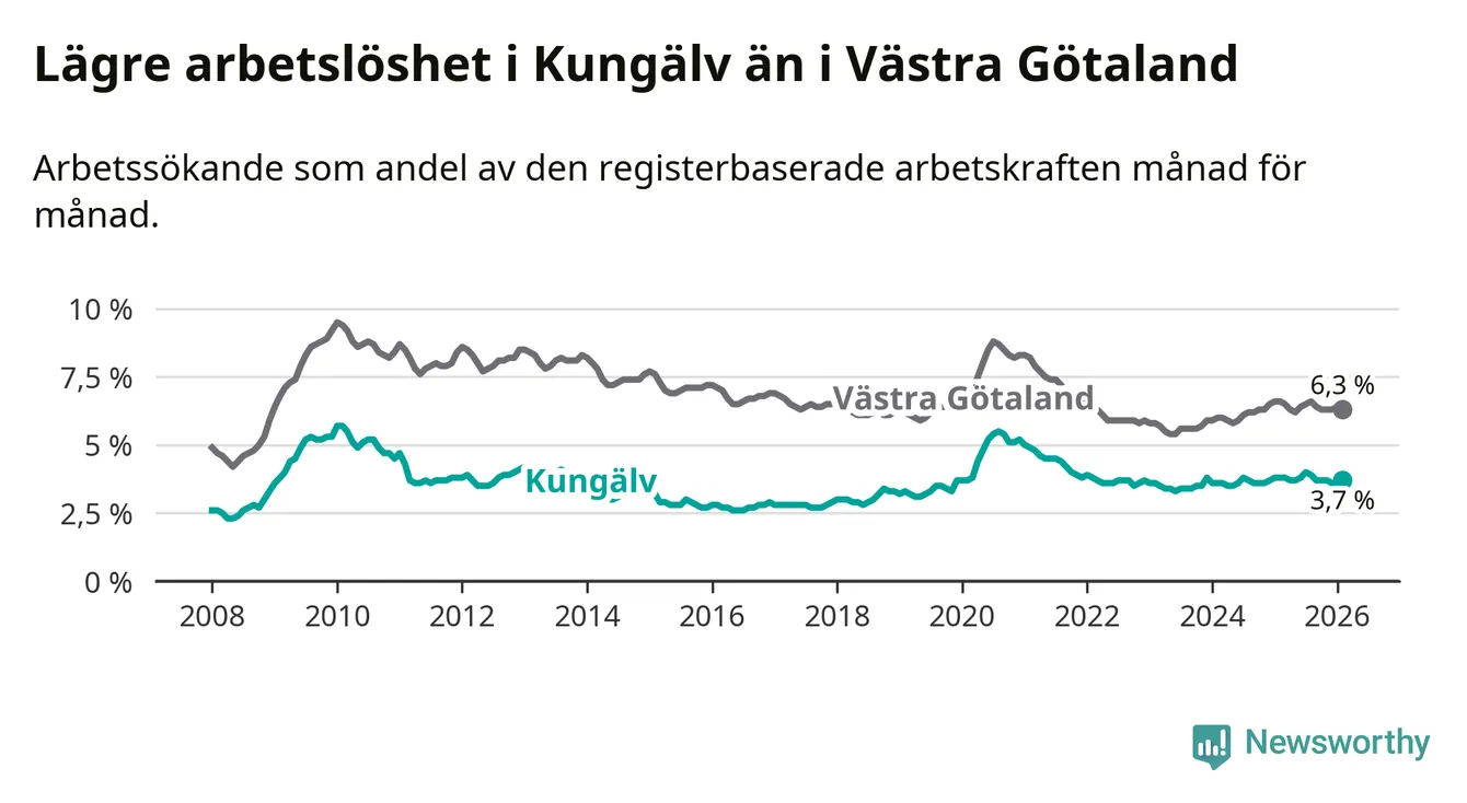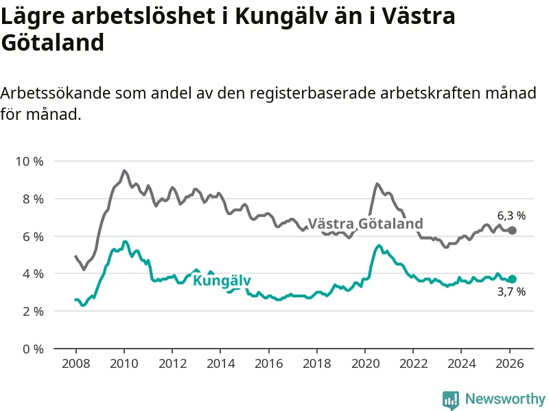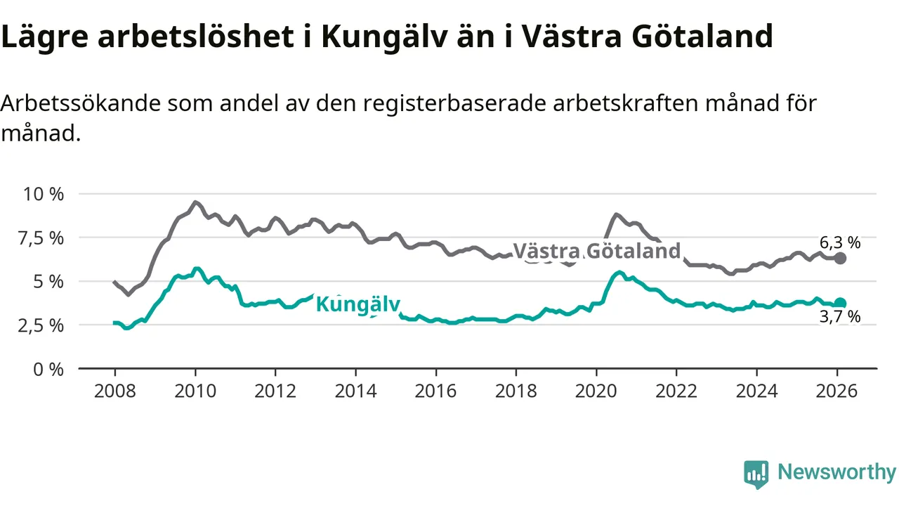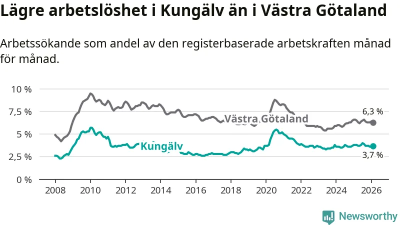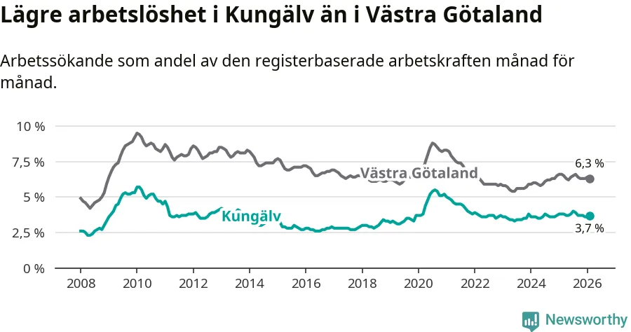 Under februari månad rapporterade Kungälvs kommun en total arbetslöshet på 3,7 procent. Det är en minskning jämfört med samma tidpunkt i fjol (−0,1 procentenheter). Även i Västra Götalands län sjunker arbetslösheten .