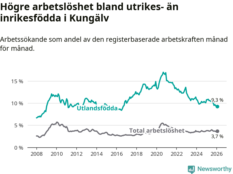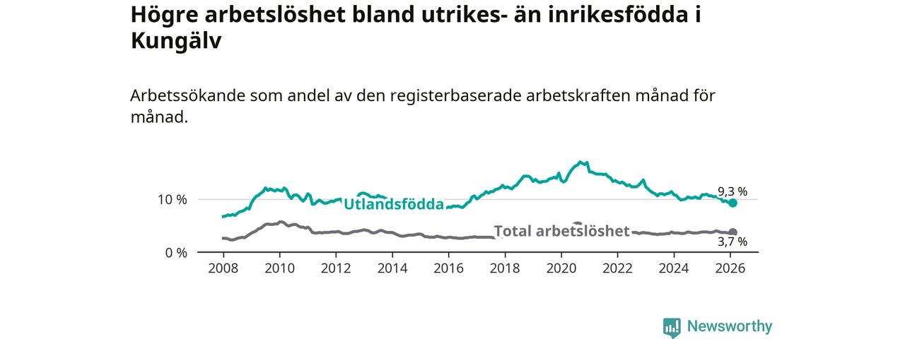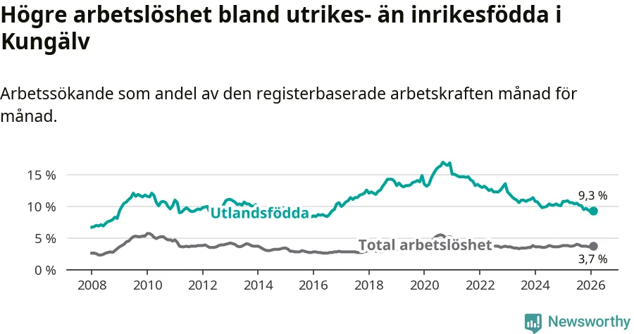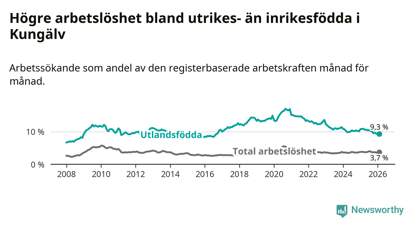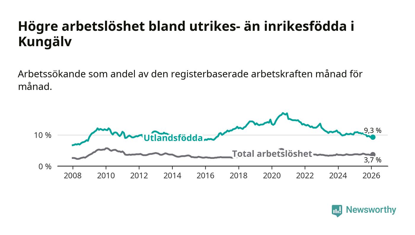 Skillnaden i arbetslöshet mellan utrikesfödda och hela befolkningen är 5,6 procentenheter i Kungälv. Det är en mindre skillnad än för ett år sedan (−1,4 procentenheter).