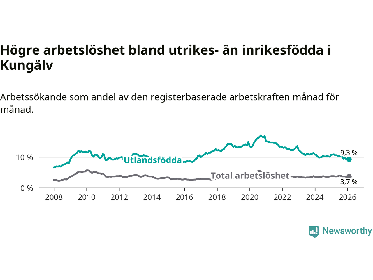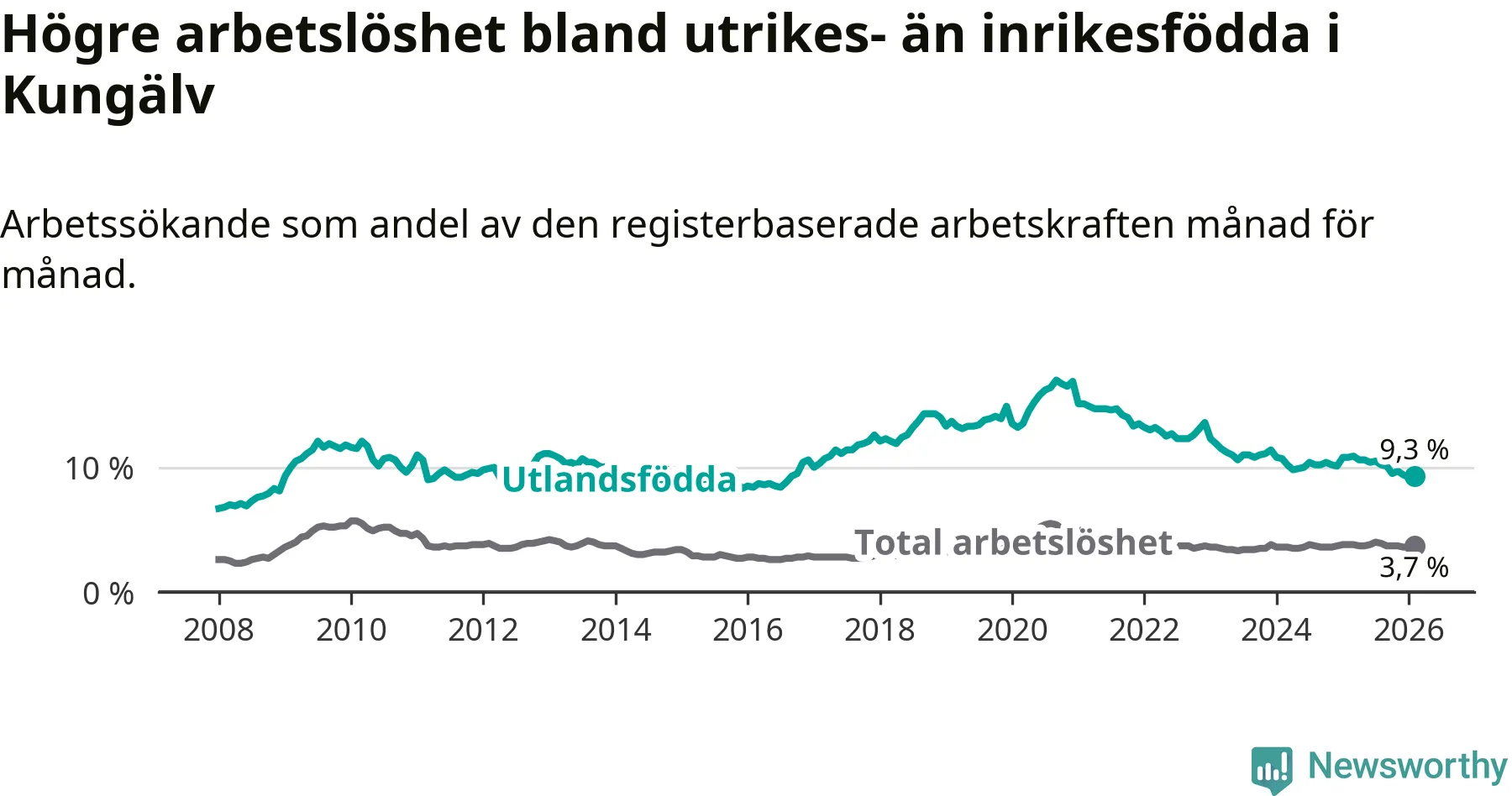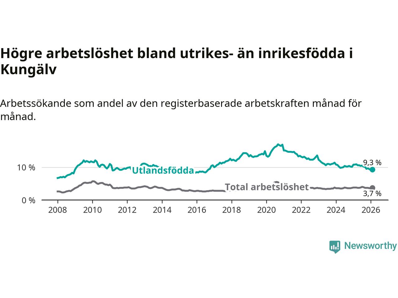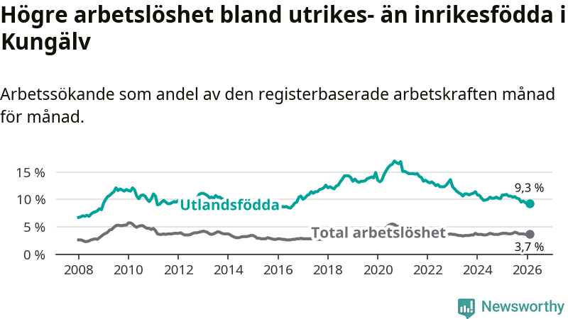 Skillnaden i arbetslöshet mellan utrikesfödda och hela befolkningen är 5,6 procentenheter i Kungälv. Det är en mindre skillnad än för ett år sedan (−1,4 procentenheter).