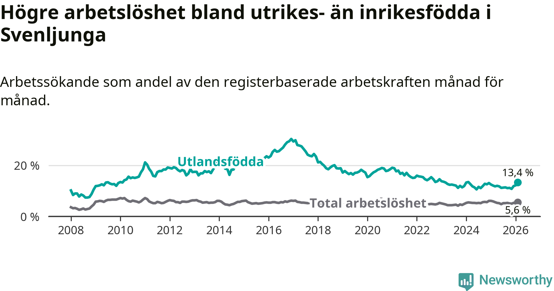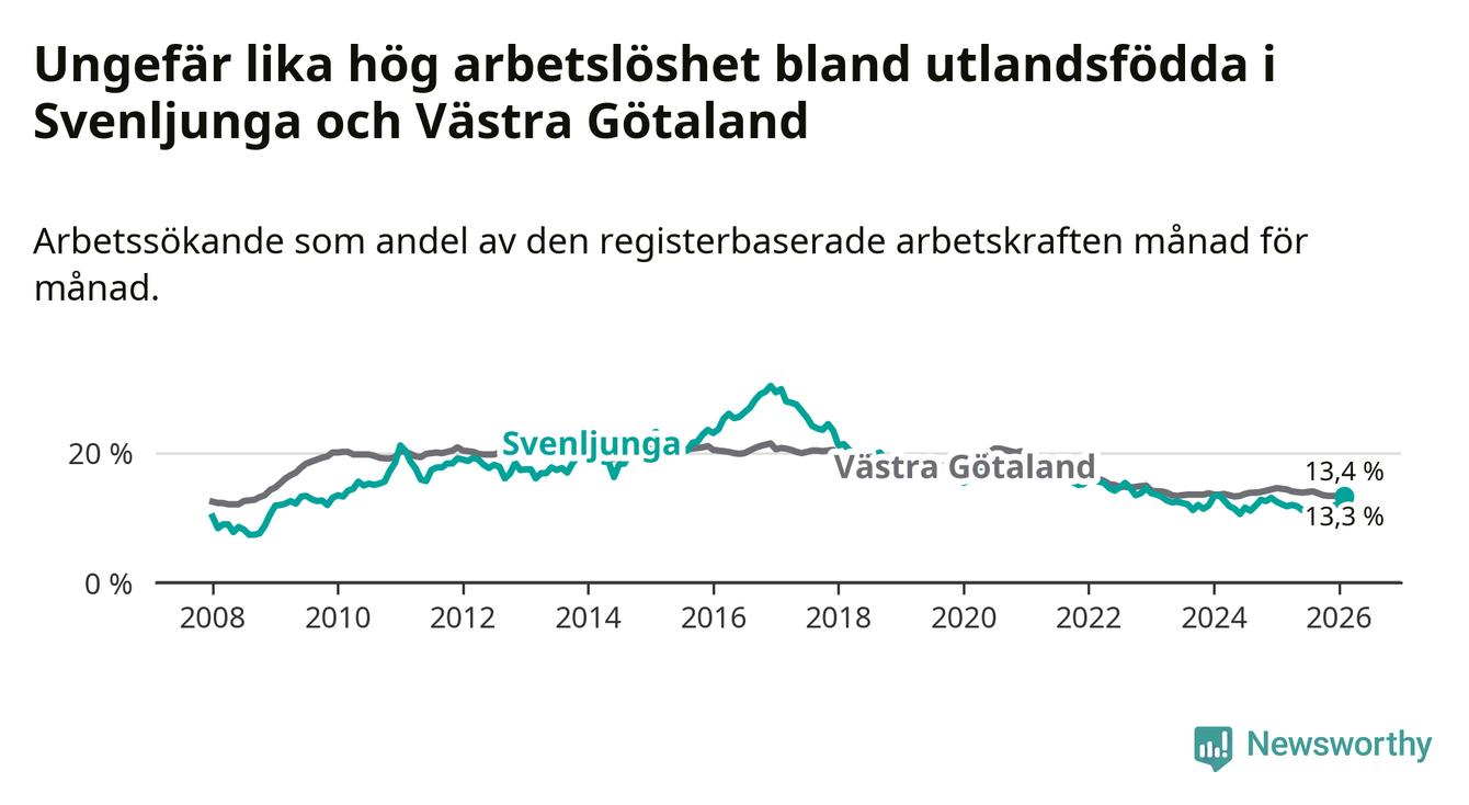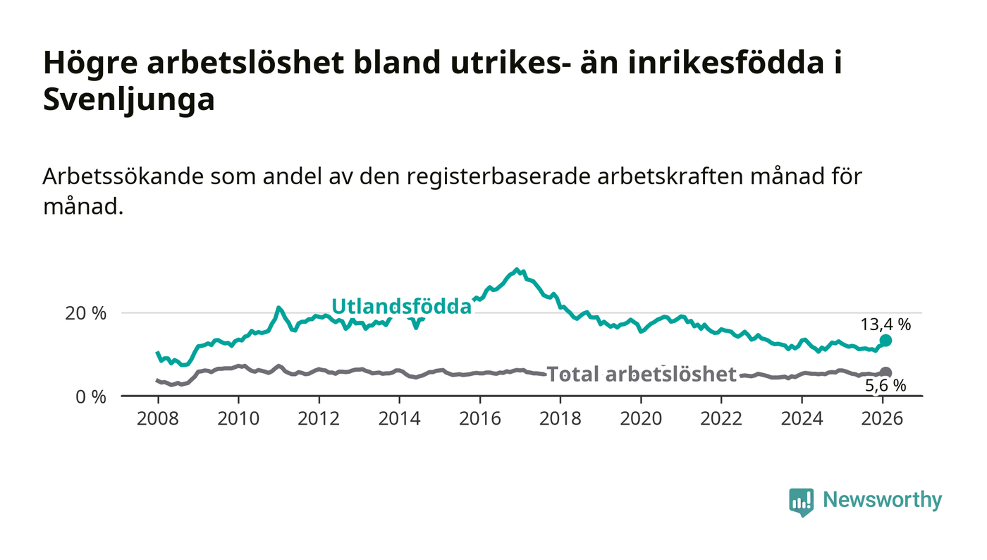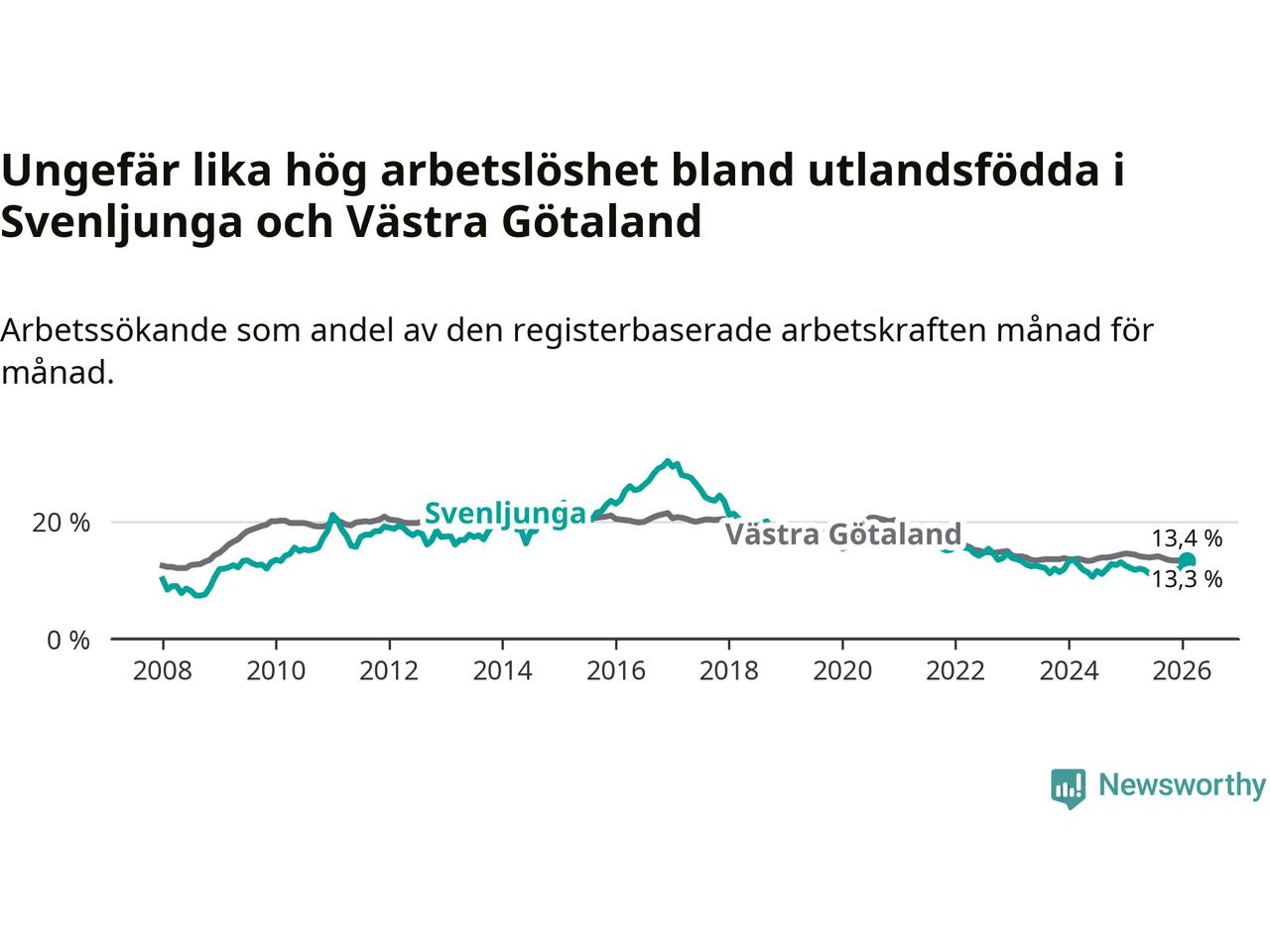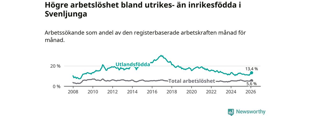 Arbetslösheten bland utlandsfödda var 13,4 procent i Svenljunga under februari månad, motsvarande 114 av 851 personer. Det är 1,3 procentenheter fler än vid samma tidpunkt i fjol (+10 om man räknar personer). Den senaste månadens uppgång innebär ett trendbrott. Under de fem föregående månaderna hade arbetslösheten bland utlandsfödda varit lägre än motsvarande tidpunkt året innan.