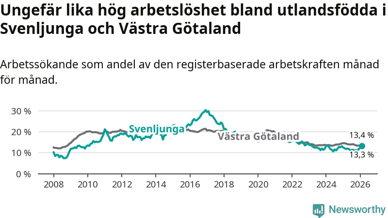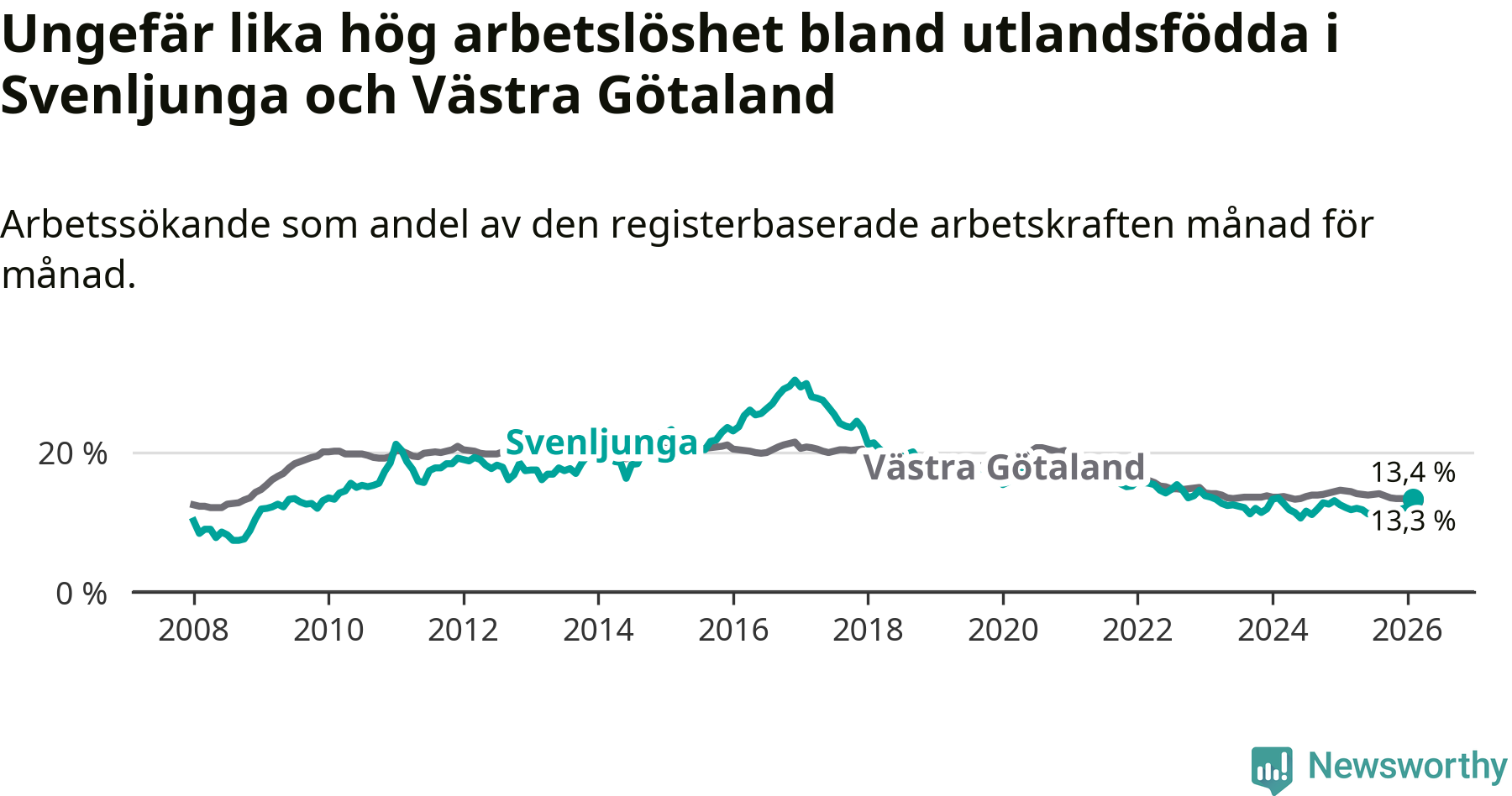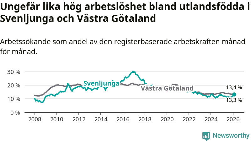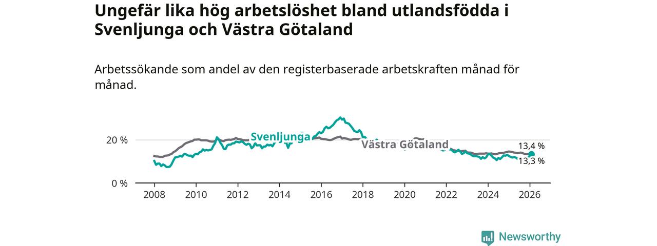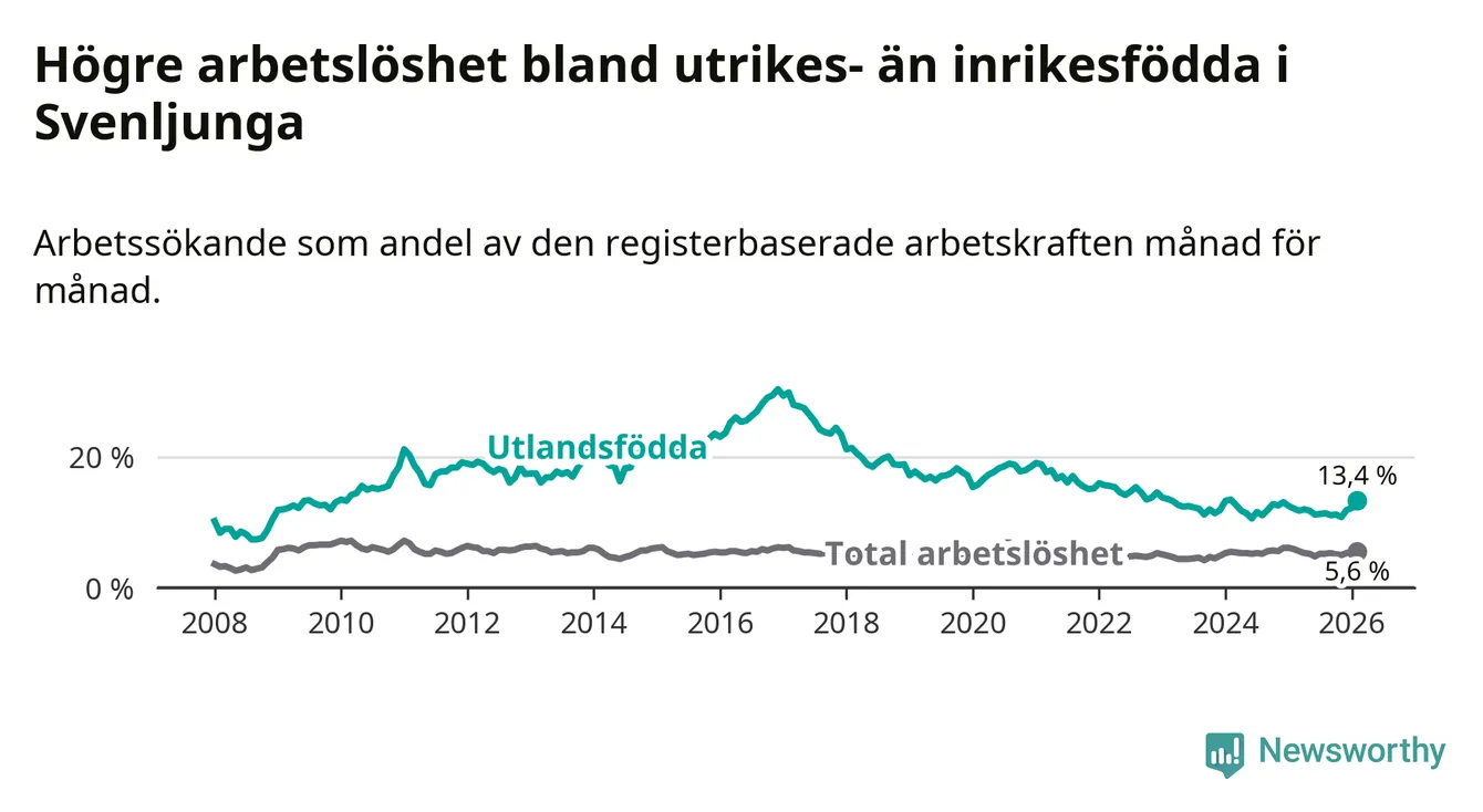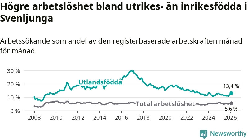 Arbetslösheten bland utlandsfödda var 13,4 procent i Svenljunga under februari månad, motsvarande 114 av 851 personer. Det är 1,3 procentenheter fler än vid samma tidpunkt i fjol (+10 om man räknar personer). Den senaste månadens uppgång innebär ett trendbrott. Under de fem föregående månaderna hade arbetslösheten bland utlandsfödda varit lägre än motsvarande tidpunkt året innan.