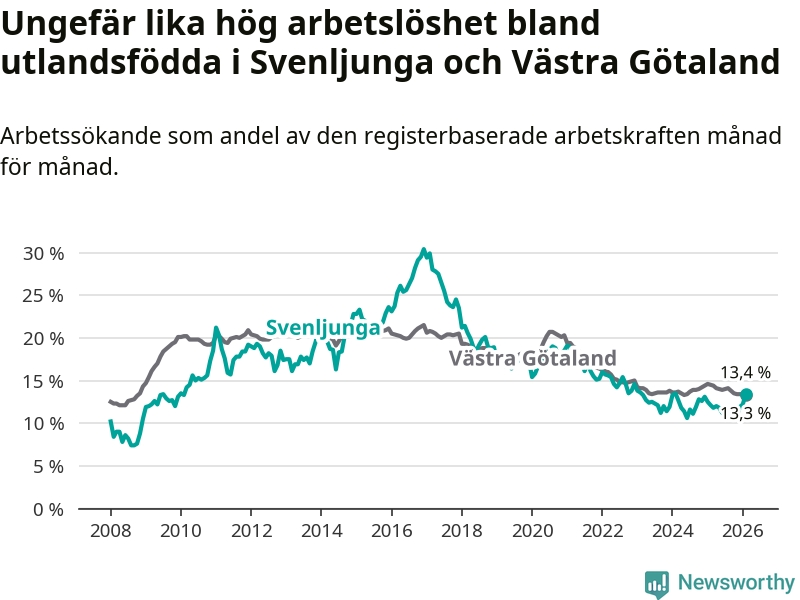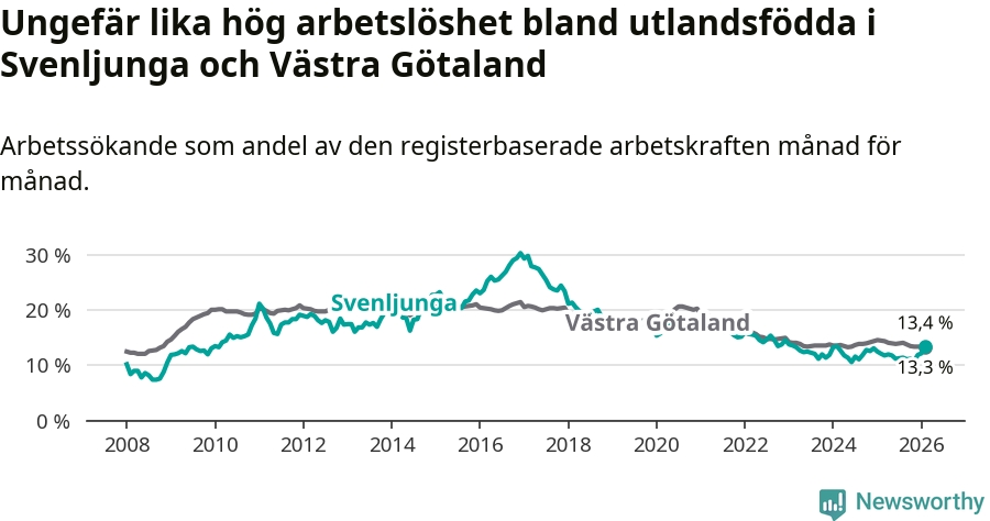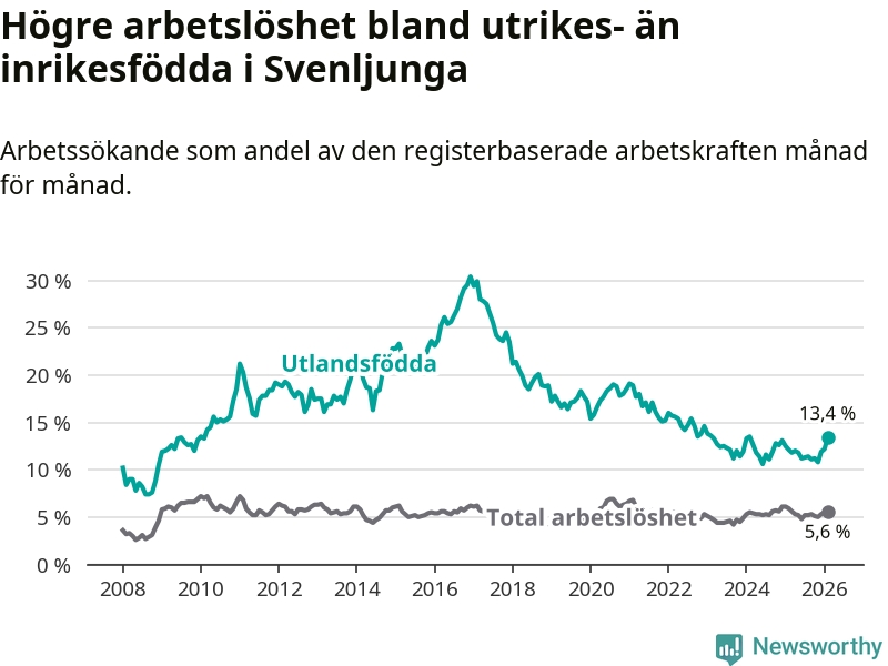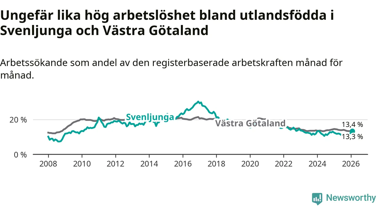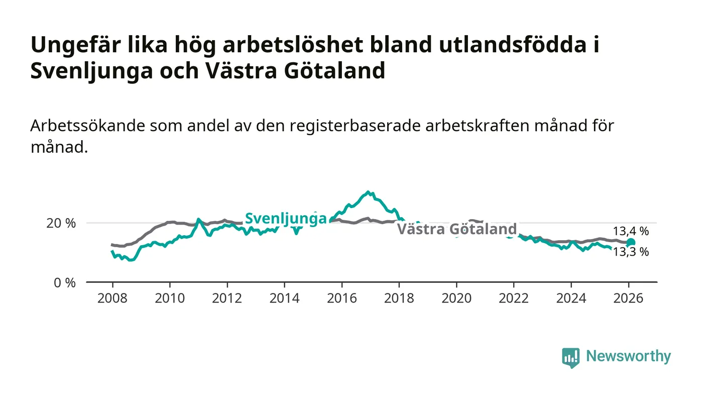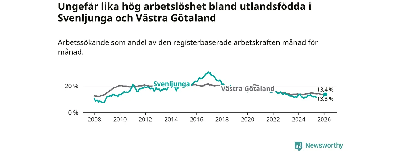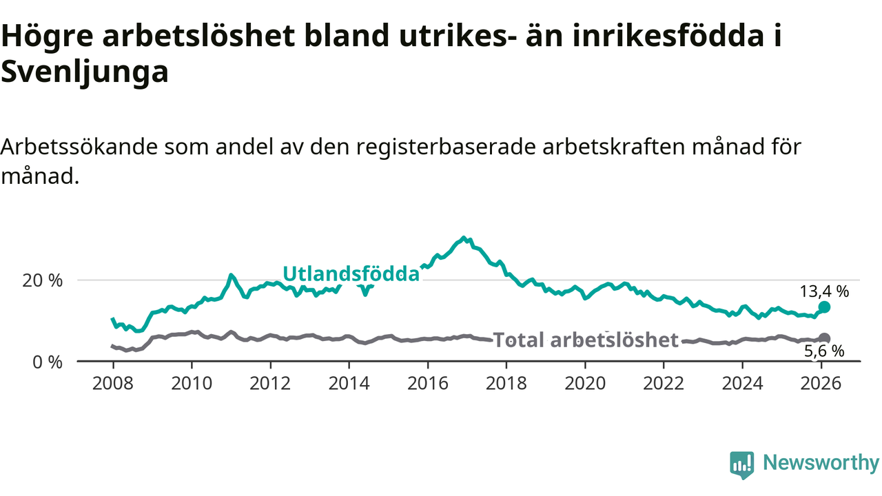 Arbetslösheten bland utlandsfödda var 13,4 procent i Svenljunga under februari månad, motsvarande 114 av 851 personer. Det är 1,3 procentenheter fler än vid samma tidpunkt i fjol (+10 om man räknar personer). Den senaste månadens uppgång innebär ett trendbrott. Under de fem föregående månaderna hade arbetslösheten bland utlandsfödda varit lägre än motsvarande tidpunkt året innan.