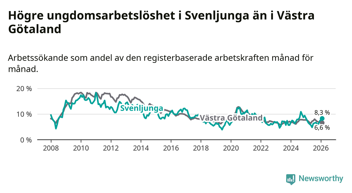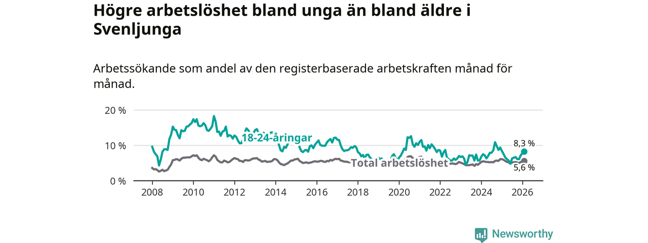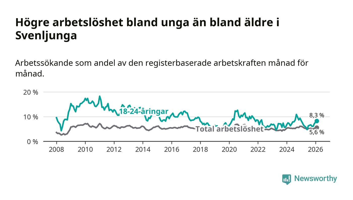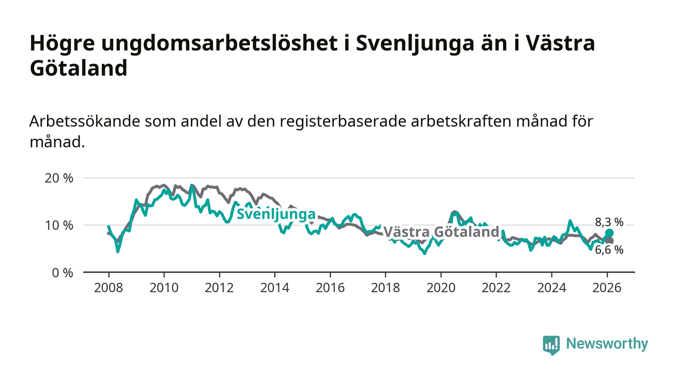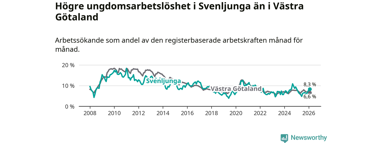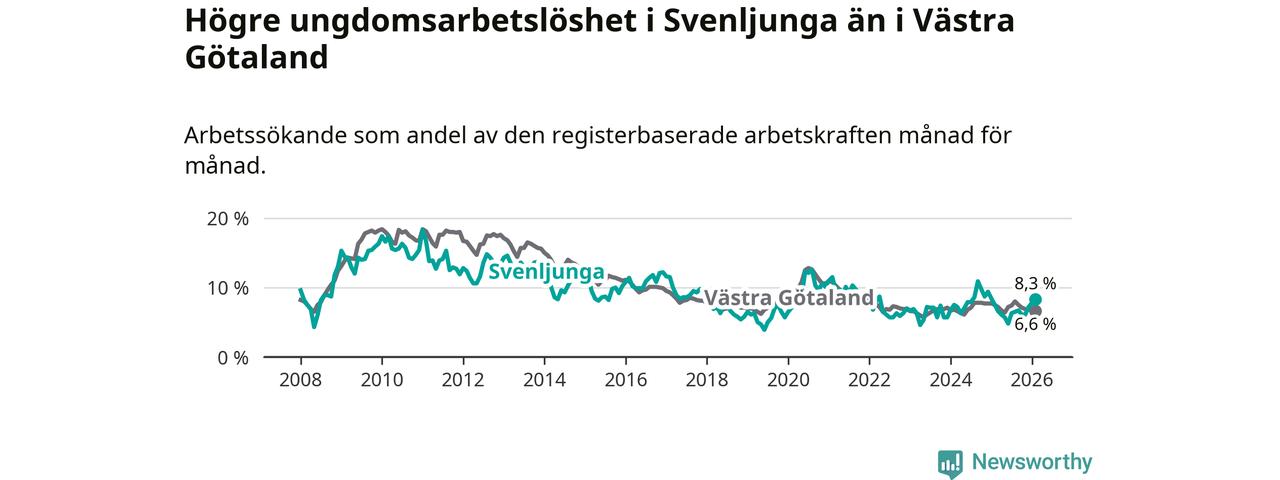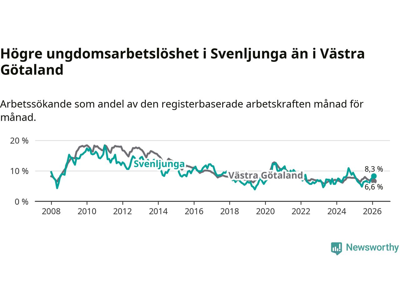 Medan Svenljunga har lägre total arbetslöshet än Västra Götaland, ligger ungdomsarbetslösheten 1,7 procentenheter högre i Svenljunga.