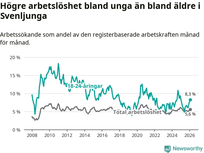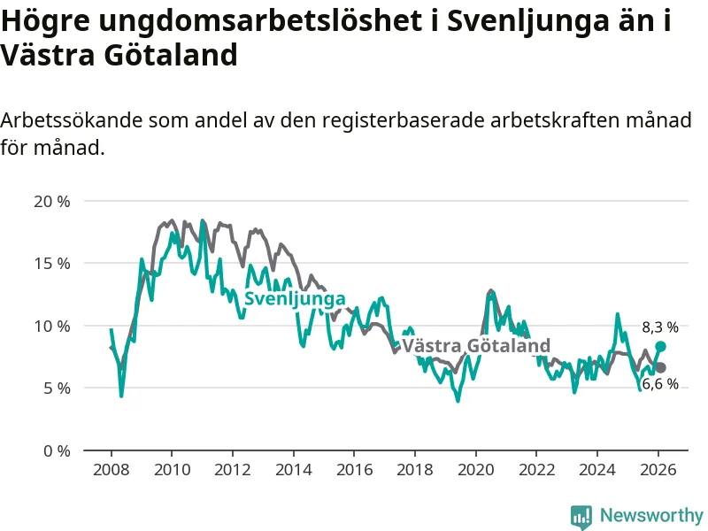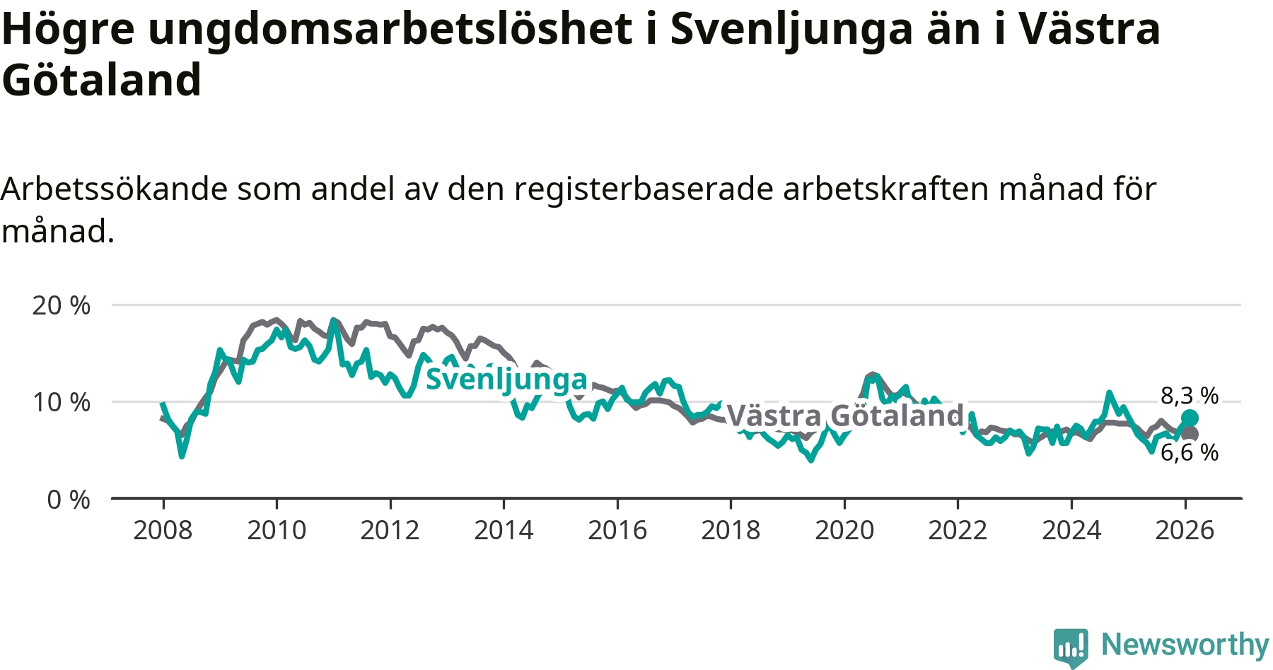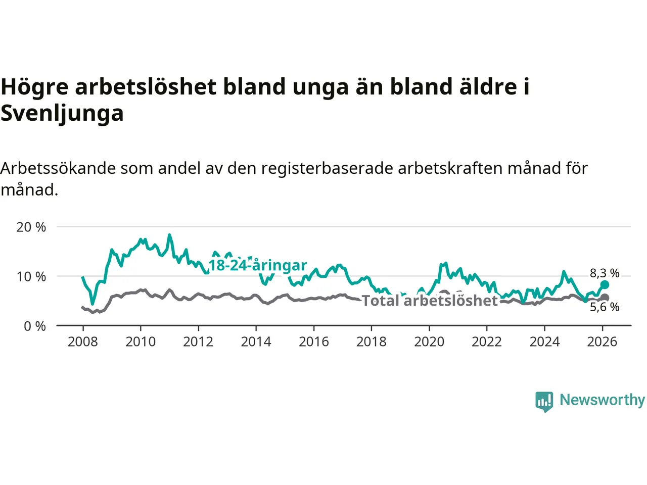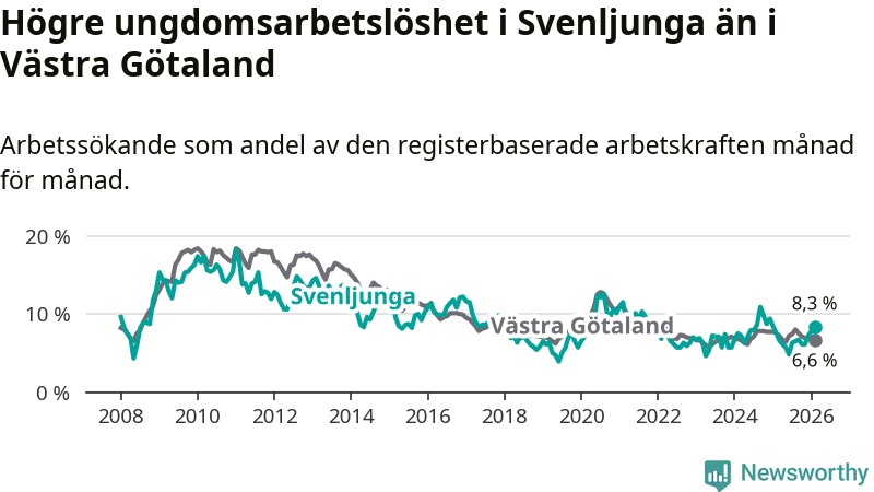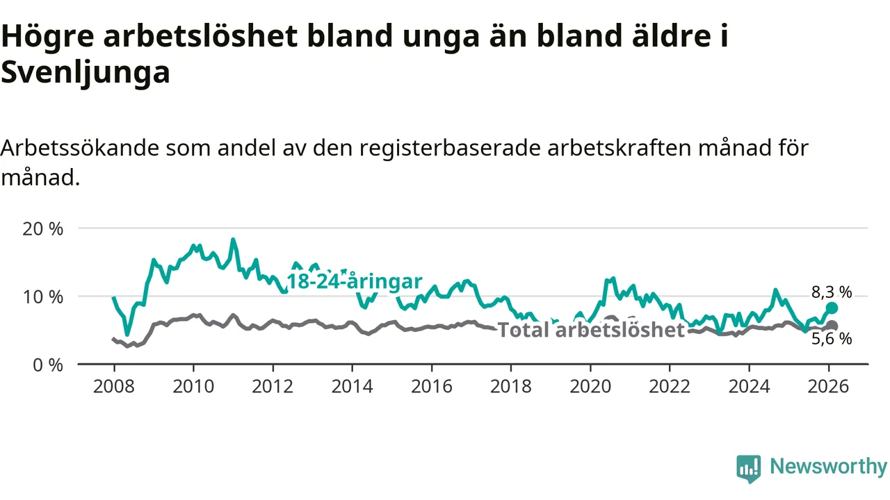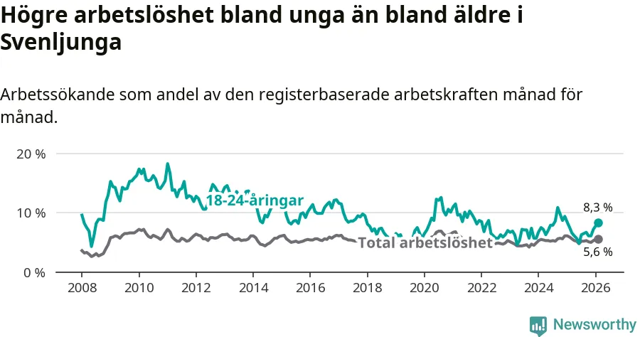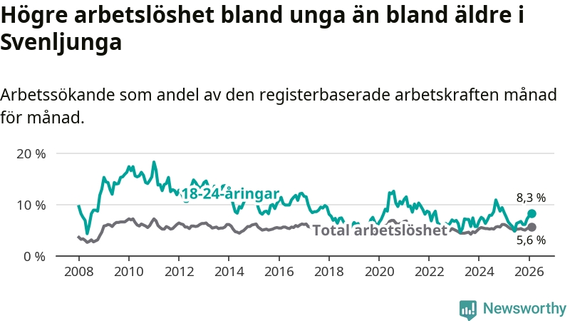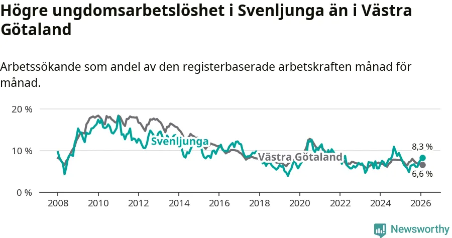 Medan Svenljunga har lägre total arbetslöshet än Västra Götaland, ligger ungdomsarbetslösheten 1,7 procentenheter högre i Svenljunga.