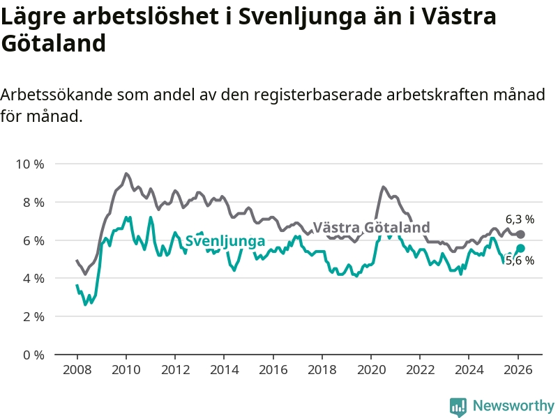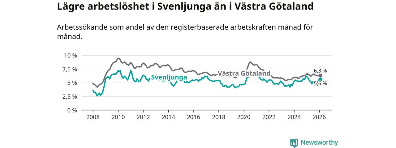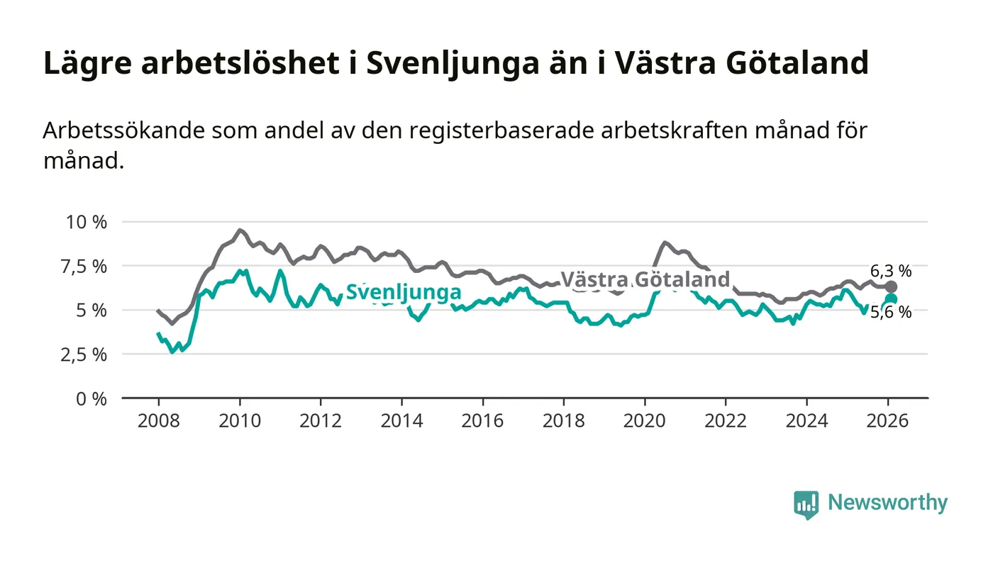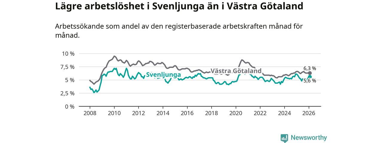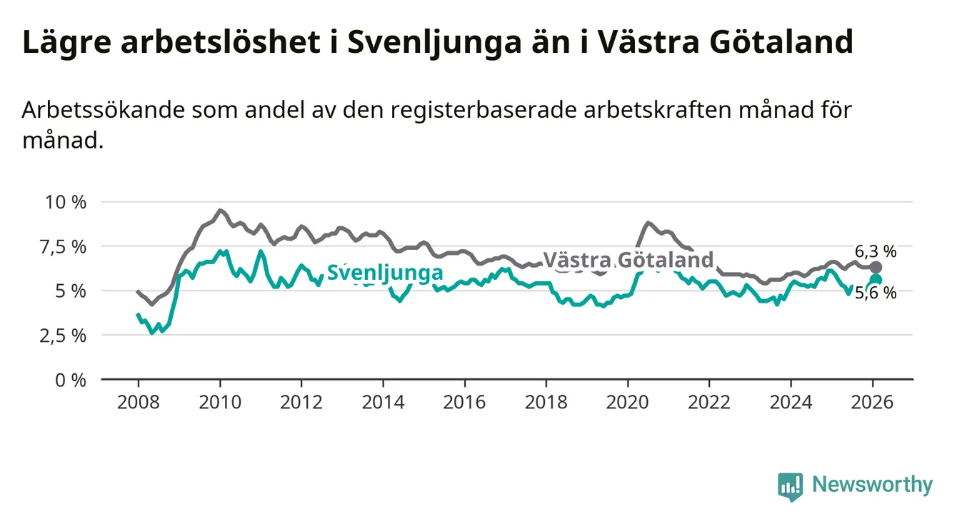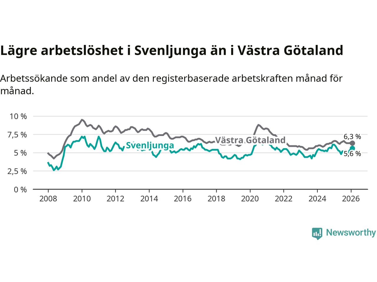 Anmärkningsvärt är att arbetslösheten nu, för första gången sedan augusti 2022, är högre i Svenljunga än snittet i Västra Götaland, även om skillnaden bara är 0,1 procentenheter.