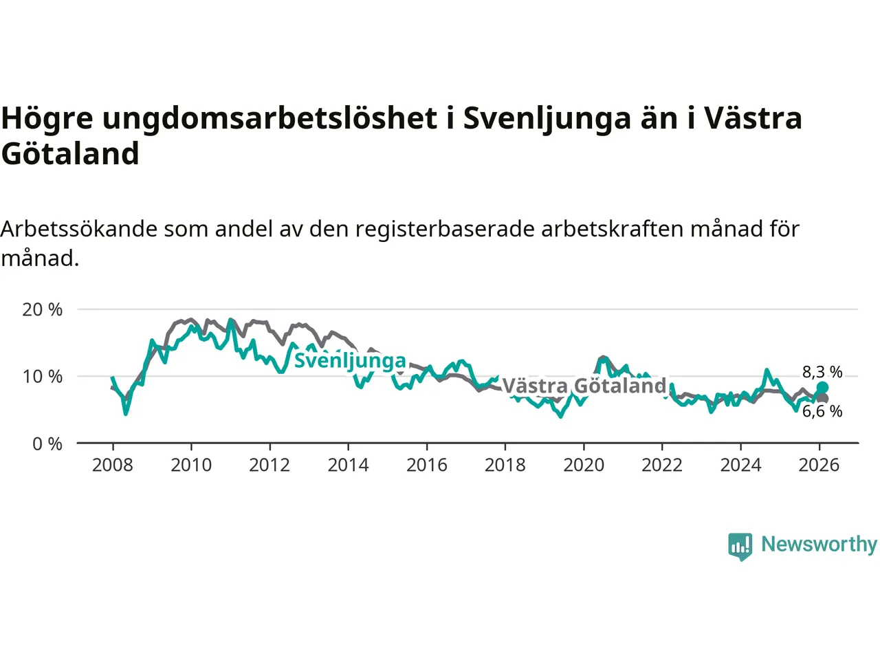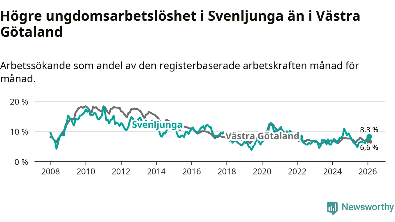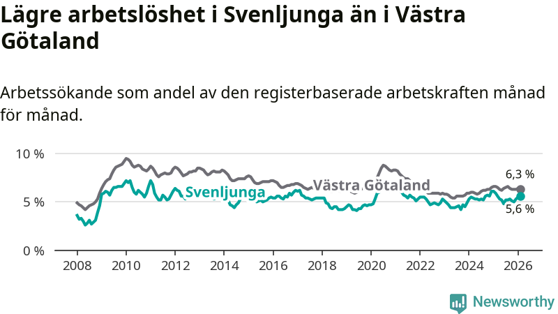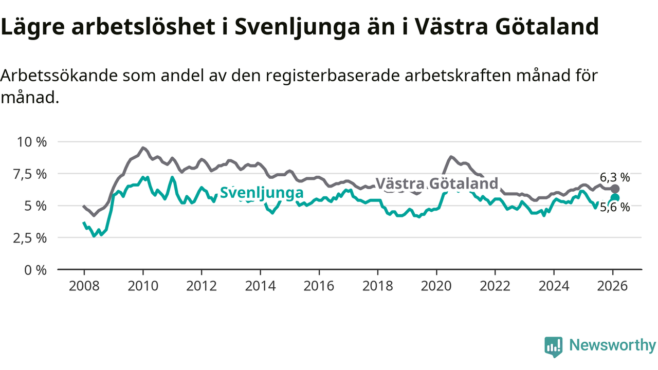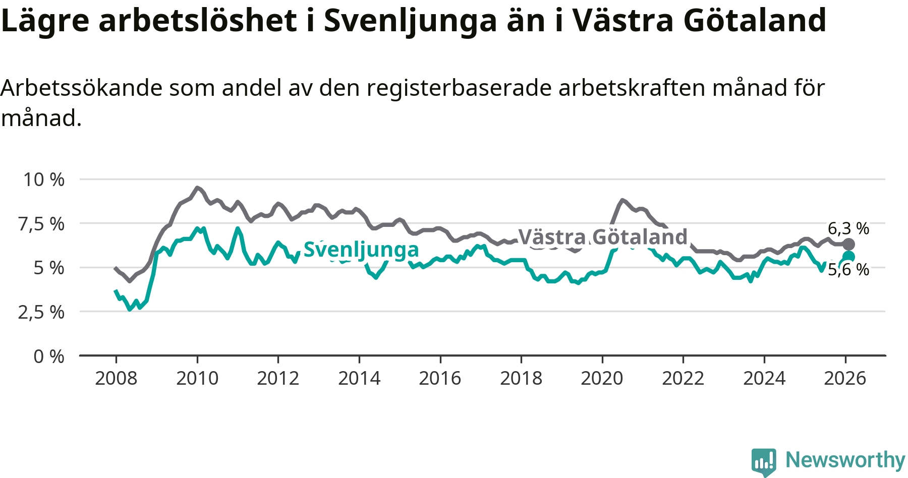 Anmärkningsvärt är att arbetslösheten nu, för första gången sedan augusti 2022, är högre i Svenljunga än snittet i Västra Götaland, även om skillnaden bara är 0,1 procentenheter.