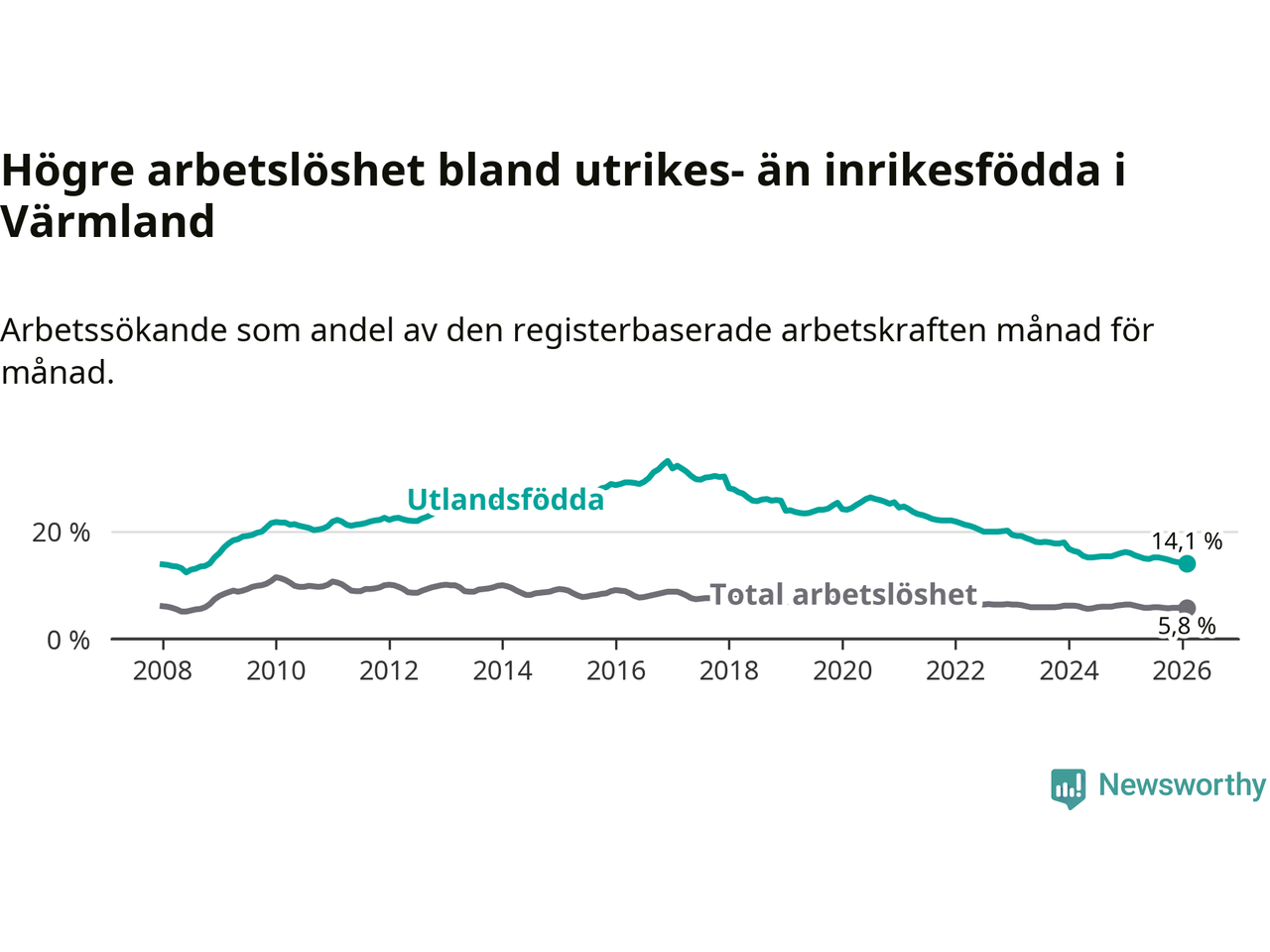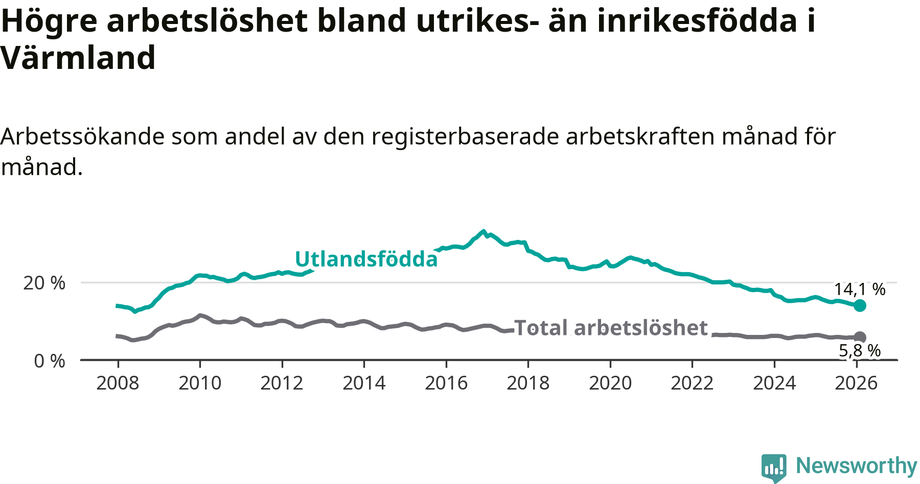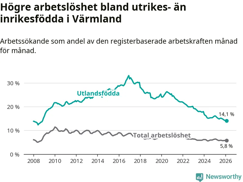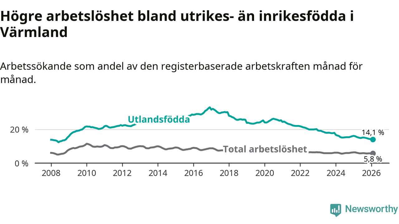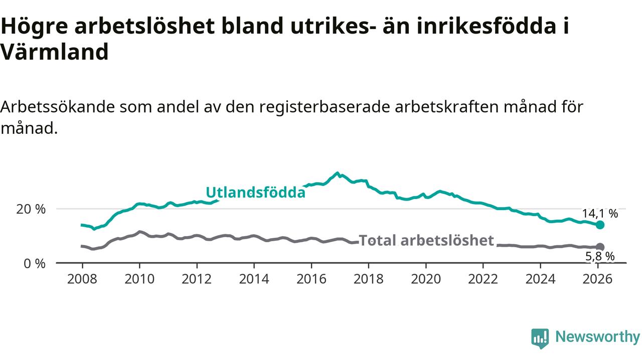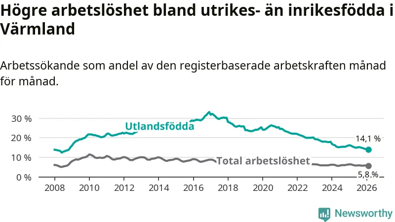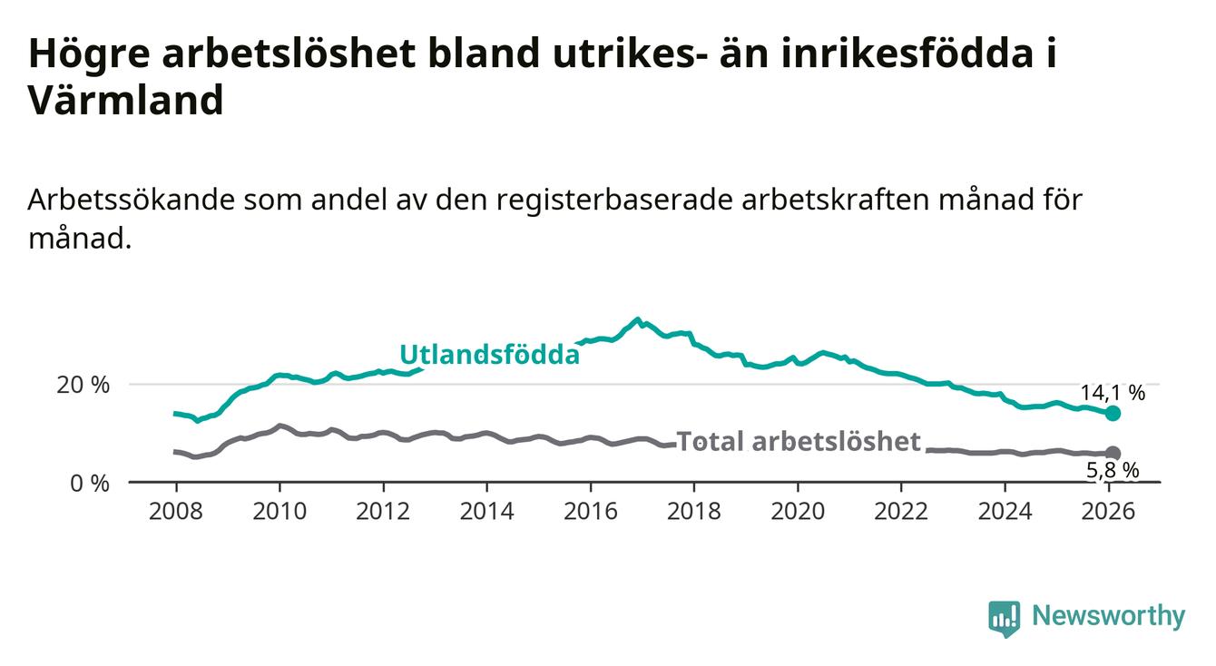Arbetslösheten bland utlandsfödda var 14,1 procent i Värmland under februari månad, motsvarande 3 093 av 21 936 personer. Det är 1,9 procentenheter färre än vid samma tidpunkt i fjol (−371 om man räknar personer). Därmed har de utlandsföddas arbetslöshet varit lägre än vid samma tidpunkt i fjol i över fem år i sträck. Sedan februari 2021 har arbetslösheten bland utlandsfödda minskat från 24,7 till 14,1 procent. Den nuvarande arbetslöshetsnivån är den lägsta sedan november 2008.