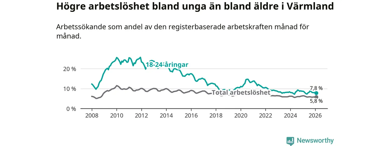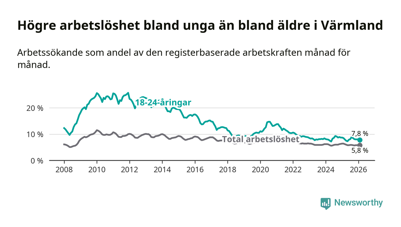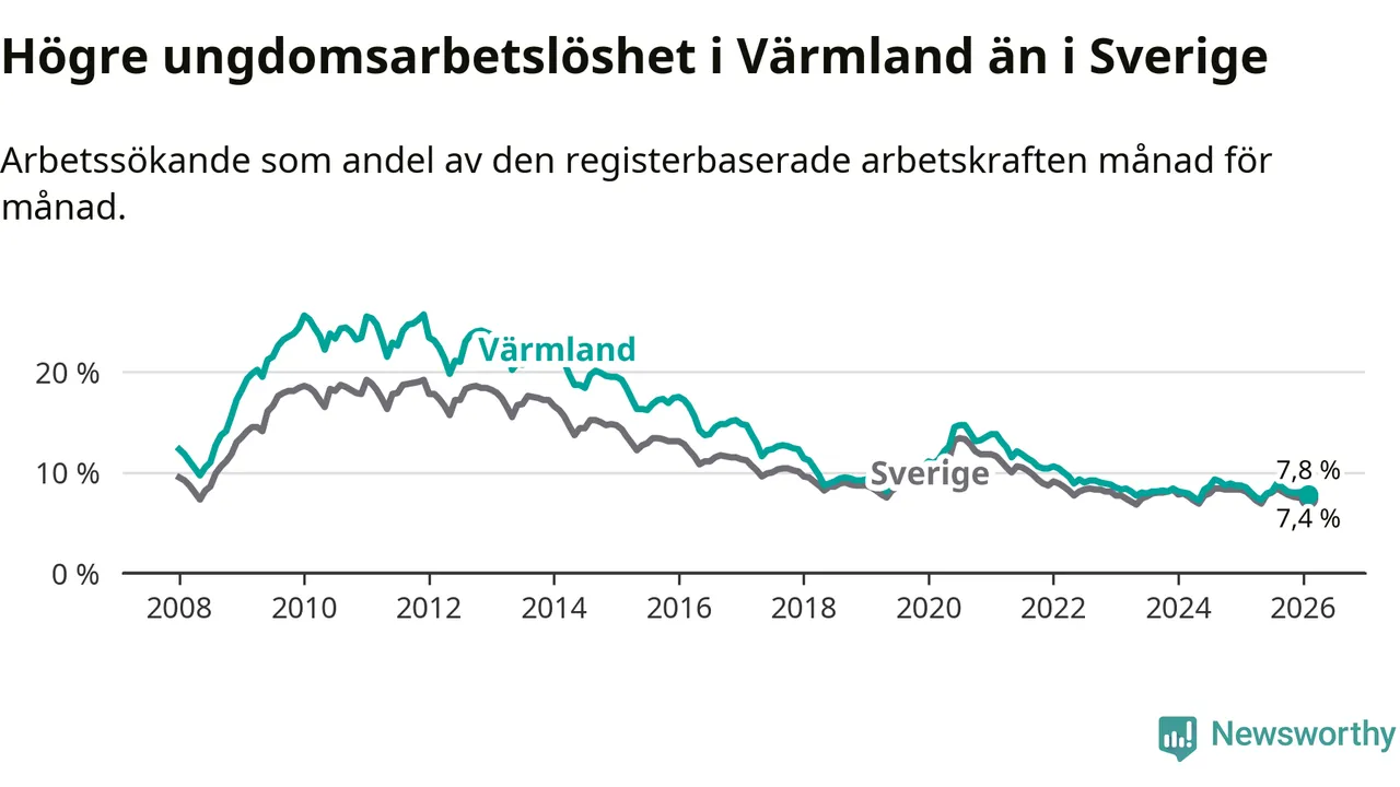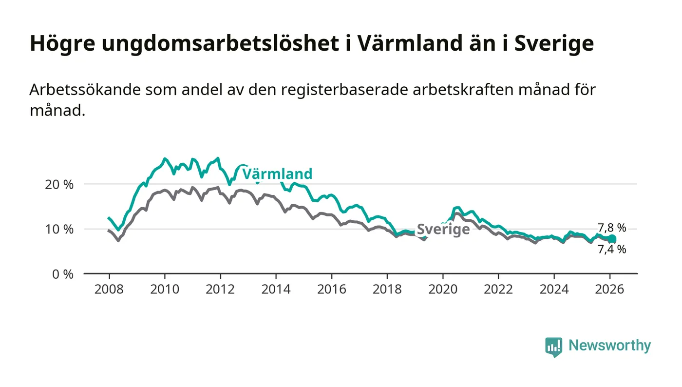 Medan Värmland har lägre total arbetslöshet än Sverige, ligger ungdomsarbetslösheten 0,4 procentenheter högre i Värmland.