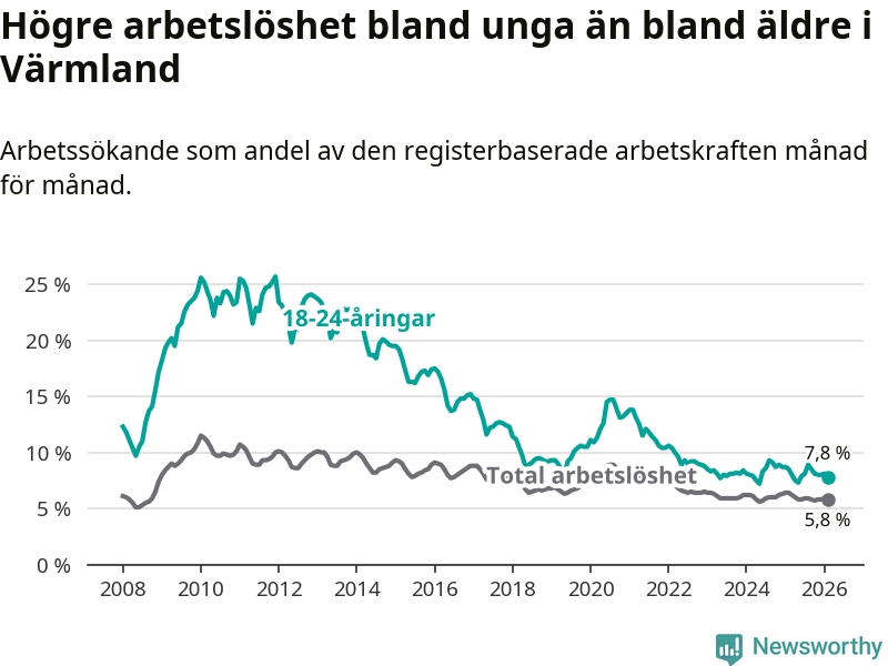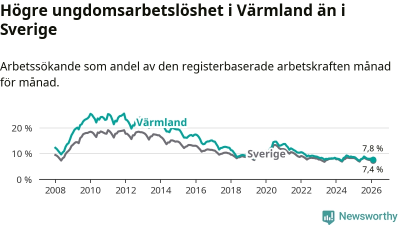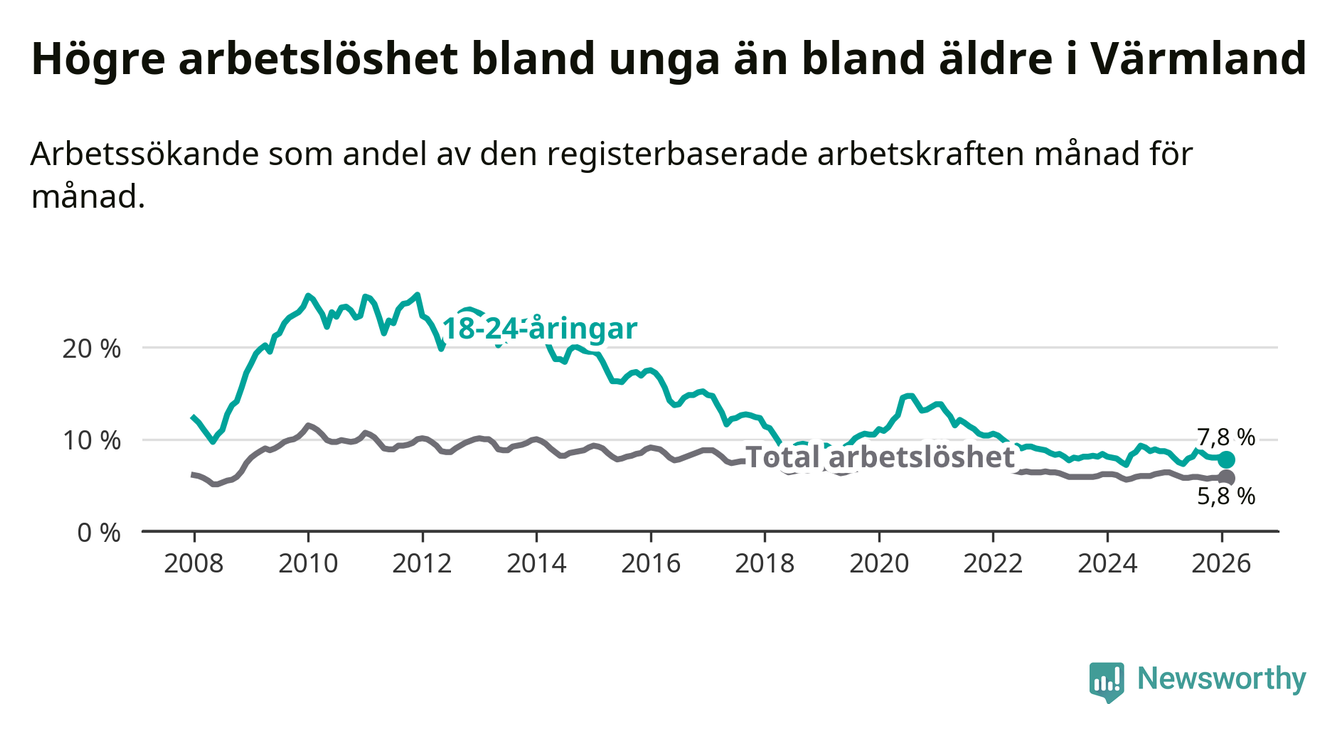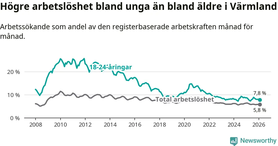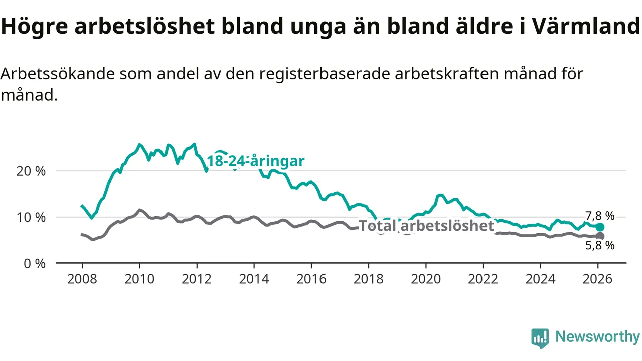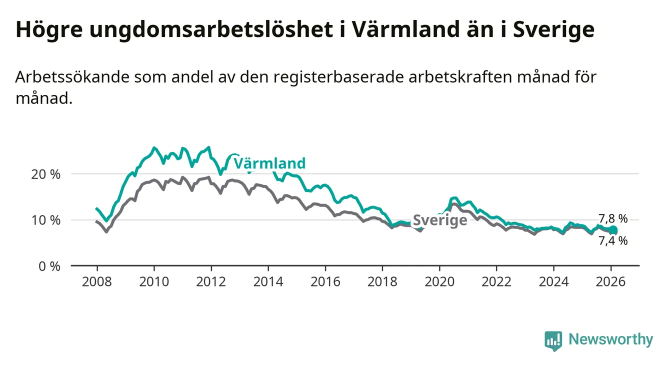 Medan Värmland har lägre total arbetslöshet än Sverige, ligger ungdomsarbetslösheten 0,4 procentenheter högre i Värmland.