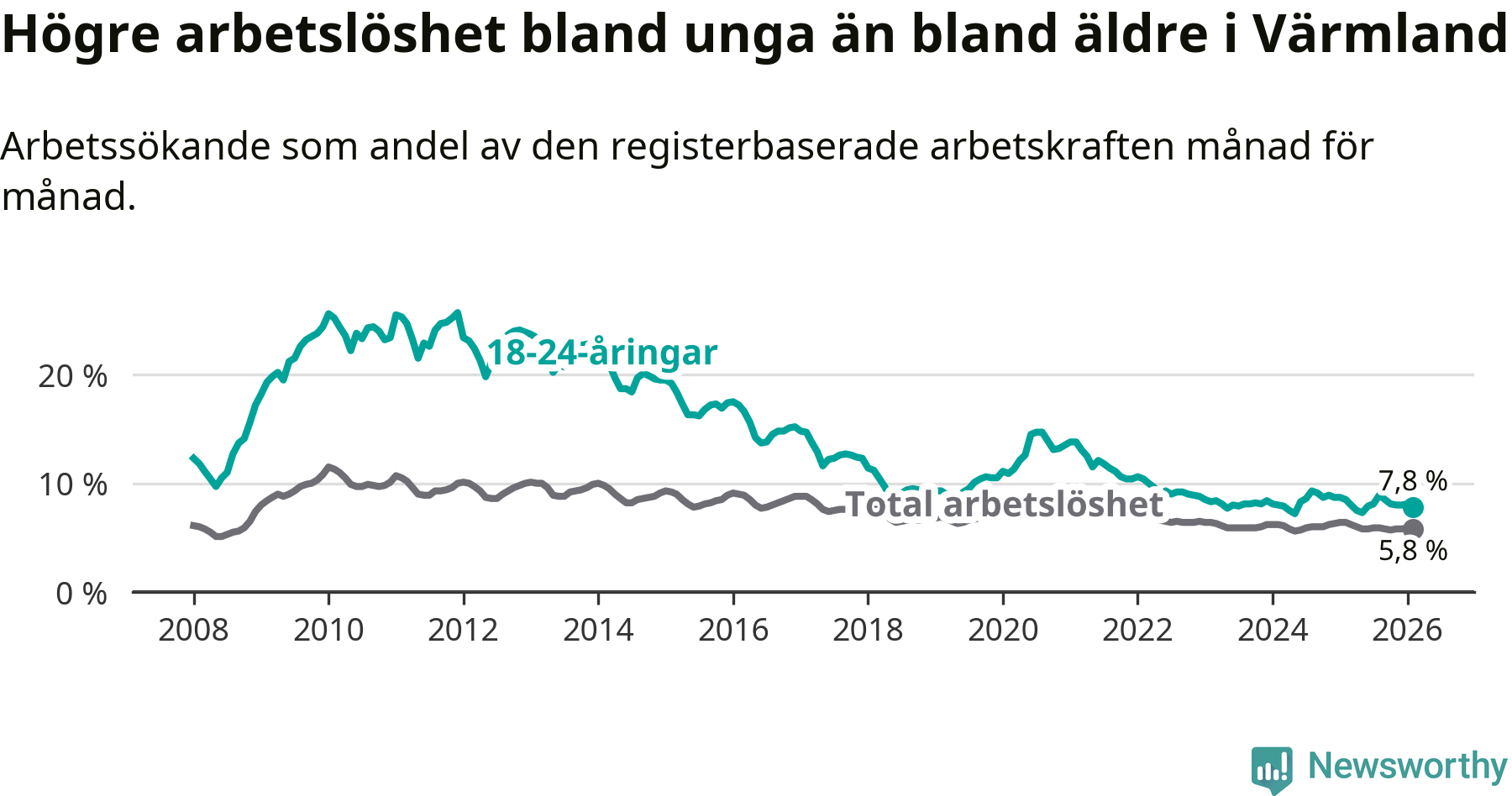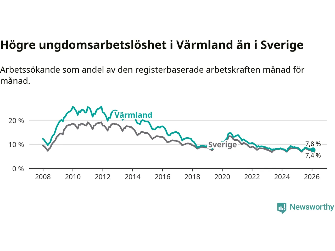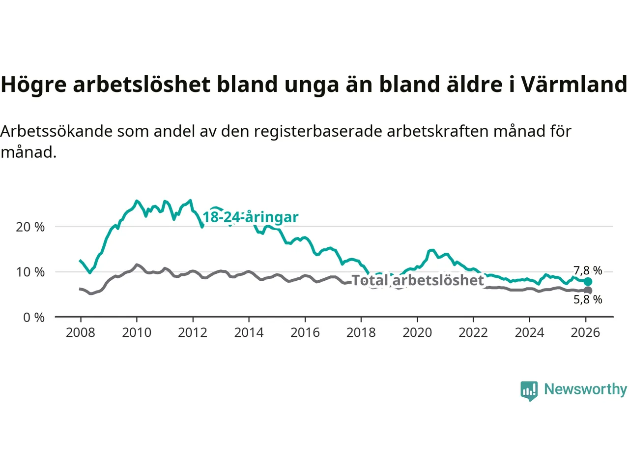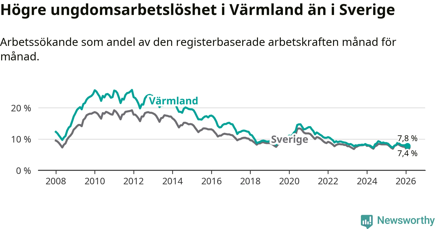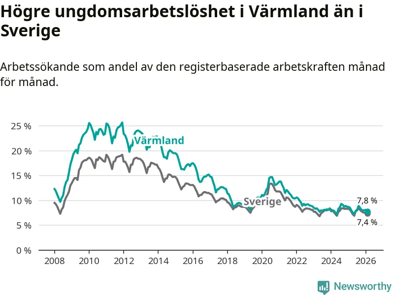 I och med den senaste månadens nedgång har de ungas arbetslöshet i Värmland sjunkit nio månader i följd (ner från 7,3 procent i maj 2025 till 7,8 procent nu).
