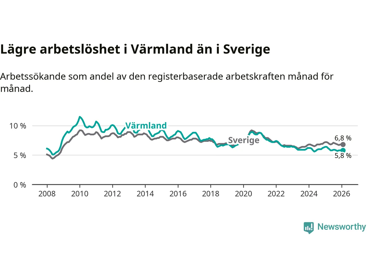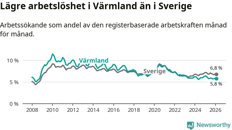 Värmland hade redan tidigare lägre arbetslöshet än snittet i hela Sverige och nu växer klyftan (5,8 procent i länet, jämfört med 6,8 procent i hela riket). Norrbotten har den lägsta arbetslösheten i riket (3,8 procent), medan Skåne har den högsta (8,8 procent). För att Värmland skulle komma ner i samma arbetslöshetsnivå som Norrbotten skulle 2 699 personer behöva sysselsättas.