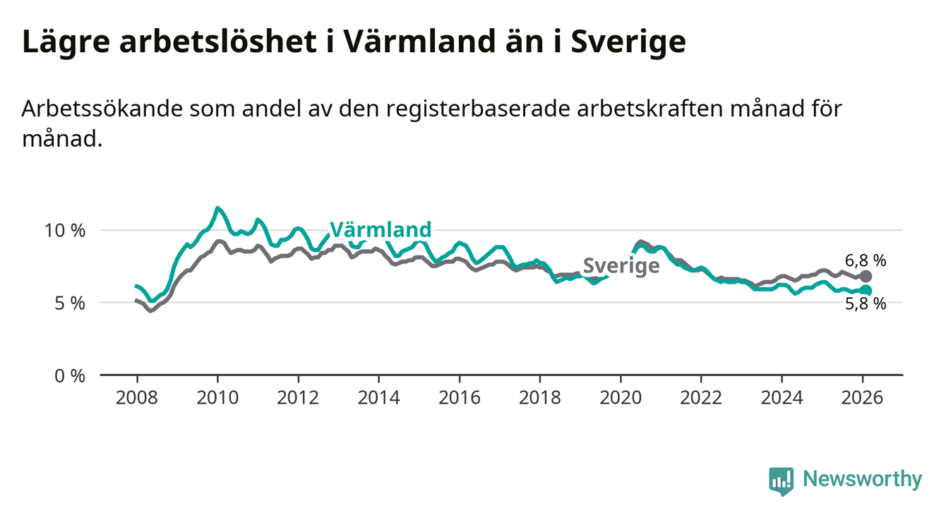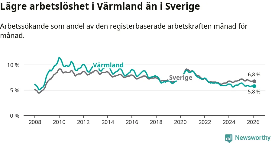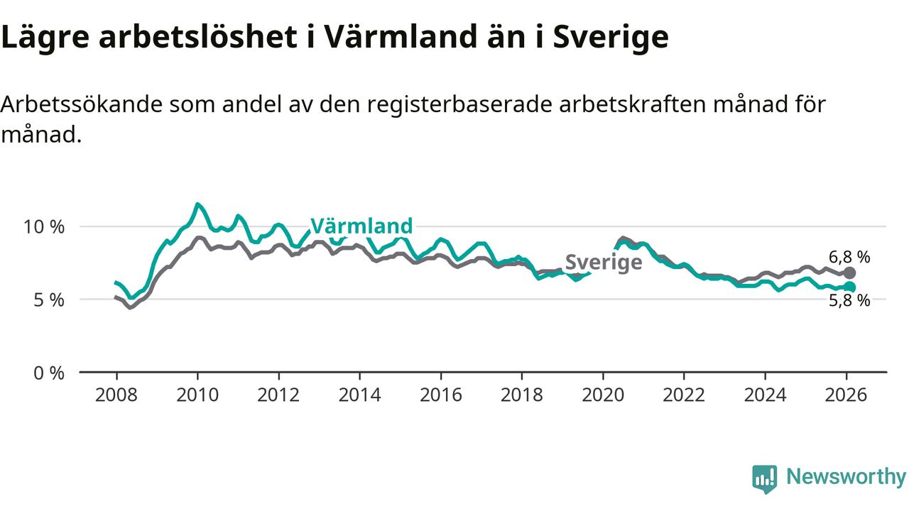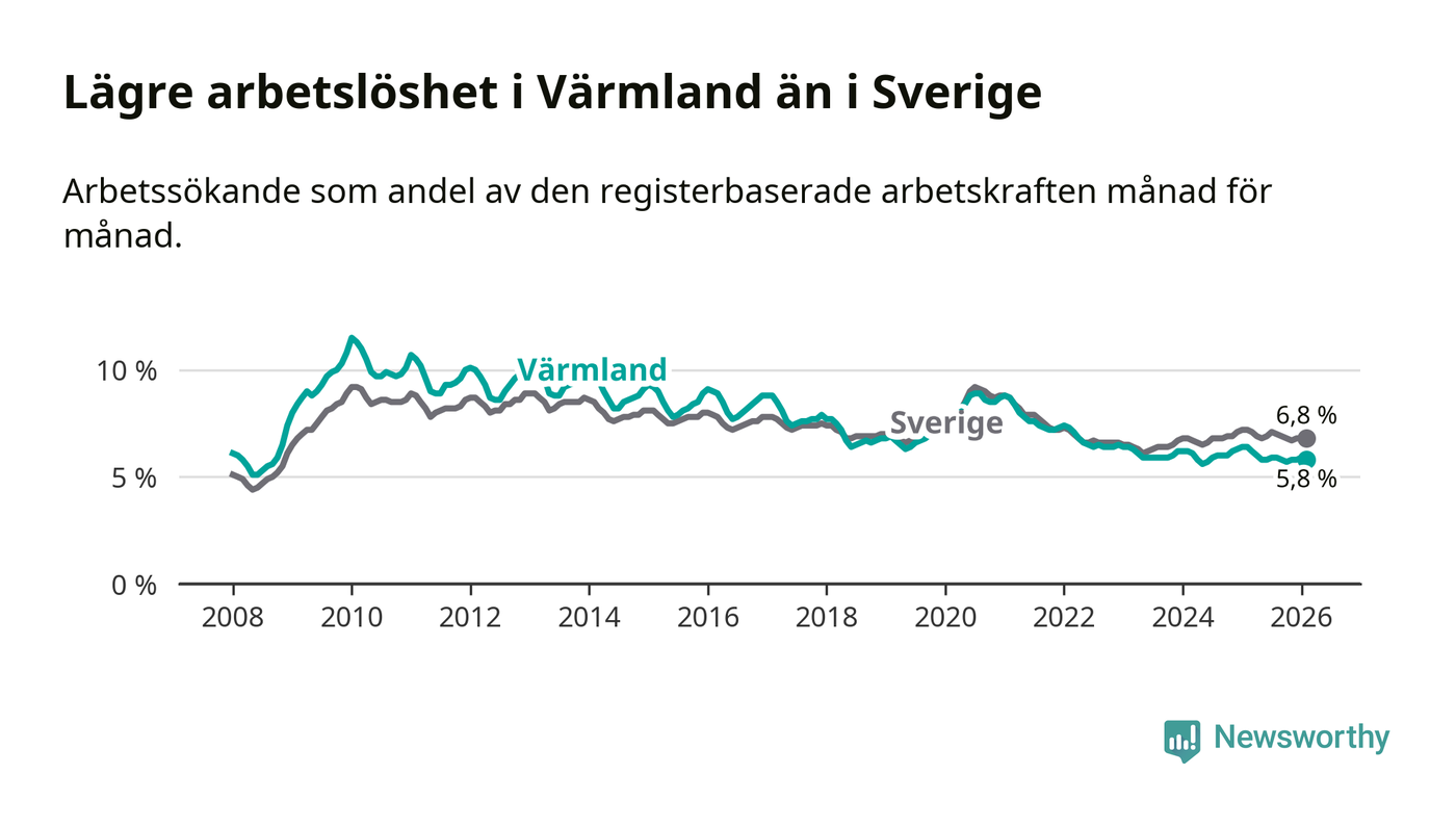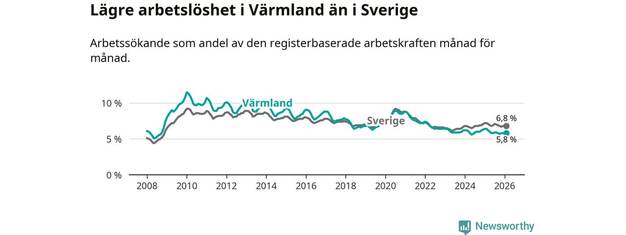 Under februari månad rapporterade Värmlands län en total arbetslöshet på 5,8 procent. Det är en minskning jämfört med samma tidpunkt i fjol (−0,6 procentenheter). Även i Sverige sjunker arbetslösheten .