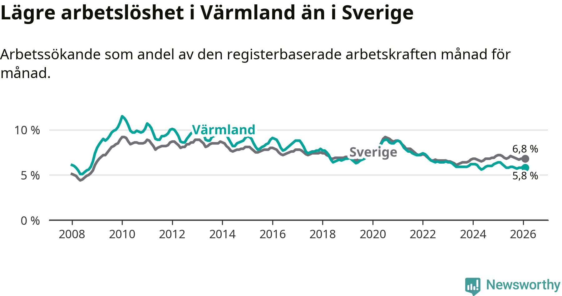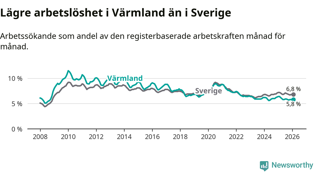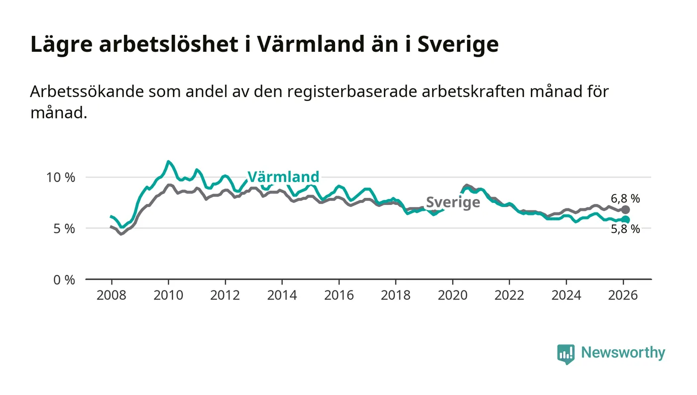 Under februari månad rapporterade Värmlands län en total arbetslöshet på 5,8 procent. Det är en minskning jämfört med samma tidpunkt i fjol (−0,6 procentenheter). Även i Sverige sjunker arbetslösheten .