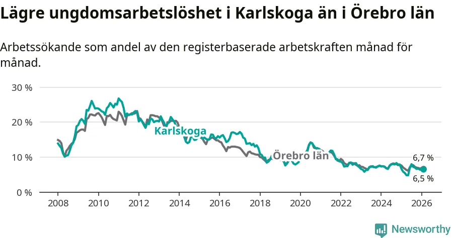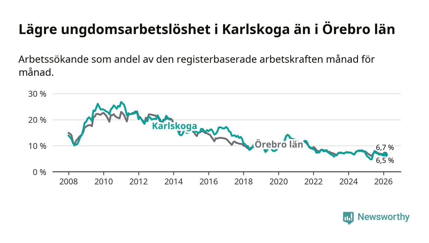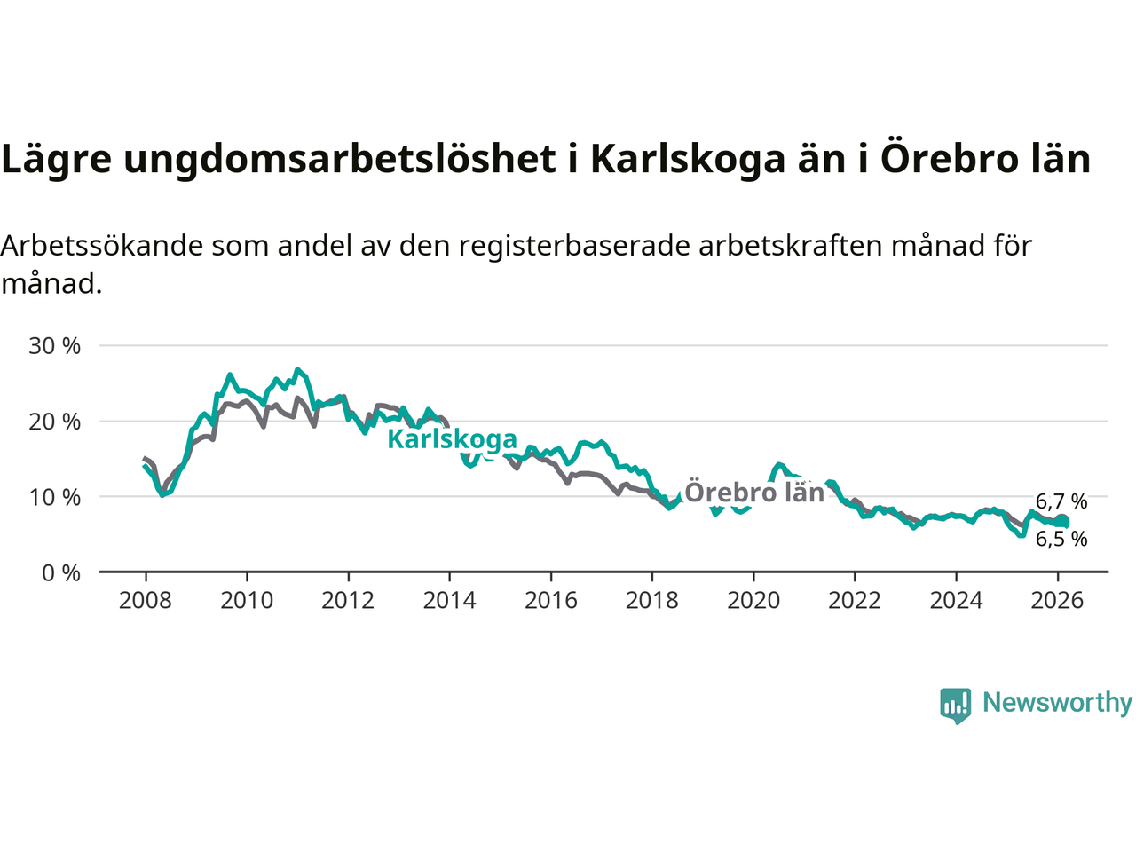 Precis som den totala arbetslösheten ligger ungdomsarbetslösheten i Karlskoga lägre än i Örebro som helhet. Skillnaden mellan kommunen och länet är 0,2 procentenheter.